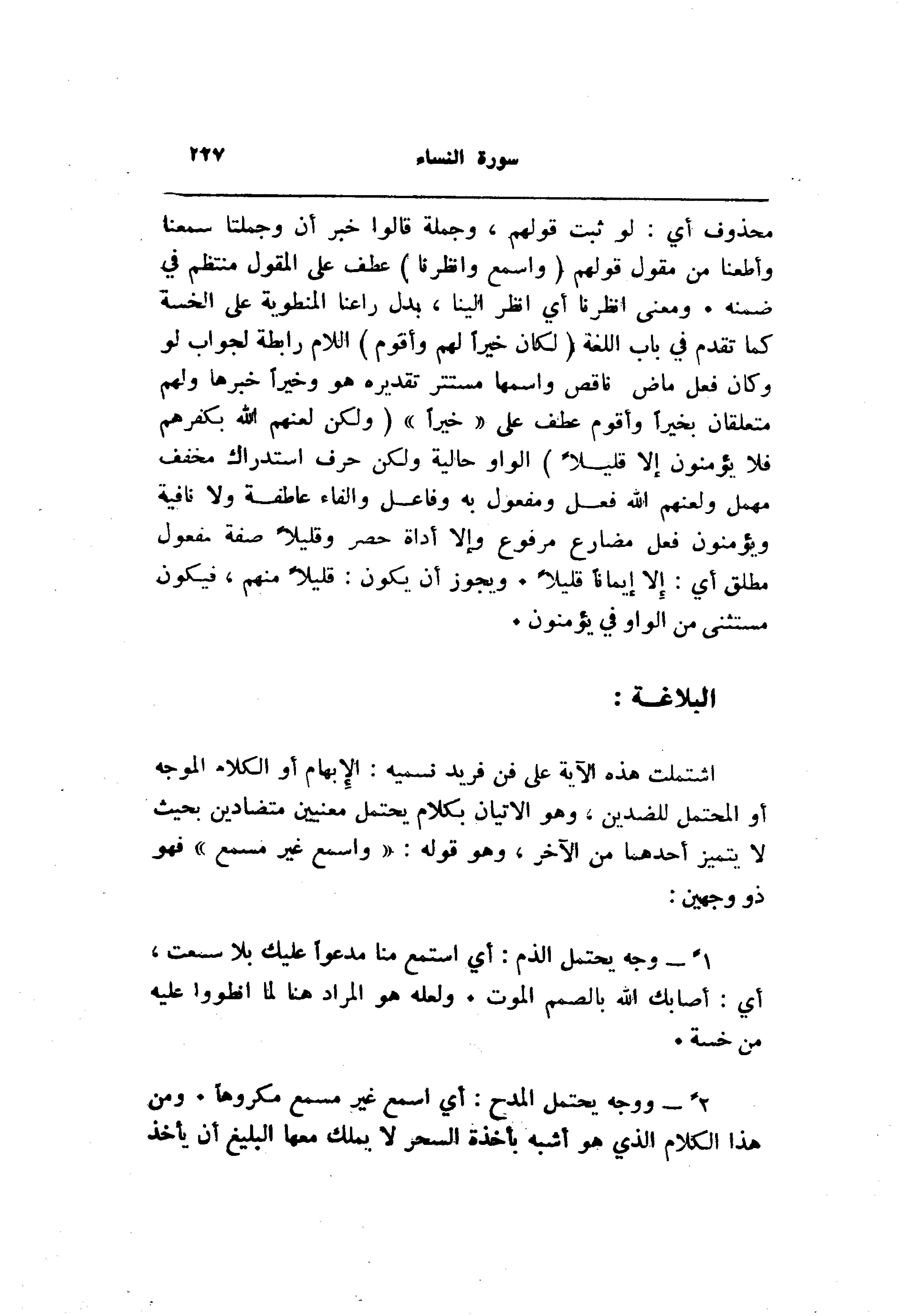 اشتملت هذه الآية على فن فريد نسميه: الإبهام أو الكلام الموجه أو المحتمل للضدين، وهو الإتيان بكلام يحتمل معنيين متضادين بحيث لا يتميز أحدهما من الآخر، وهو قوله: «واسمع غير مسمع» فهو ذو وجهين: