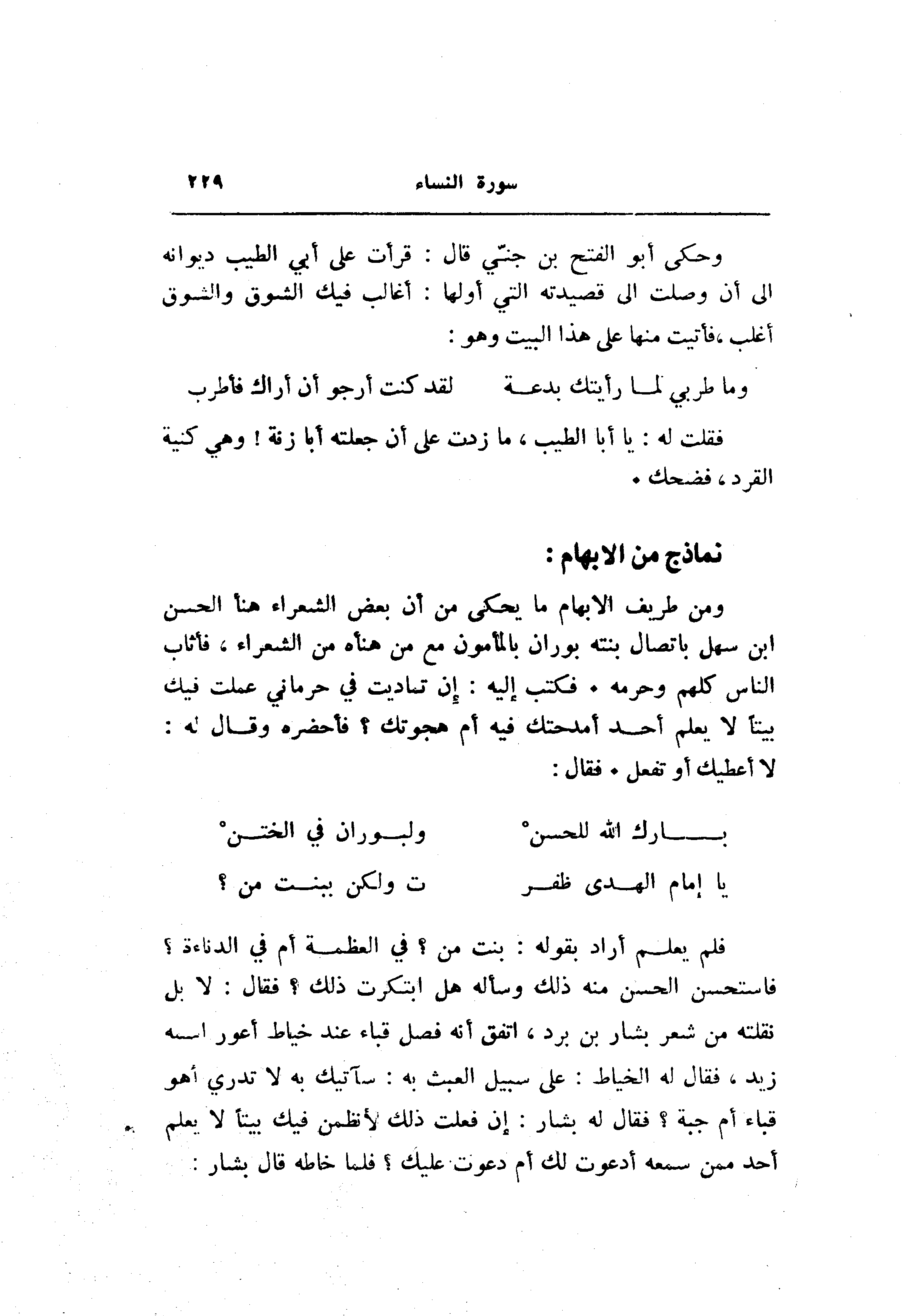 ومن طريف الإبهام ما يحكى من أن بعض الشعراء هنأ الحسن ابن سهل باتصال بنته بوران بالمأمون مع من هنأه من الشعراء، فأثاب الناس كلهم وحرمه. فكتب إليه: إن تماديت في حرماني عملت فيك بيتا لا يعلم أحد أمدحتك فيه أم هجوتك؟ فأحضره وقال له: