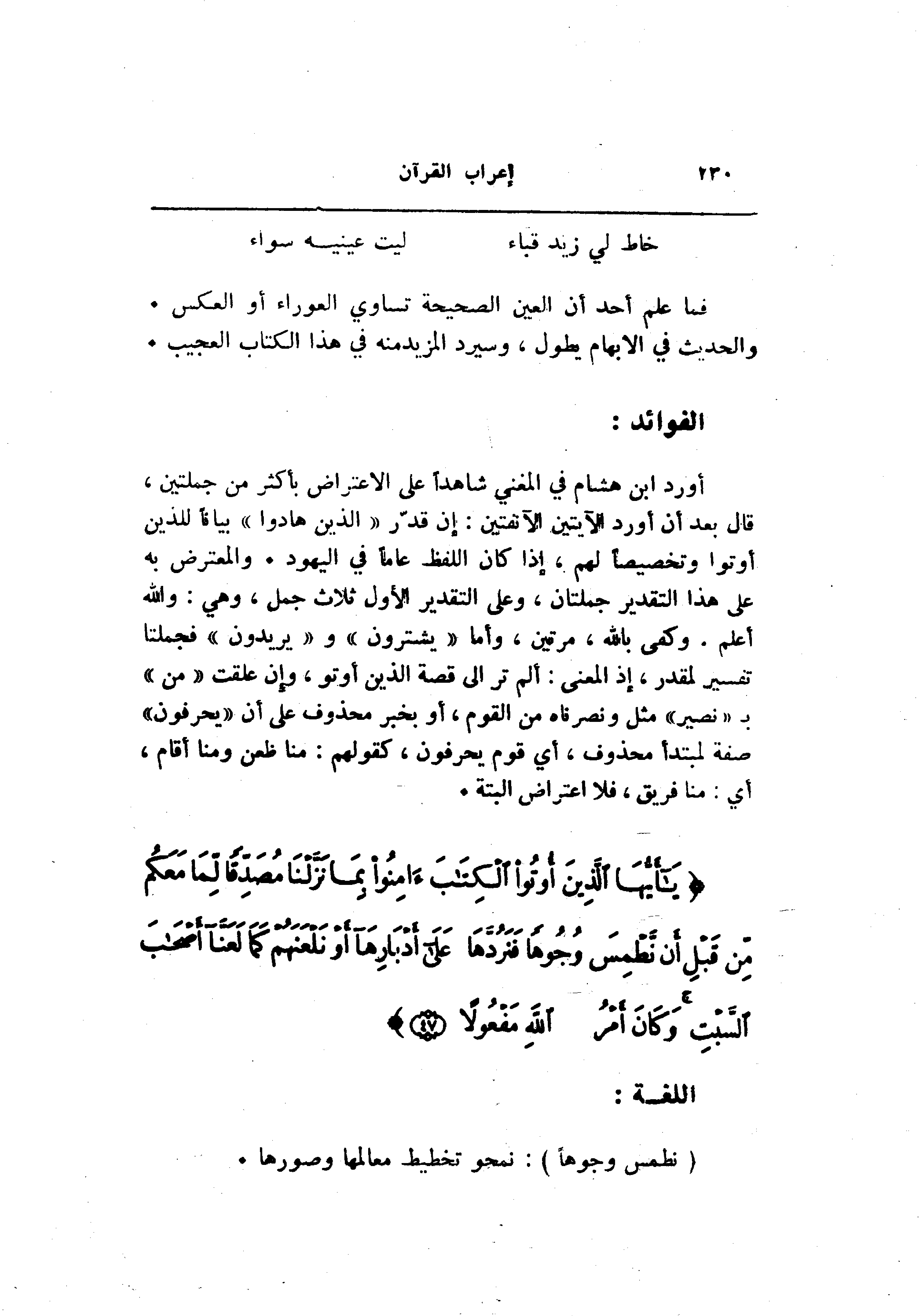 أورد ابن هشام في المغني شاهدا على الاعتراض بأكثر من جملتين، قال بعد أن أورد الآيتين الآنفتين: إن قدّر «الذين هادوا» بيانا للذين أوتوا وتخصيصا لهم، إذا كان اللفظ عاما في اليهود. والمعترض به على هذا التقدير جملتان، وعلى التقدير الأول ثلاث جمل، وهي: والله أعلم. وكفى بالله، مرتين، وأما «يشترون» و «يريدون» فجملتا تفسير لمقدر، إذ المعنى: ألم تر الى قصة الذين أوتو، وإن علقت «من» ب «نصير» مثل ونصرناه من القوم، أو بخبر محذوف على أن «يحرفون» صفة لمبتدأ محذوف، أي قوم يحرفون، كقولهم: منا ظعن ومنا أقام، أي: منا فريق، فلا اعتراض البتة.