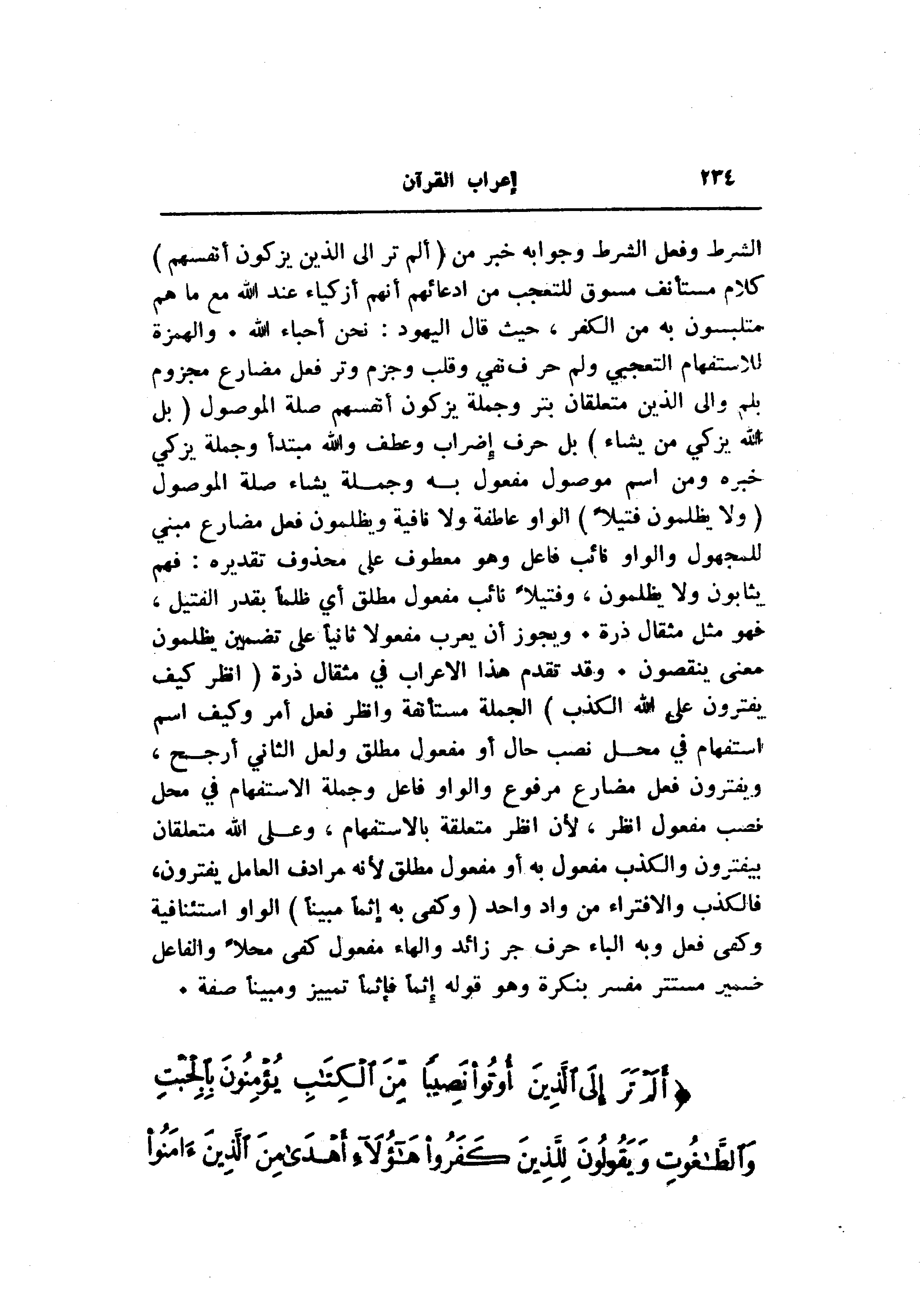 الشرط وفعل الشرط وجوابه خبر من (أَلَمْ تَرَ إِلَى الَّذِينَ يُزَكُّونَ أَنْفُسَهُمْ) كلام مستأنف مسوق للتعجب من ادعائهم أنهم أزكياء عند الله مع ما هم متلبسون به من الكفر، حيث قال اليهود: نحن أحباء الله. والهمزة للاستفهام التعجبي ولم حرف نفي وقلب وجزم وتر فعل مضارع مجزوم بلم والى الذين متعلقان بتر وجملة يزكون أنفسهم صلة الموصول (بَلِ اللَّهُ يُزَكِّي مَنْ يَشاءُ) بل حرف إضراب وعطف والله مبتدأ وجملة يزكي خبره ومن اسم موصول مفعول به وجملة يشاء صلة الموصول (وَلا يُظْلَمُونَ فَتِيلًا) الواو عاطفة ولا نافية ويظلمون فعل مضارع مبني للمجهول والواو نائب فاعل وهو معطوف على محذوف تقديره: فهم يثابون ولا يظلمون، وفتيلا نائب مفعول مطلق أي ظلما بقدر الفتيل، فهو مثل مثقال ذرة. ويجوز أن يعرب مفعولا ثانيا على تضمين يظلمون معنى ينقصون. وقد تقدم هذا الإعراب في مثقال ذرة (انْظُرْ كَيْفَ يَفْتَرُونَ عَلَى اللَّهِ الْكَذِبَ) الجملة مستأنفة وانظر فعل أمر وكيف اسم استفهام في محل نصب حال أو مفعول مطلق ولعل الثاني أرجح، ويفترون فعل مضارع مرفوع والواو فاعل وجملة الاستفهام في محل نصب مفعول انظر، لأن انظر متعلقة بالاستفهام، وعلى الله متعلقان بيفترون والكذب مفعول به أو مفعول مطلق لأنه مرادف العامل يفترون، فالكذب والافتراء من واد واحد (وَكَفى بِهِ إِثْماً مُبِيناً) الواو استئنافية وكفى فعل وبه الباء حرف جر زائد والهاء مفعول كفى محلا والفاعل ضمير مستتر مفسر بنكرة وهو قوله إثما فإثما تمييز ومبينا صفة.