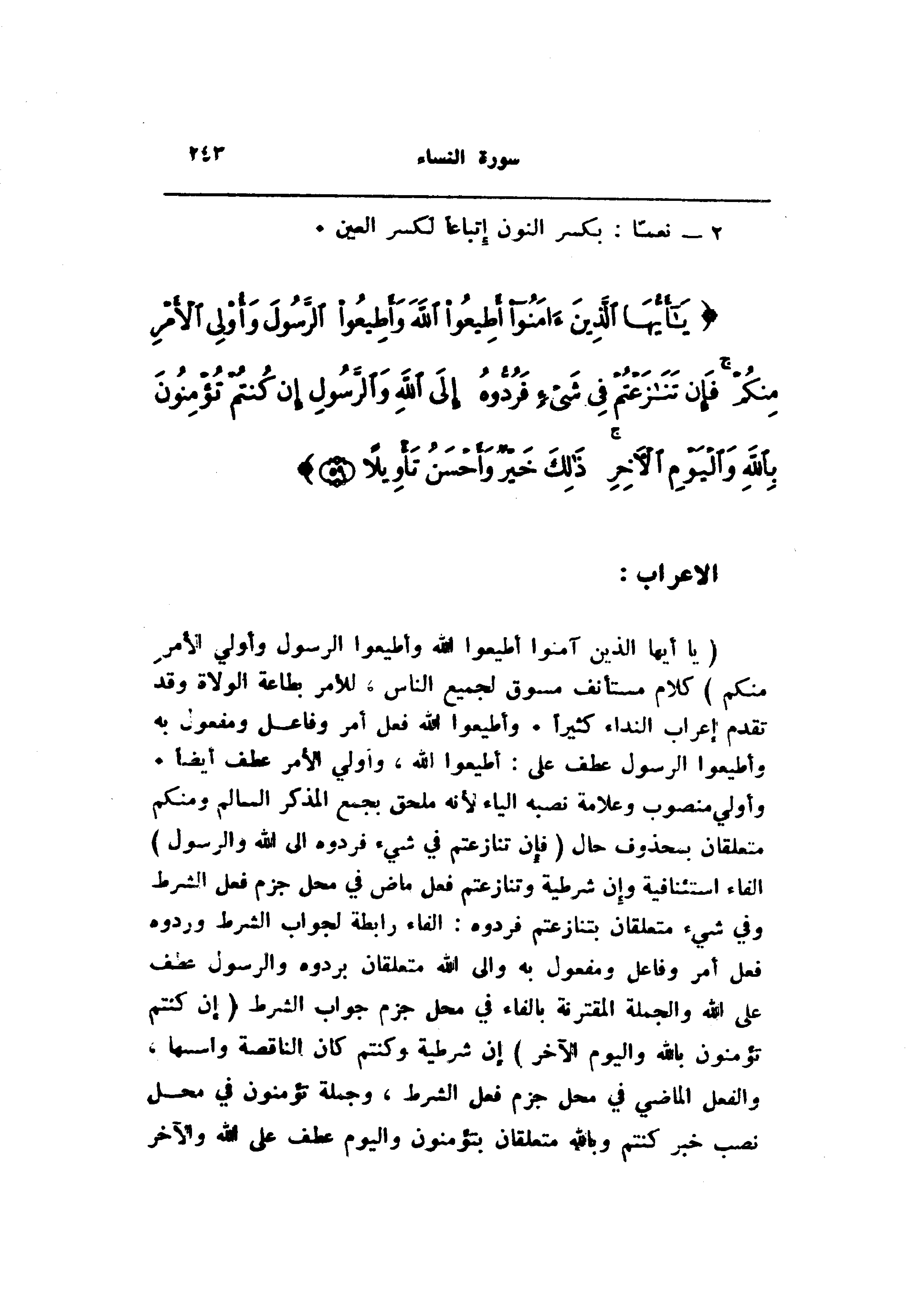 (يا أَيُّهَا الَّذِينَ آمَنُوا أَطِيعُوا اللَّهَ وَأَطِيعُوا الرَّسُولَ وَأُولِي الْأَمْرِ مِنْكُمْ) كلام مستأنف مسوق لجميع الناس، للأمر بطاعة الولاة وقد تقدم إعراب النداء كثيرا. وأطيعوا الله فعل أمر وفاعل ومفعول به وأطيعوا الرسول عطف على: أطيعوا الله، وأولي الأمر عطف أيضا.