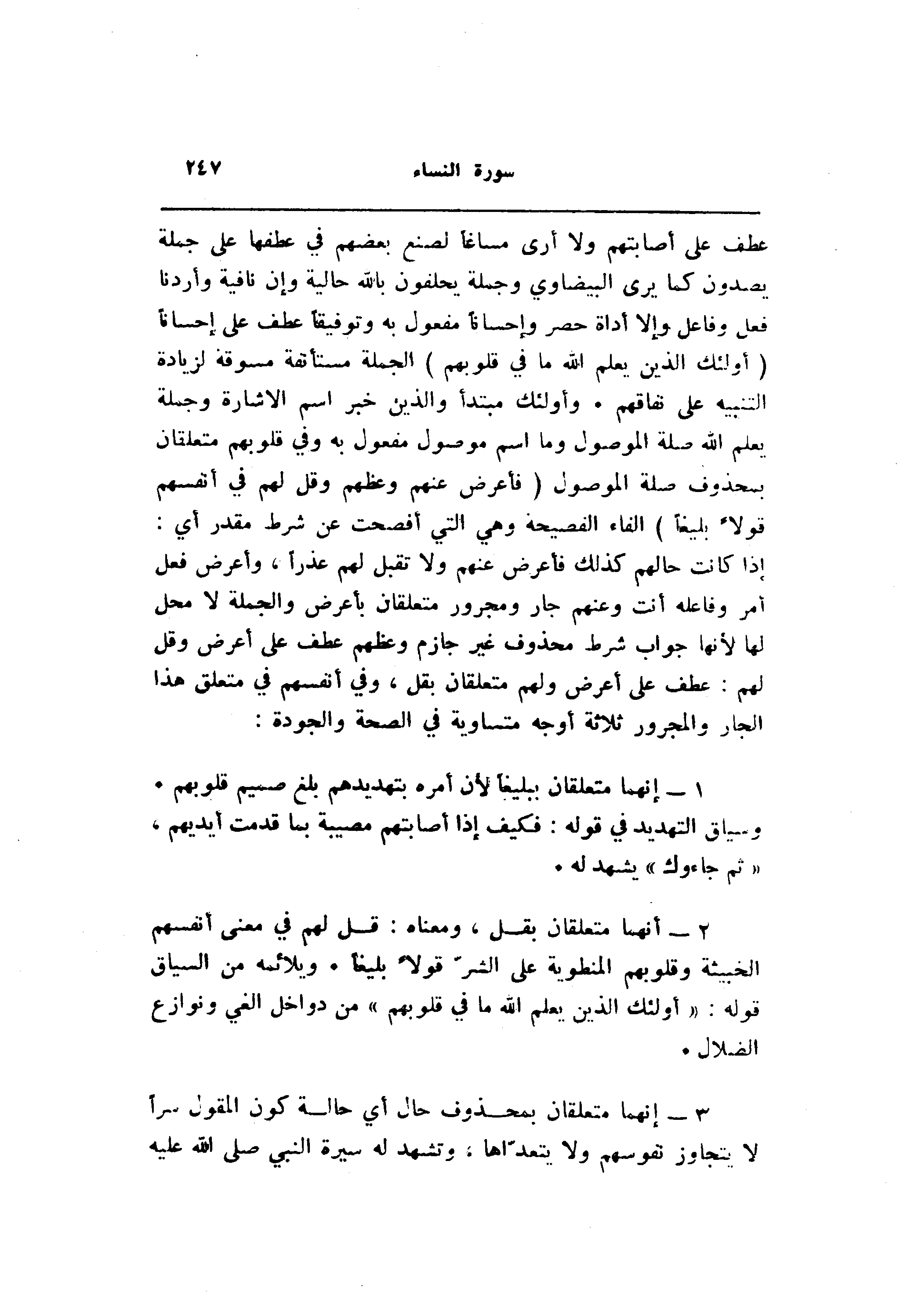2- أنهما متعلقان بقل، ومعناه: قل لهم في معنى أنفسهم الخبيثة وقلوبهم المنطوية على الشرّ قولا بليغا. ويلائمه من السياق قوله: «أولئك الذين يعلم الله ما في قلوبهم» من دواخل الغي ونوازع الضلال.