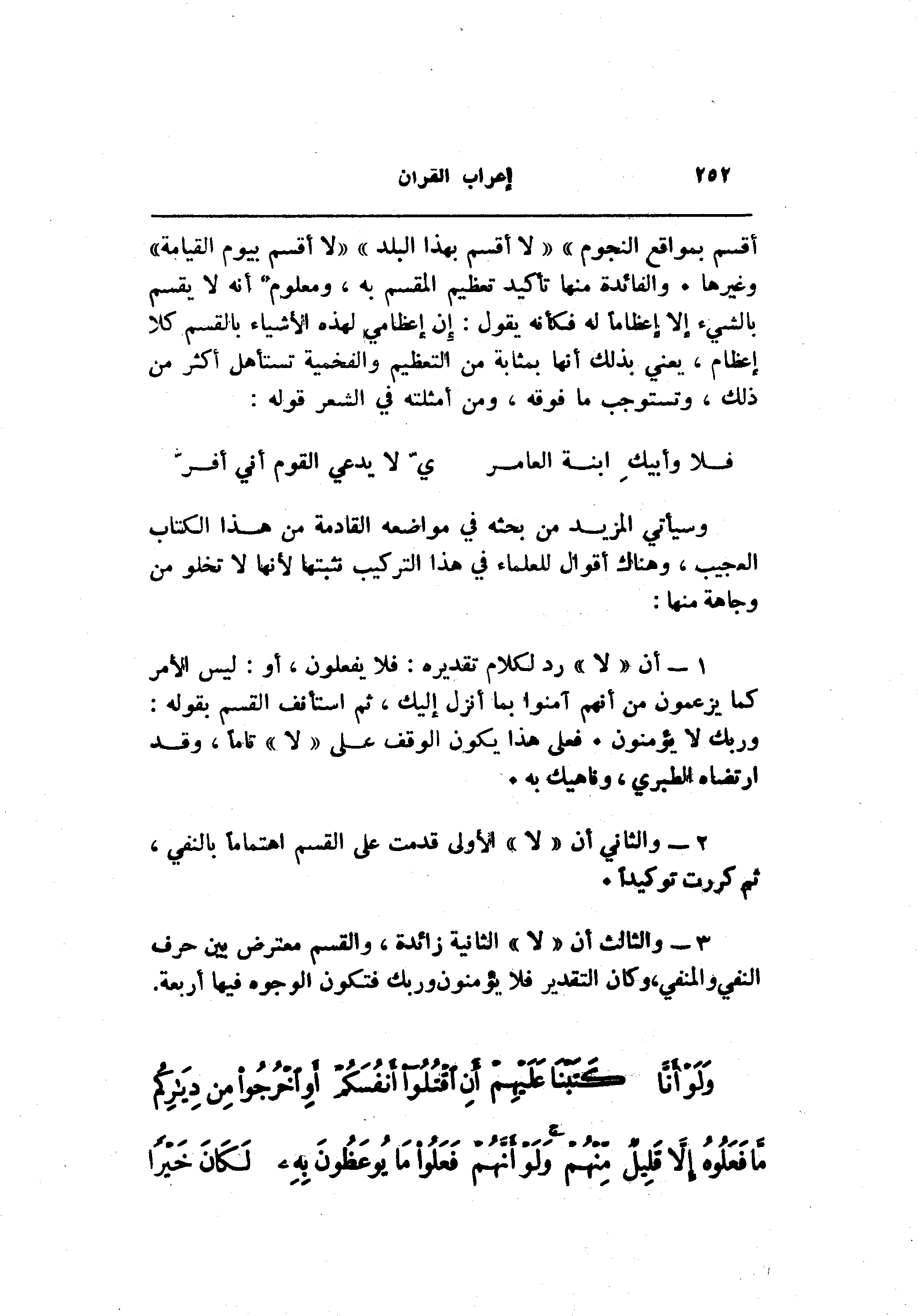 3- والثالث أن «لا» الثانية زائدة، والقسم معترض بين حرف النفي والمنفي، وكان التقدير فلا يؤمنون وربك فتكون الوجوه فيها أربعة.