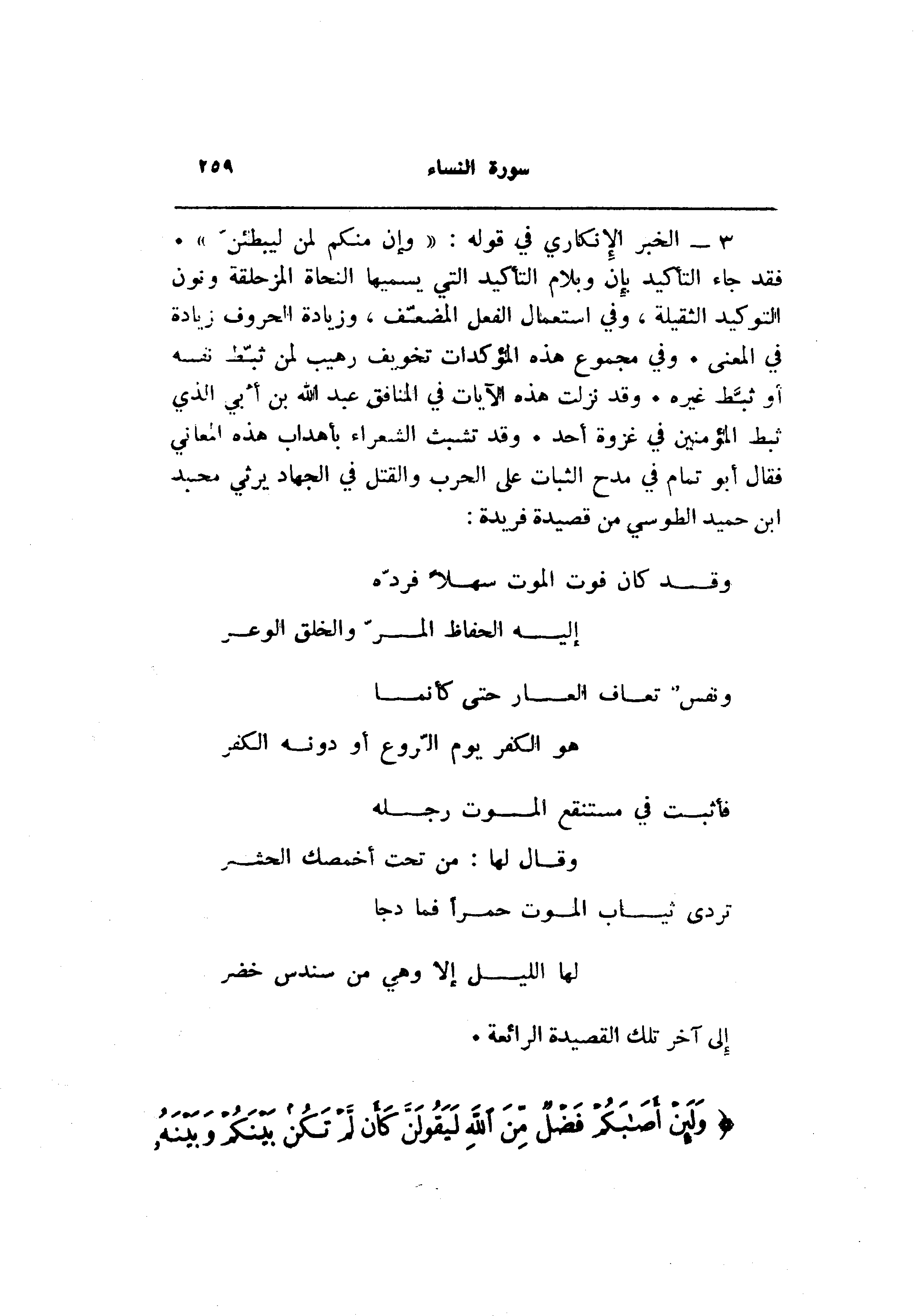 فقد جاء التأكيد بإن وبلام التأكيد التي يسميها النحاة المزحلقة ونون التوكيد الثقيلة، وفي استعمال الفعل المضعّف، وزيادة الحروف زيادة في المعنى. وفي مجموع هذه المؤكدات تخويف رهيب لمن ثبّط نفسه أو ثبّط غيره. وقد نزلت هذه الآيات في المنافق عبد الله بن أبي الذي ثبط المؤمنين في غزوة أحد. وقد تشبث الشعراء بأهداب هذه المعاني فقال أبو تمام في مدح الثبات على الحرب والقتل في الجهاد يرثي محمد ابن حميد الطوسي من قصيدة فريدة: