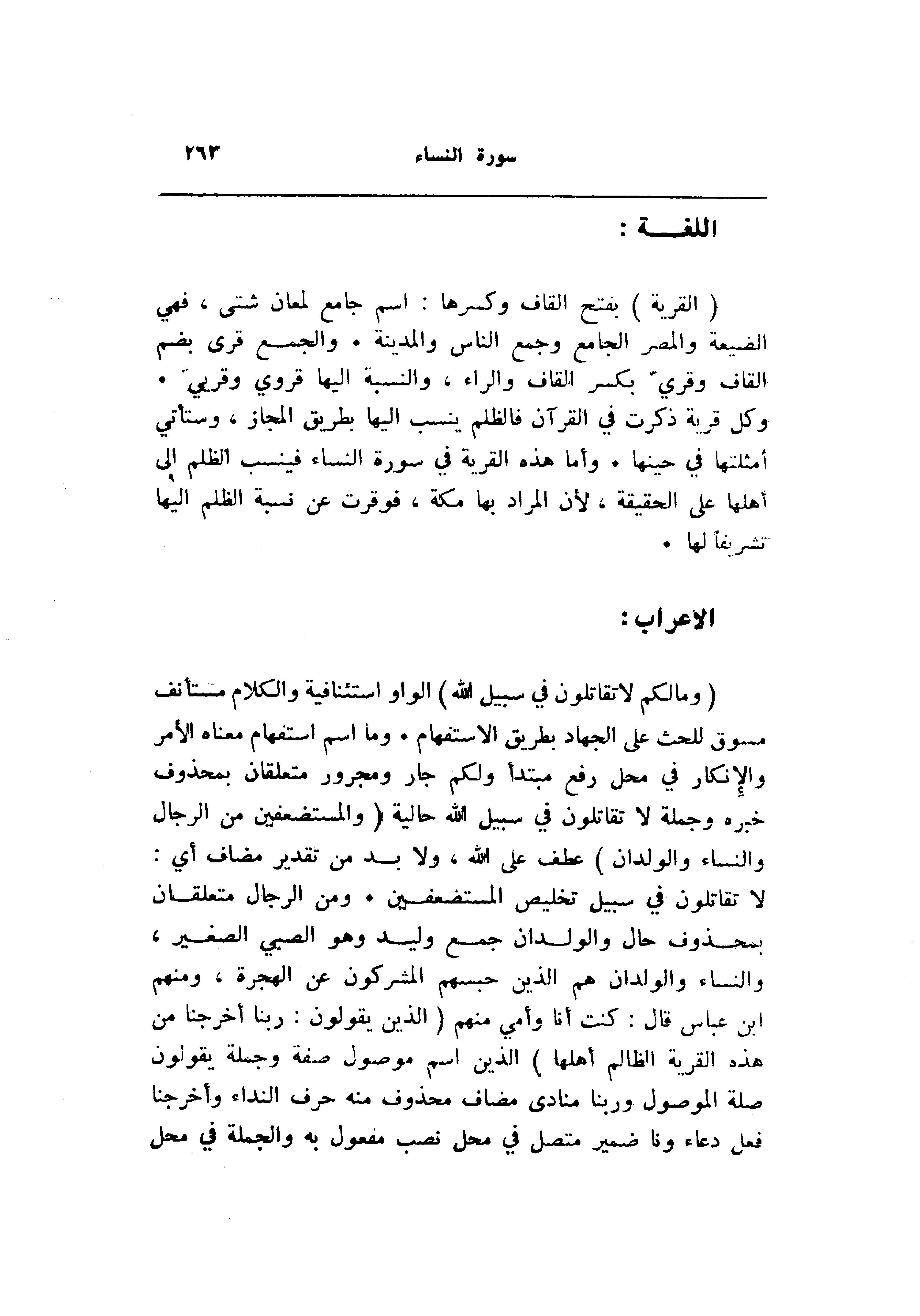 لا تقاتلون في سبيل تخليص المستضعفين. ومن الرجال متعلقان بمحذوف حال والولدان جمع وليد وهو الصبي الصغير، والنساء والولدان هم الذين حبسهم المشركون عن الهجرة، ومنهم ابن عباس قال: كنت أنا وأمي منهم (الَّذِينَ يَقُولُونَ: رَبَّنا أَخْرِجْنا مِنْ هذِهِ الْقَرْيَةِ الظَّالِمِ أَهْلُها) الذين اسم موصول صفة وجملة يقولون صلة الموصول وربنا منادى مضاف محذوف منه حرف النداء وأخرجنا فعل دعاء ونا ضمير متصل في محل نصب مفعول به والجملة في محل