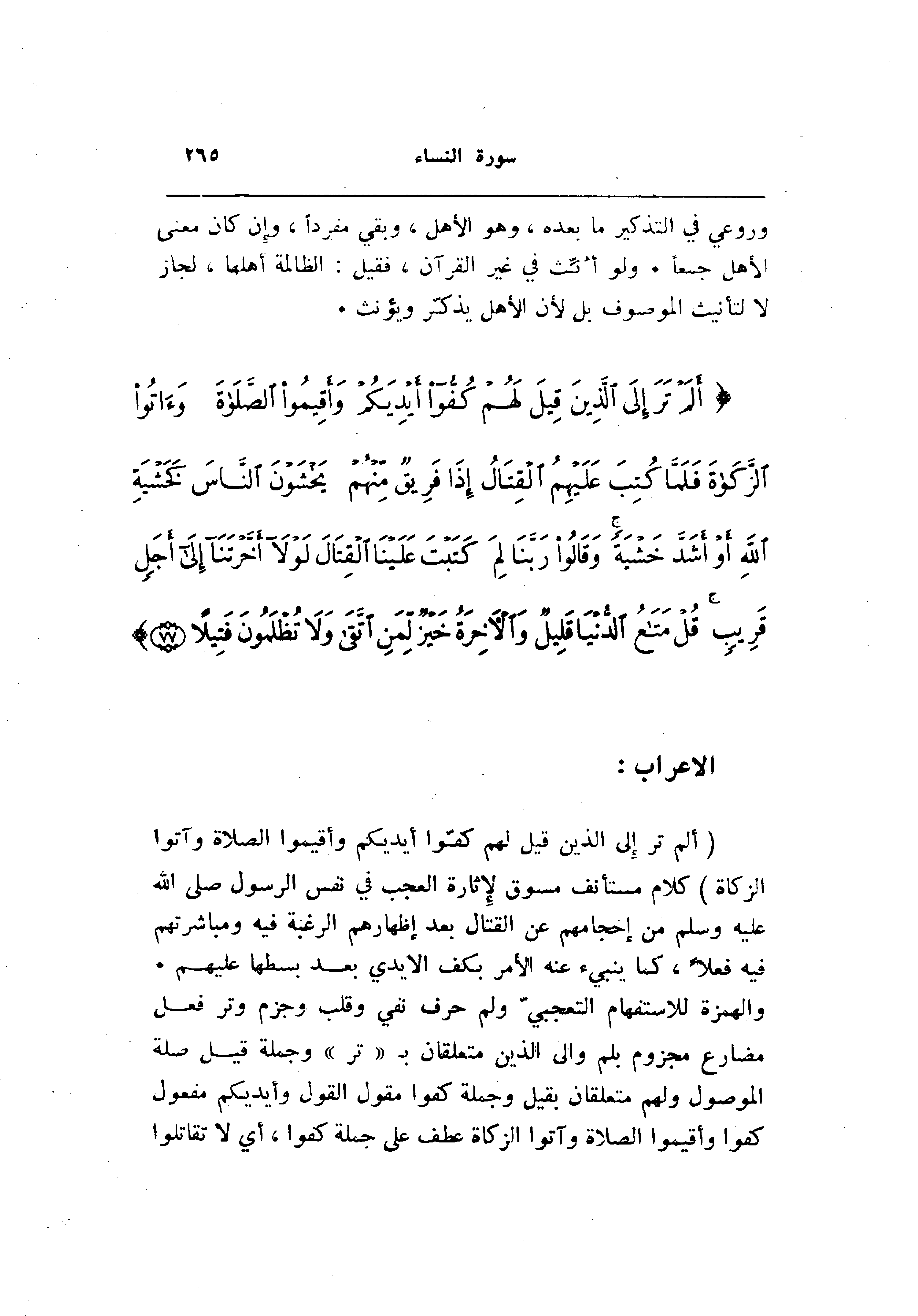 والهمزة للاستفهام التعجبيّ ولم حرف نفي وقلب وجزم وتر فعل مضارع مجزوم بلم والى الذين متعلقان ب «تر» وجملة قيل صلة الموصول ولهم متعلقان بقيل وجملة كفوا مقول القول وأيديكم مفعول كفوا وأقيموا الصلاة وآتوا الزكاة عطف على جملة كفوا، أي لا تقاتلوا