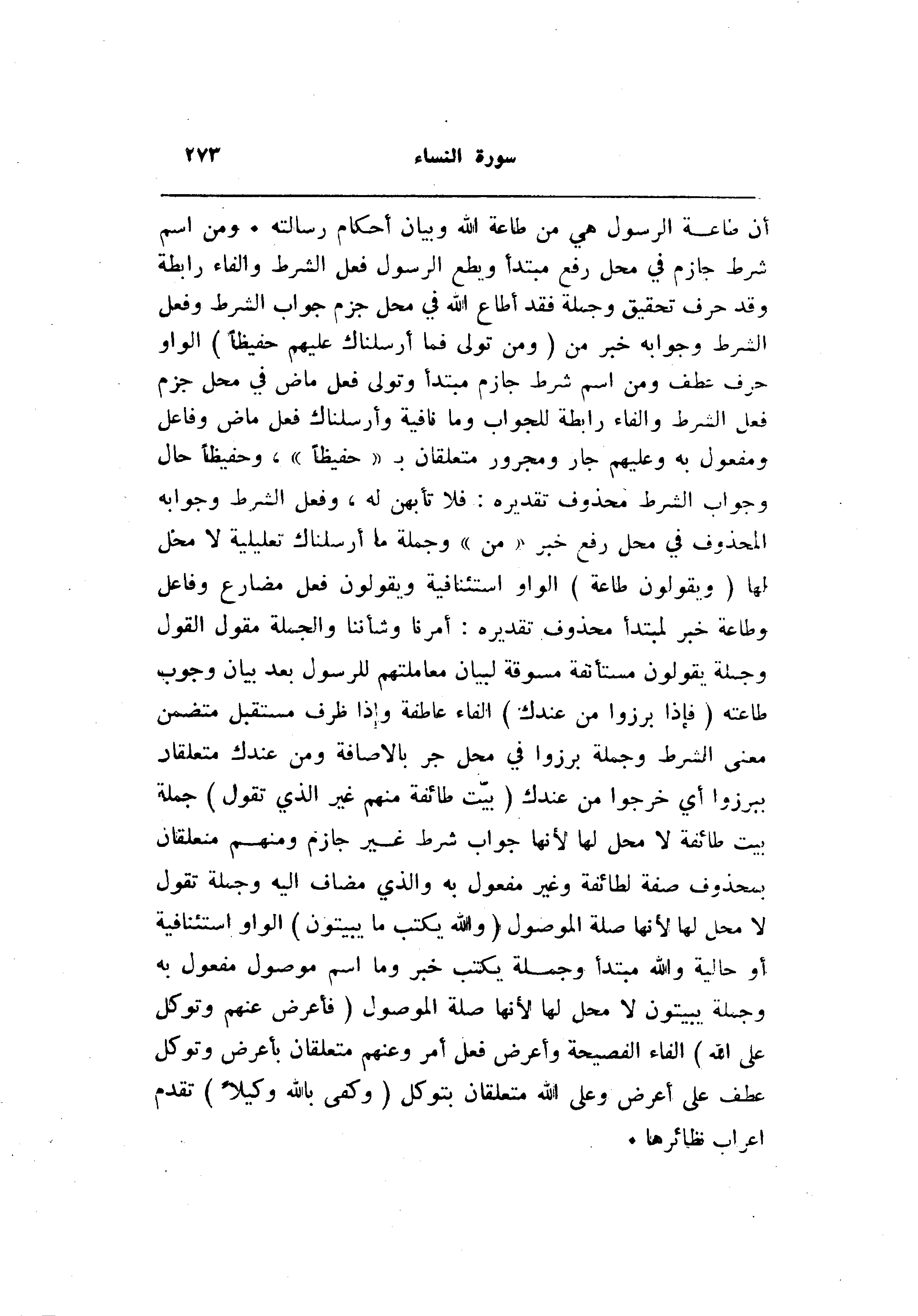 أن طاعة الرسول هي من طاعة الله وبيان أحكام رسالته. ومن اسم شرط جازم في محل رفع مبتدأ ويطع الرسول فعل الشرط والفاء رابطة وقد حرف تحقيق وجملة فقد أطاع الله في محل جزم جواب الشرط وفعل الشرط وجوابه خبر من (وَمَنْ تَوَلَّى فَما أَرْسَلْناكَ عَلَيْهِمْ حَفِيظاً) الواو حرف عطف ومن اسم شرط جازم مبتدأ وتولى فعل ماض في محل جزم فعل الشرط والفاء رابطة للجواب وما نافية وأرسلناك فعل ماض وفاعل ومفعول به وعليهم جار ومجرور متعلقان ب «حفيظا» ، وحفيظا حال وجواب الشرط محذوف تقديره: فلا تأبهن له، وفعل الشرط وجوابه المحذوف في محل رفع خبر «من» وجملة ما أرسلناك تعليلية لا محل لها (وَيَقُولُونَ طاعَةٌ) الواو استئنافية ويقولون فعل مضارع وفاعل وطاعة خبر لمبتدأ محذوف تقديره: أمرنا وشأننا والجملة مقول القول وجملة يقولون مستأنفة مسوقة لبيان معاملتهم للرسول بعد بيان وجوب طاعته (فَإِذا بَرَزُوا مِنْ عِنْدِكَ) الفاء عاطفة وإذا ظرف مستقبل متضمن معنى الشرط وجملة برزوا في محل جر بالاضافة ومن عندك متعلقان ببرزوا أي خرجوا من عندك (بَيَّتَ طائِفَةٌ مِنْهُمْ غَيْرَ الَّذِي تَقُولُ) جملة بيت طائفة لا محل لها لأنها جواب شرط غير جازم ومنهم متعلقان بمحذوف صفة لطائفة وغير مفعول به والذي مضاف اليه وجملة تقول لا محل لها لأنها صلة الموصول (وَاللَّهُ يَكْتُبُ ما يُبَيِّتُونَ) الواو استئنافية أو حالية والله مبتدأ وجملة يكتب خبر وما اسم موصول مفعول به وجملة يبيتون لا محل لها لأنها صلة الموصول (فَأَعْرِضْ عَنْهُمْ وَتَوَكَّلْ عَلَى اللَّهِ) الفاء الفصيحة وأعرض فعل أمر وعنهم متعلقان بأعرض وتوكل عطف على أعرض وعلى الله متعلقان بتوكل (وَكَفى بِاللَّهِ وَكِيلًا) تقدم اعراب نظائرها.