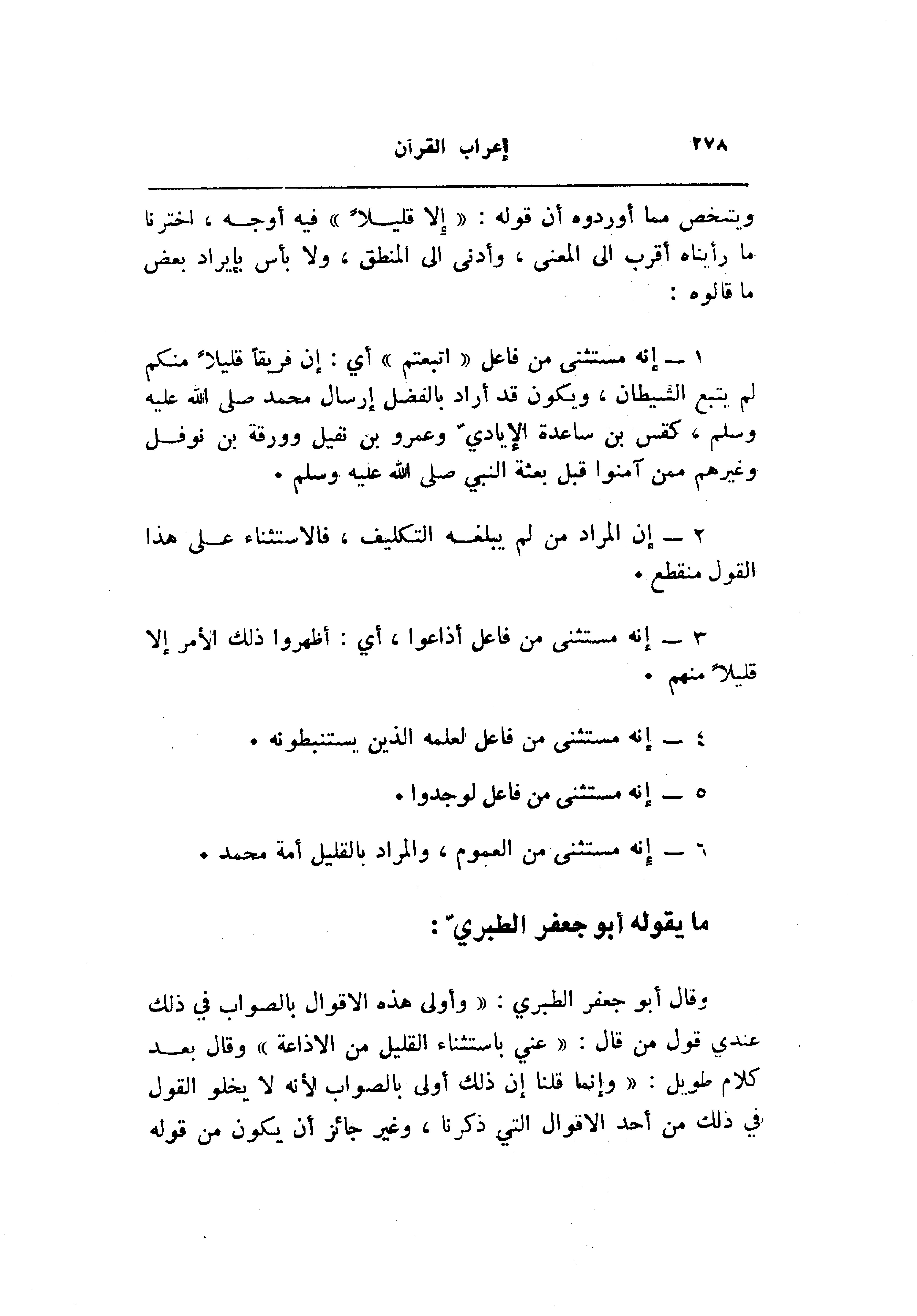 1- إنه مستثنى من فاعل «اتبعتم» أي: إن فريقا قليلا منكم لم يتبع الشيطان، ويكون قد أراد بالفضل إرسال محمد صلى الله عليه وسلم، كقس بن ساعدة الإياديّ وعمرو بن نفيل وورقة بن نوفل وغيرهم ممن آمنوا قبل بعثة النبي صلى الله عليه وسلم.