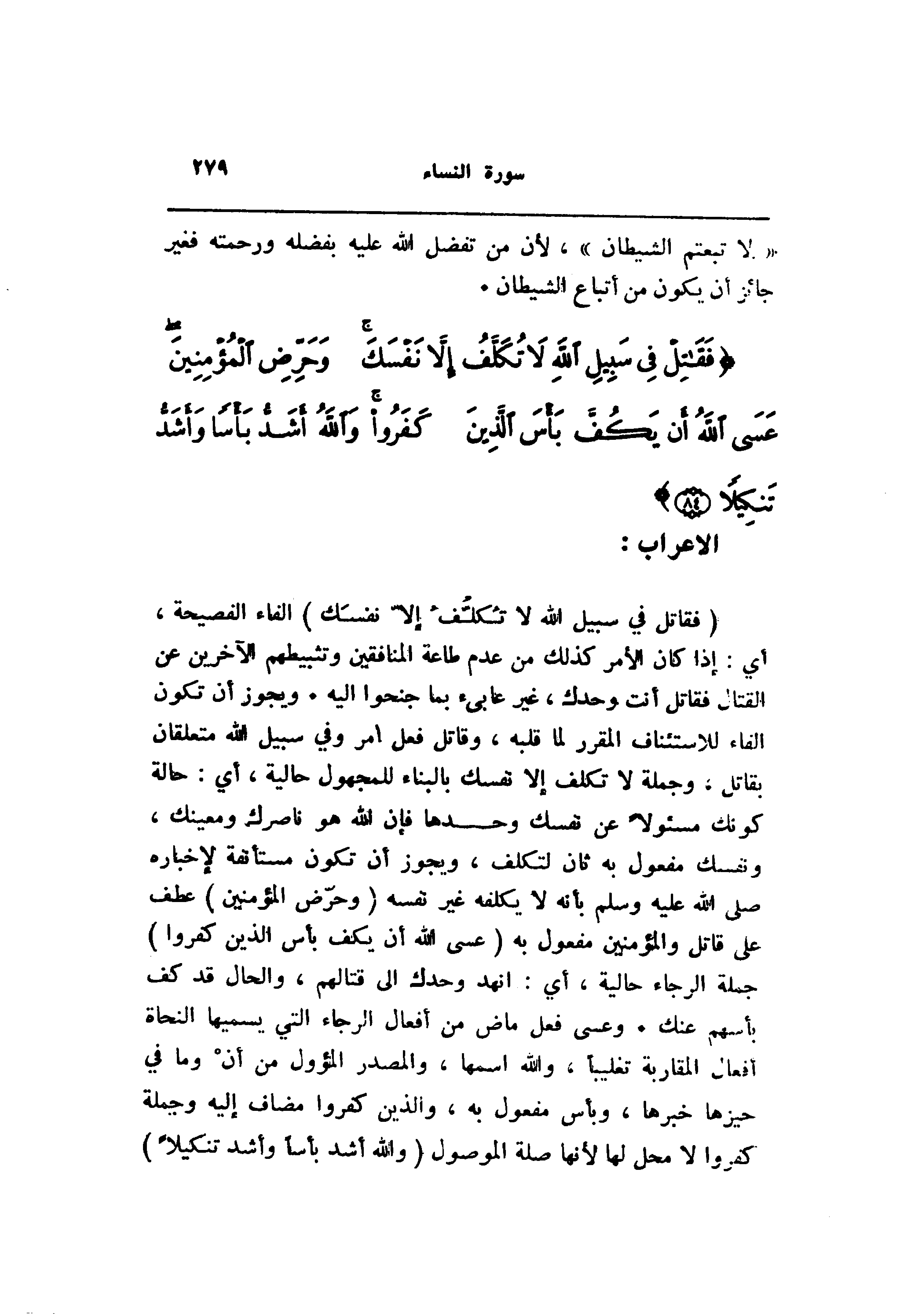 (فَقاتِلْ فِي سَبِيلِ اللَّهِ لا تُكَلَّفُ إِلَّا نَفْسَكَ) الفاء الفصيحة، أي: إذا كان الأمر كذلك من عدم طاعة المنافقين وتثبيطهم الآخرين عن القتال فقاتل أنت وحدك، غير عابىء بما جنحوا اليه. ويجوز أن تكون الفاء للاستئناف المقرر لما قلبه، وقاتل فعل أمر وفي سبيل الله متعلقان بقاتل، وجملة لا تكلف إلا نفسك بالبناء للمجهول حالية، أي: حالة كونك مسئولا عن نفسك وحدها فإن الله هو ناصرك ومعينك، ونفسك مفعول به ثان لتكلف، ويجوز أن تكون مستأنفة لإخباره صلى الله عليه وسلم بأنه لا يكلفه غير نفسه (وَحَرِّضِ الْمُؤْمِنِينَ) عطف على قاتل والمؤمنين مفعول به (عَسَى اللَّهُ أَنْ يَكُفَّ بَأْسَ الَّذِينَ كَفَرُوا) جملة الرجاء حالية، أي: انهد وحدك الى قتالهم، والحال قد كف بأسهم عنك. وعسى فعل ماض من أفعال الرجاء التي يسميها النحاة أفعال المقاربة تغليبا، والله اسمها، والمصدر المؤول من أن وما في حيزها خبرها، وبأس مفعول به، والذين كفروا مضاف إليه وجملة كفروا لا محل لها لأنها صلة الموصول (وَاللَّهُ أَشَدُّ بَأْساً وَأَشَدُّ تَنْكِيلًا)