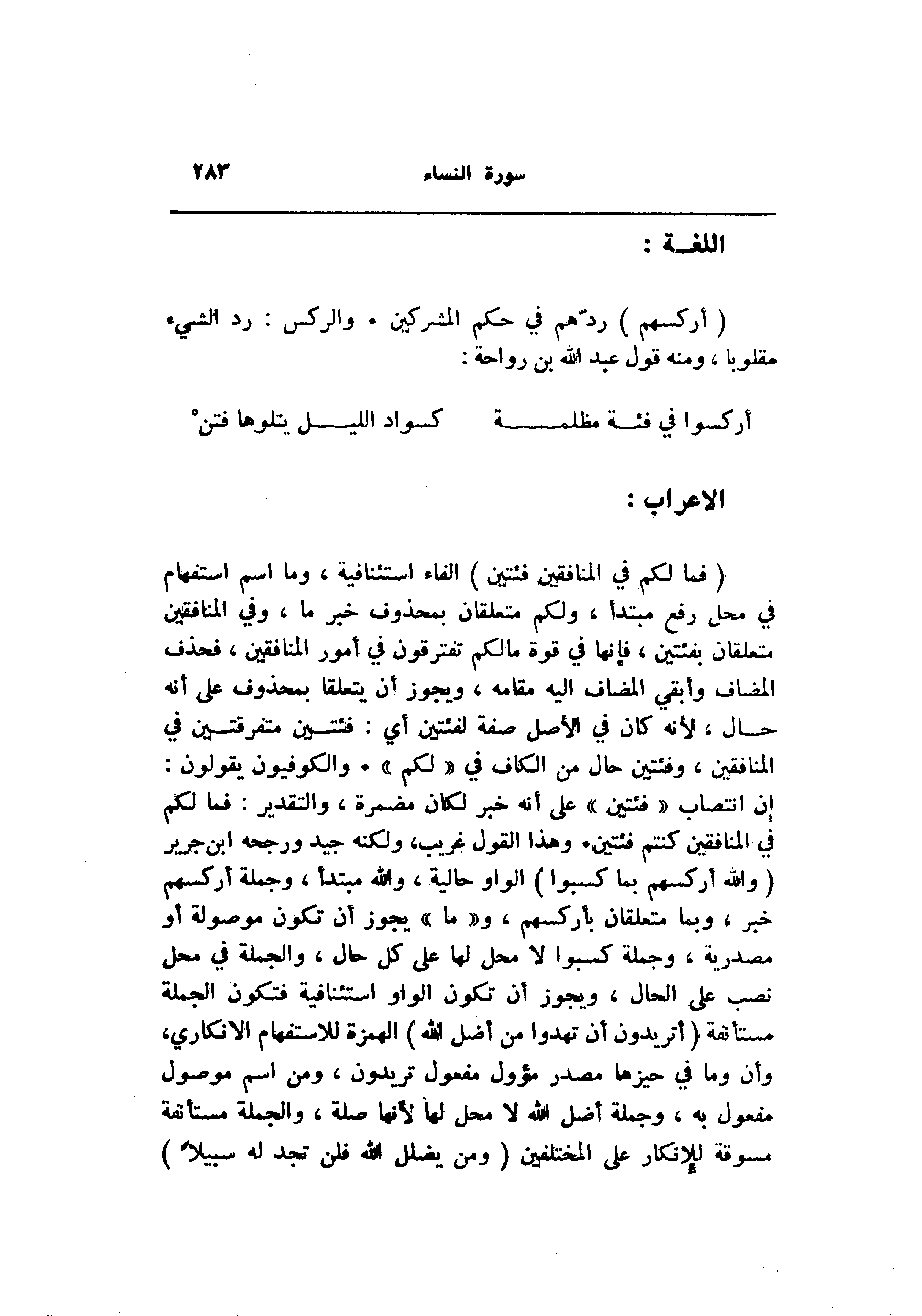 إن انتصاب «فئتين» على أنه خببر لكان مضمرة، والتقدير: فما لكم في المنافقين كنتم فئتين. وهذا القول غريب، ولكنه جيد ورجحه ابن جرير (وَاللَّهُ أَرْكَسَهُمْ بِما كَسَبُوا) الواو حالية، والله مبتدأ، وجملة أركسهم خبر، وبما متعلقان بأركسهم، و «ما» يجوز أن تكون موصولة أو مصدرية، وجملة كسبوا لا محل لها على كل حال، والجملة في محل نصب على الحال، ويجوز أن تكون الواو استئنافية فتكون الجملة مستأنفة (أَتُرِيدُونَ أَنْ تَهْدُوا مَنْ أَضَلَّ اللَّهُ) الهمزة للاستفهام الانكاري، وأن وما في حيزها مصدر مؤول مفعول تريدون، ومن اسم موصول مفعول به، وجملة أضل الله لا محل لها لأنها صلة، والجملة مستأنفة مسوقة للإنكار على المختلفين (وَمَنْ يُضْلِلِ اللَّهُ فَلَنْ تَجِدَ لَهُ سَبِيلًا)