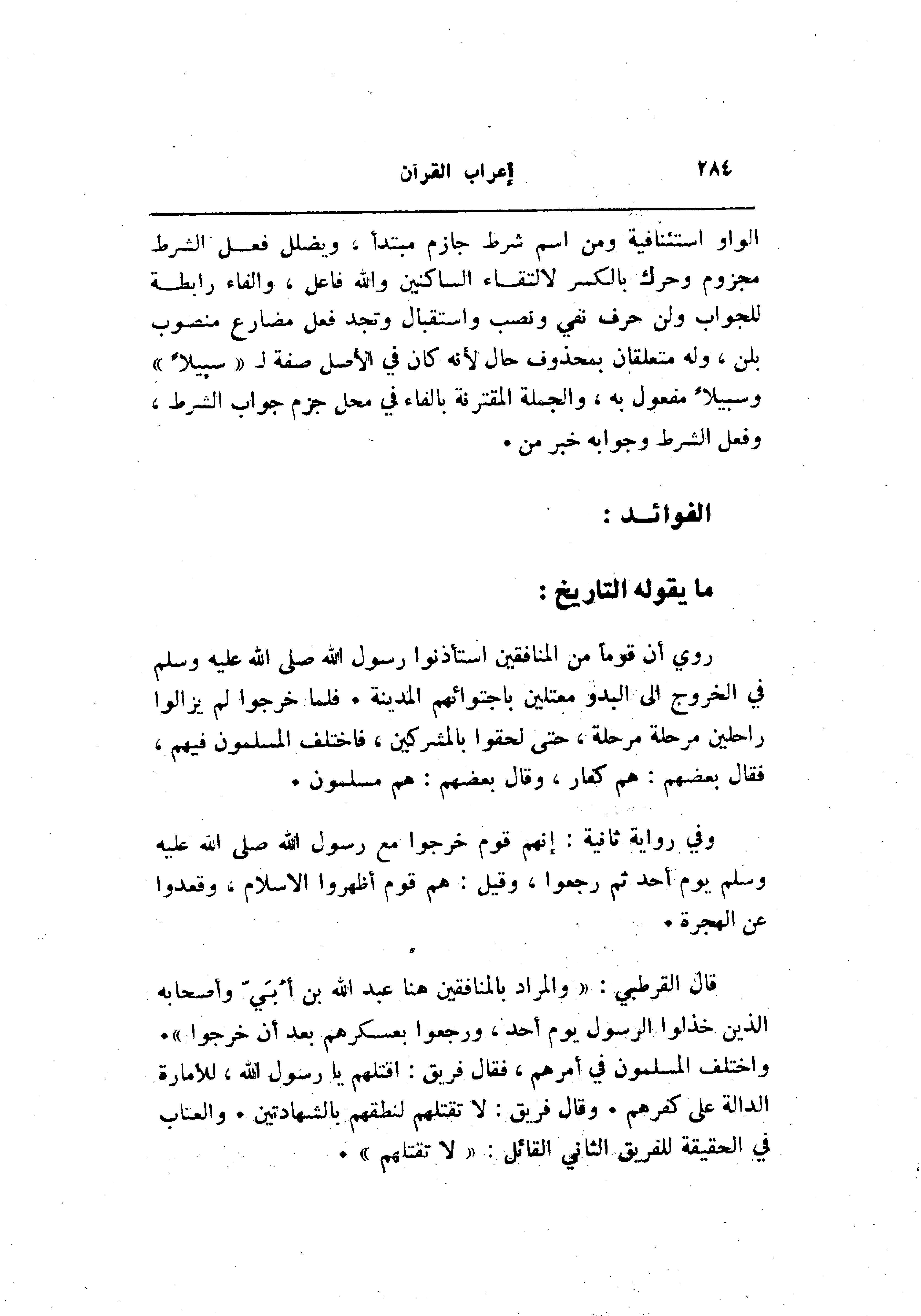 قال القرطبي: «والمراد بالمنافقين هنا عبد الله بن أبيّ وأصحابه الذين خذلوا الرسول يوم أحد، ورجعوا بعسكرهم بعد أن خرجوا» .