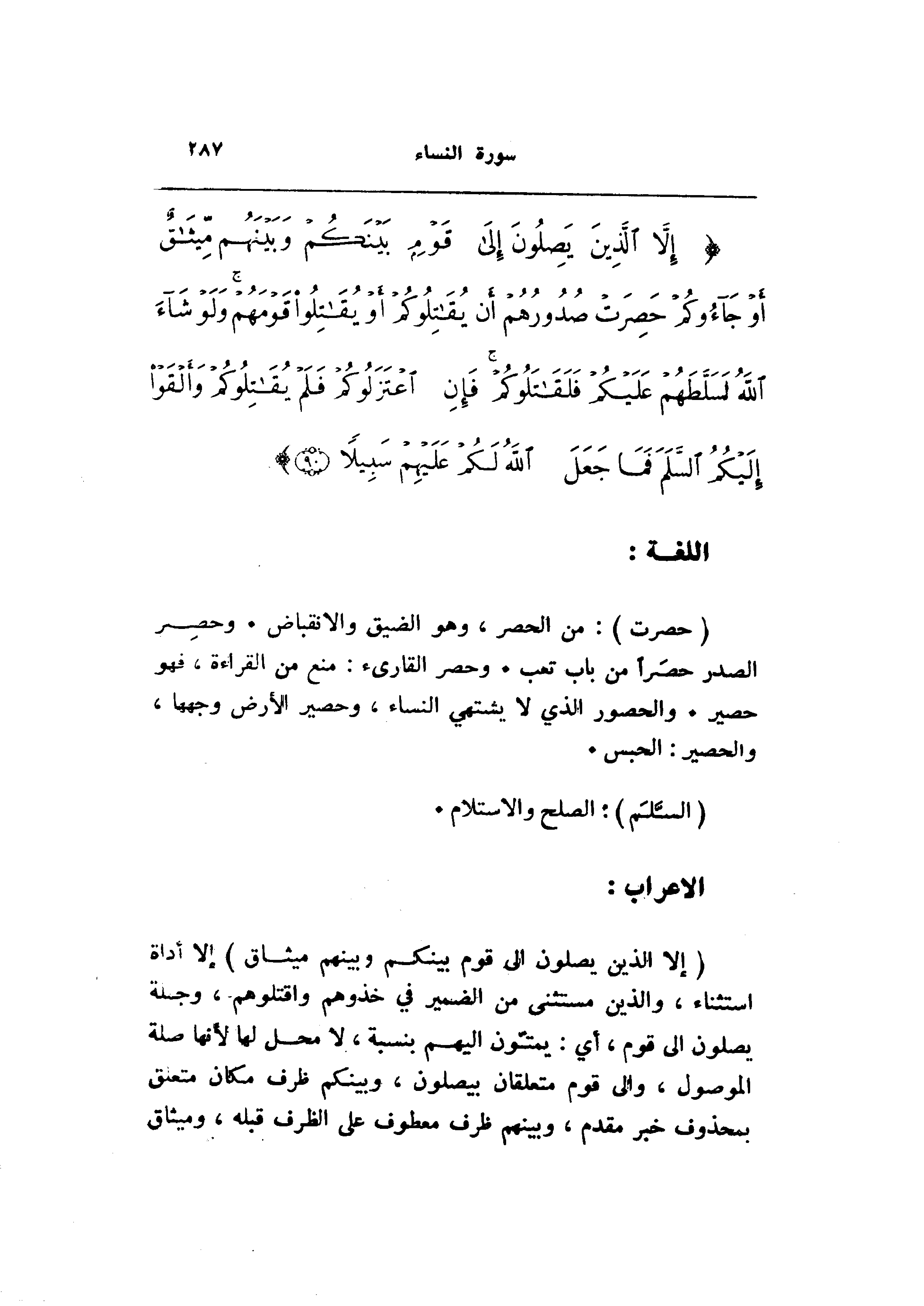 (إِلَّا الَّذِينَ يَصِلُونَ إِلى قَوْمٍ بَيْنَكُمْ وَبَيْنَهُمْ مِيثاقٌ) إلا أداة استثناء، والذين مستثنى من الضمير في خذوهم واقتلوهم، وجملة يصلون الى قوم، أي: يمتّون إليهم بنسبة، لا محل لها لأنها صلة الموصول، والى قوم متعلقان بيصلون، وبينكم ظرف مكان متعلق بمحذوف خبر مقدم، وبينهم ظرف معطوف على الظرف قبله، وميثاق