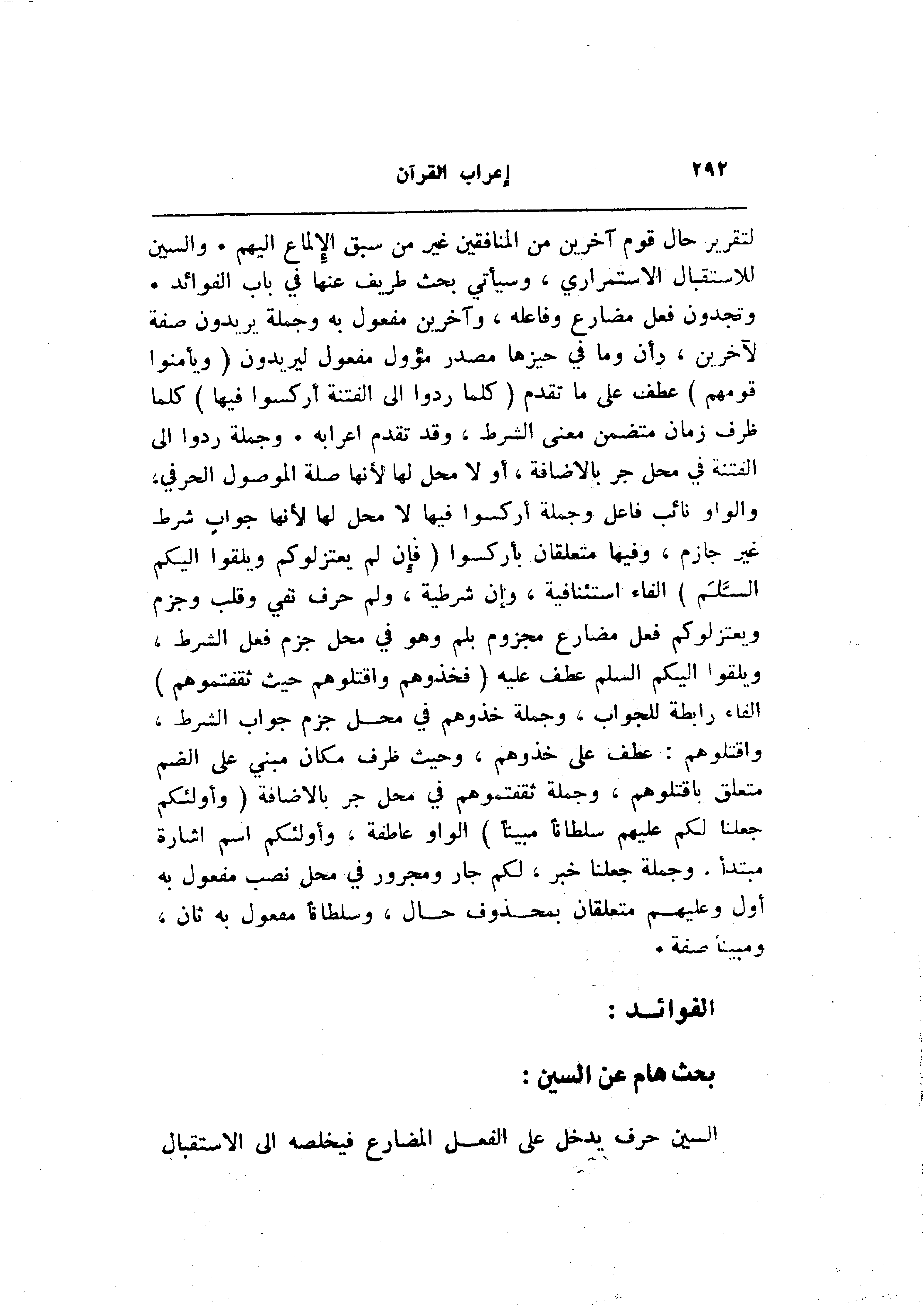 وتجدون فعل مضارع وفاعله، وآخرين مفعول به وجملة يريدون صفة لآخرين، وأن وما في حيزها مصدر مؤول مفعول ليريدون (وَيَأْمَنُوا قَوْمَهُمْ) عطف على ما تقدم (كُلَّما رُدُّوا إِلَى الْفِتْنَةِ أُرْكِسُوا فِيها) كلما ظرف زمان متضمن معنى الشرط، وقد تقدم إعرابه. وجملة ردوا الى الفتنة في محل جر بالاضافة، أو لا محل لها لأنها صلة الموصول الحرفي، والواو نائب فاعل وجملة أركسوا فيها لا محل لها لأنها جواب شرط غير جازم، وفيها متعلقان بأركسوا (فَإِنْ لَمْ يَعْتَزِلُوكُمْ وَيُلْقُوا إِلَيْكُمُ السَّلَمَ) الفاء استئنافية، وإن شرطية، ولم حرف نفي وقلب وجزم ويعتزلوكم فعل مضارع مجزوم بلم وهو في محل جزم فعل الشرط، ويلقوا إليكم السلم عطف عليه (فَخُذُوهُمْ وَاقْتُلُوهُمْ حَيْثُ ثَقِفْتُمُوهُمْ) الفاء رابطة للجواب، وجملة خذوهم في محل جزم جواب الشرط، واقتلوهم: عطف على خذوهم، وحيث ظرف مكان مبني على الضم متعلق باقتلوهم، وجملة ثقفتموهم في محل جر بالاضافة (وَأُولئِكُمْ جَعَلْنا لَكُمْ عَلَيْهِمْ سُلْطاناً مُبِيناً) الواو عاطفة، وأولئكم اسم اشارة مبتدأ. وجملة جعلنا خبر، لكم جار ومجرور في محل نصب مفعول به أول وعليهم متعلقان بمحذوف حال، وسلطانا مفعول به ثان، ومبينا صفة.