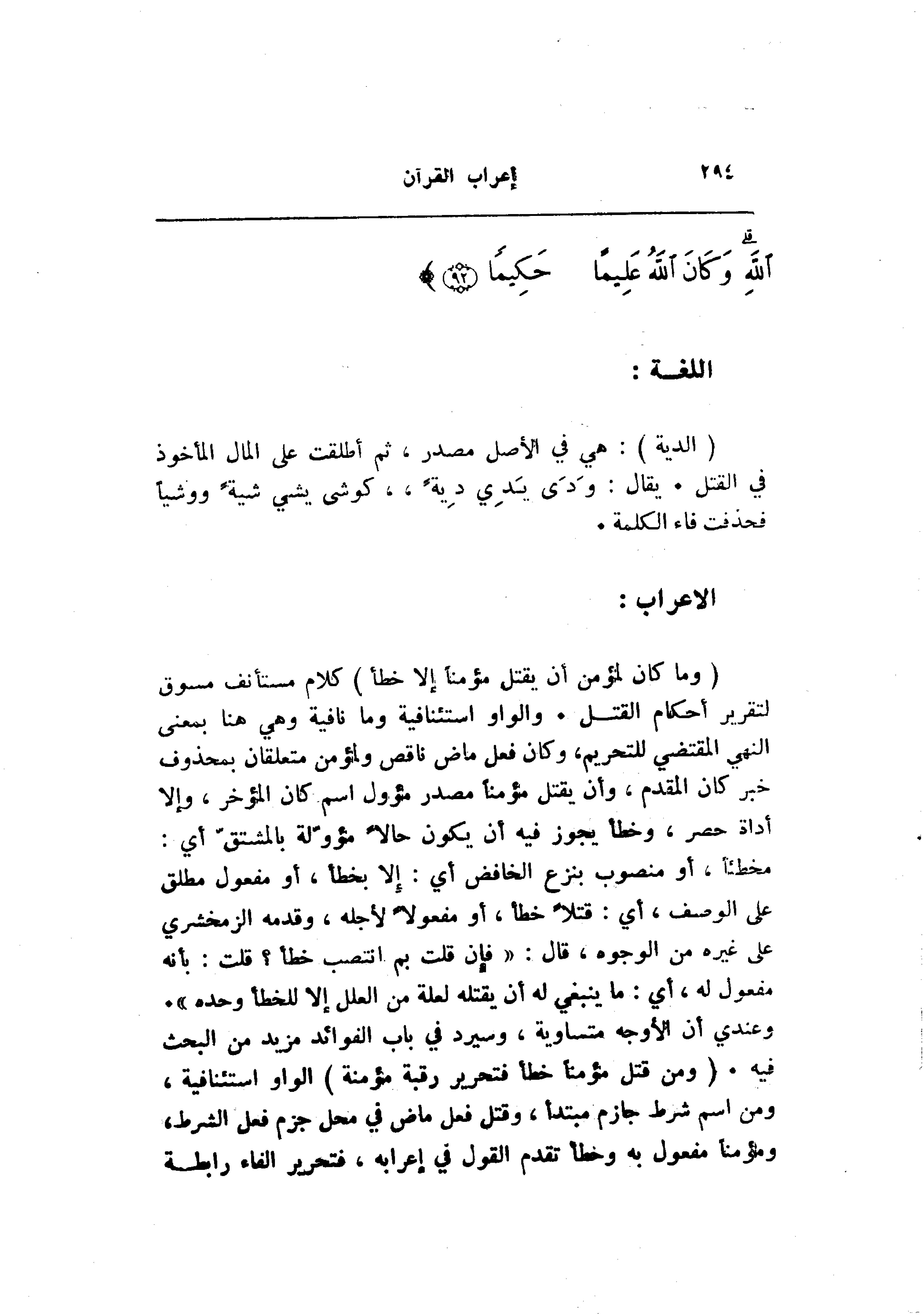 وعندي أن الأوجه متساوية، وسيرد في باب الفوائد مزيد من البحث فيه. (وَمَنْ قَتَلَ مُؤْمِناً خَطَأً فَتَحْرِيرُ رَقَبَةٍ مُؤْمِنَةٍ) الواو استئنافية، ومن اسم شرط جازم مبتدأ، وقتل فعل ماض في محل جزم فعل الشرط، ومؤمنا مفعول به وخطأ تقدم القول في إعرابه، فتحرير الفاء رابطة