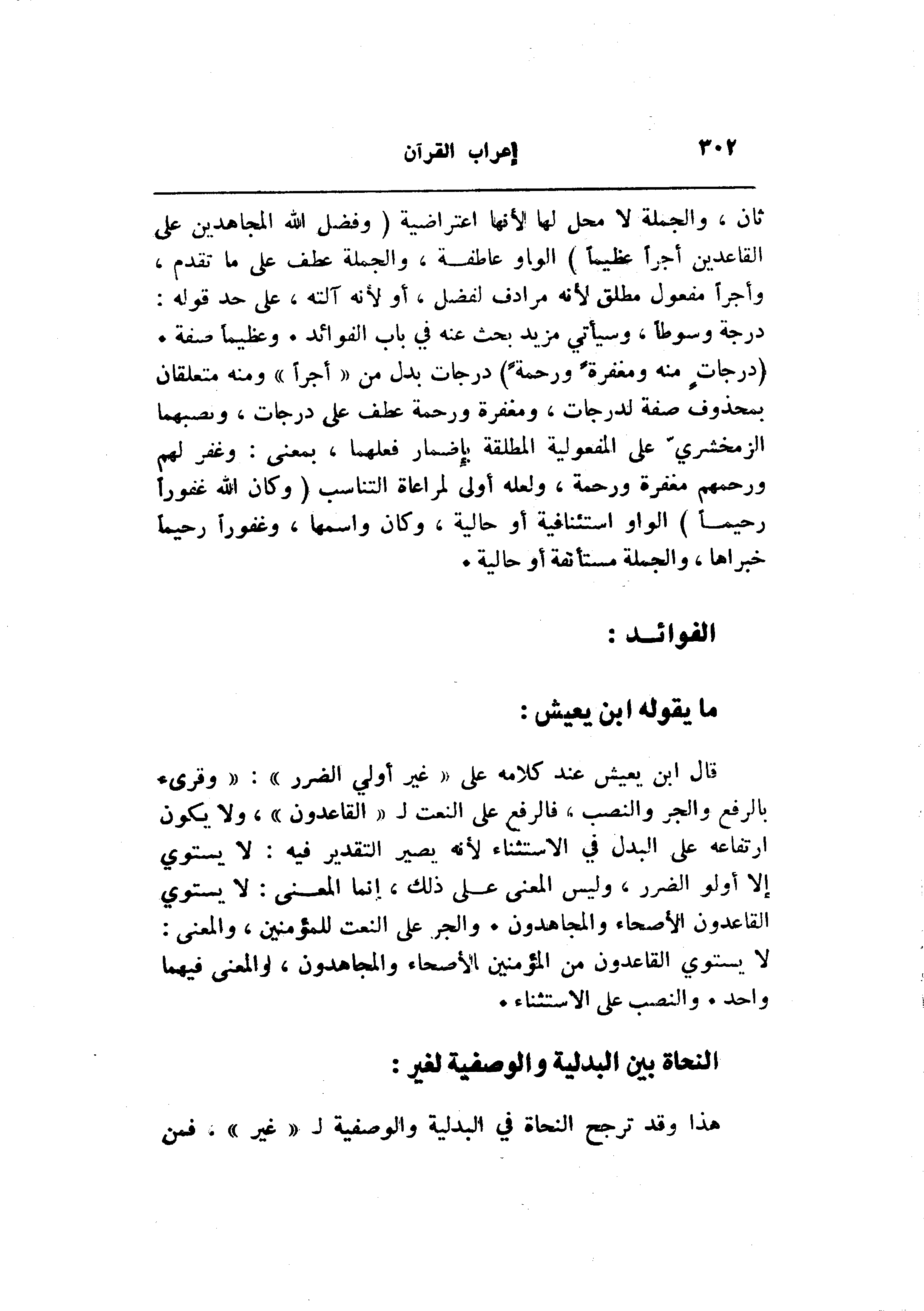 قال ابن يعيش عند كلامه على «غير أولي الضرر» : «وقرىء بالرفع والجر والنصب، فالرفع على النعت ل «القاعدون» ، ولا يكون ارتفاعه على البدل في الاستثناء لأنه يصير التقدير فيه: لا يستوي إلا أولو الضرر، وليس المعنى على ذلك، إنما المعنى: لا يستوي القاعدون الأصحاء والمجاهدون. والجر على النعت للمؤمنين، والمعنى: