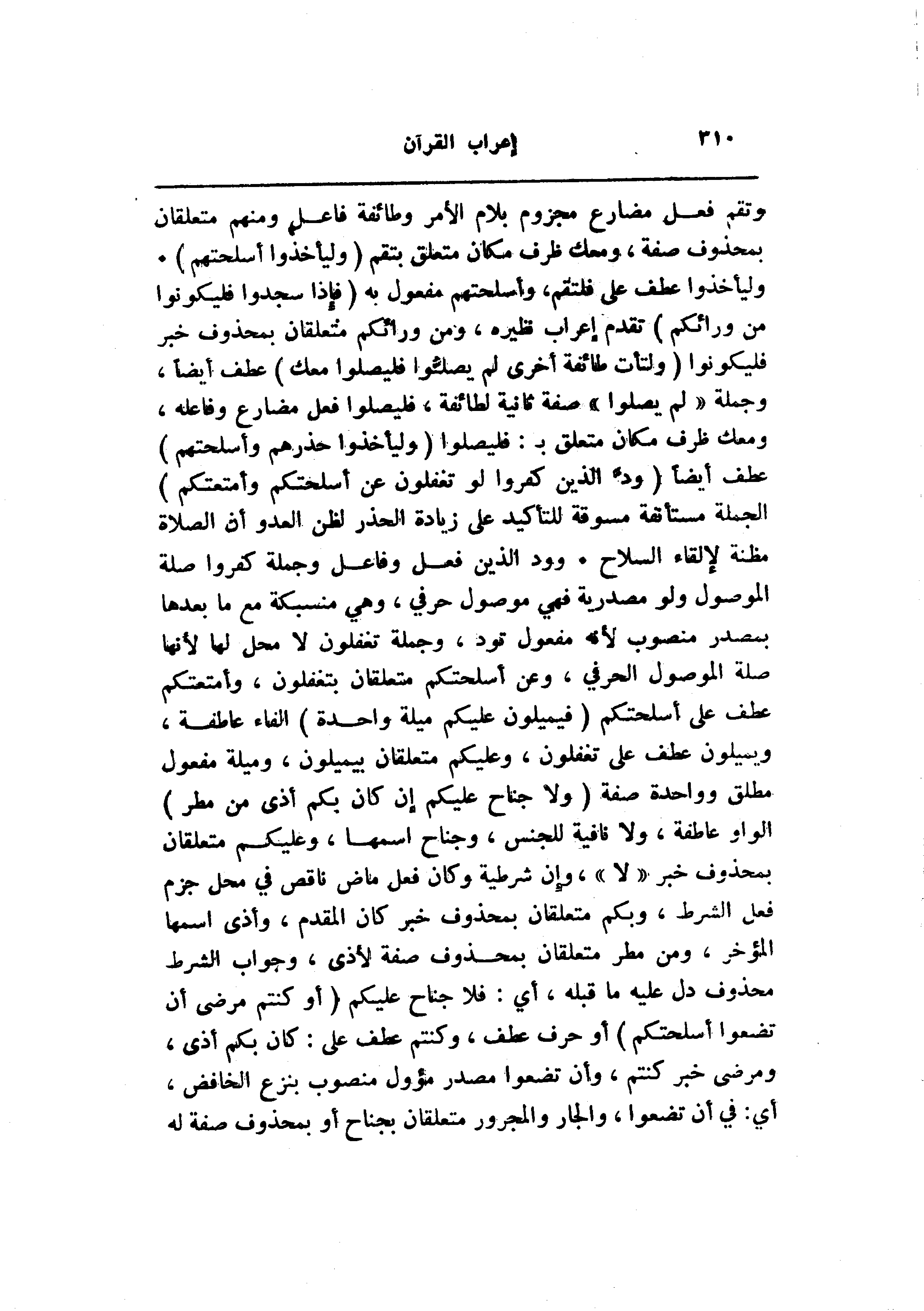 وليأخذوا عطف على فلتقم، وأسلحتهم مفعول به (فَإِذا سَجَدُوا فَلْيَكُونُوا مِنْ وَرائِكُمْ) تقدم إعراب نظيره، ومن ورائكم متعلقان بمحذوف خبر فليكونوا (وَلْتَأْتِ طائِفَةٌ أُخْرى لَمْ يُصَلُّوا فَلْيُصَلُّوا مَعَكَ) عطف أيضا، وجملة «لم يصلوا» صفة ثانية لطائفة، فليصلوا فعل مضارع وفاعله، ومعك ظرف مكان متعلق ب: فليصلوا (وَلْيَأْخُذُوا حِذْرَهُمْ وَأَسْلِحَتَهُمْ) عطف أيضا (وَدَّ الَّذِينَ كَفَرُوا لَوْ تَغْفُلُونَ عَنْ أَسْلِحَتِكُمْ وَأَمْتِعَتِكُمْ) الجملة مستأنفة مسوقة للتأكيد على زيادة الحذر لظن العدو أن الصلاة مظنة لإلقاء السلاح. وود الذين فعل وفاعل وجملة كفروا صلة الموصول ولو مصدرية فهي موصول حرفي، وهي منسبكة مع ما بعدها بمصدر منصوب لأنه مفعول تود، وجملة تغفلون لا محل لها لأنها صلة الموصول الحرفي، وعن أسلحتكم متعلقان بتغفلون، وأمتعتكم عطف على أسلحتكم (فَيَمِيلُونَ عَلَيْكُمْ مَيْلَةً واحِدَةً) الفاء عاطفة، ويميلون عطف على تغفلون، وعليكم متعلقان بيميلون، وميلة مفعول مطلق وواحدة صفة (وَلا جُناحَ عَلَيْكُمْ إِنْ كانَ بِكُمْ أَذىً مِنْ مَطَرٍ) الواو عاطفة، ولا نافية للجنس، وجناح اسمها، وعليكم متعلقان بمحذوف خبر «لا» ، وإن شرطية وكان فعل ماض ناقص في محل جزم فعل الشرط، وبكم متعلقان بمحذوف خبر كان المقدم، وأذى اسمها المؤخر، ومن مطر متعلقان بمحذوف صفة لأذى، وجواب الشرط محذوف دل عليه ما قبله، أي: فلا جناح عليكم (أَوْ كُنْتُمْ مَرْضى أَنْ تَضَعُوا أَسْلِحَتَكُمْ) أو حرف عطف، وكنتم عطف على: كان بكم أذى، ومرضى خبر كنتم، وأن تضعوا مصدر مؤول منصوب بنزع الخافض، أي: في أن تضعوا، والجار والمجرور متعلقان بجناح أو بمحذوف صفة له