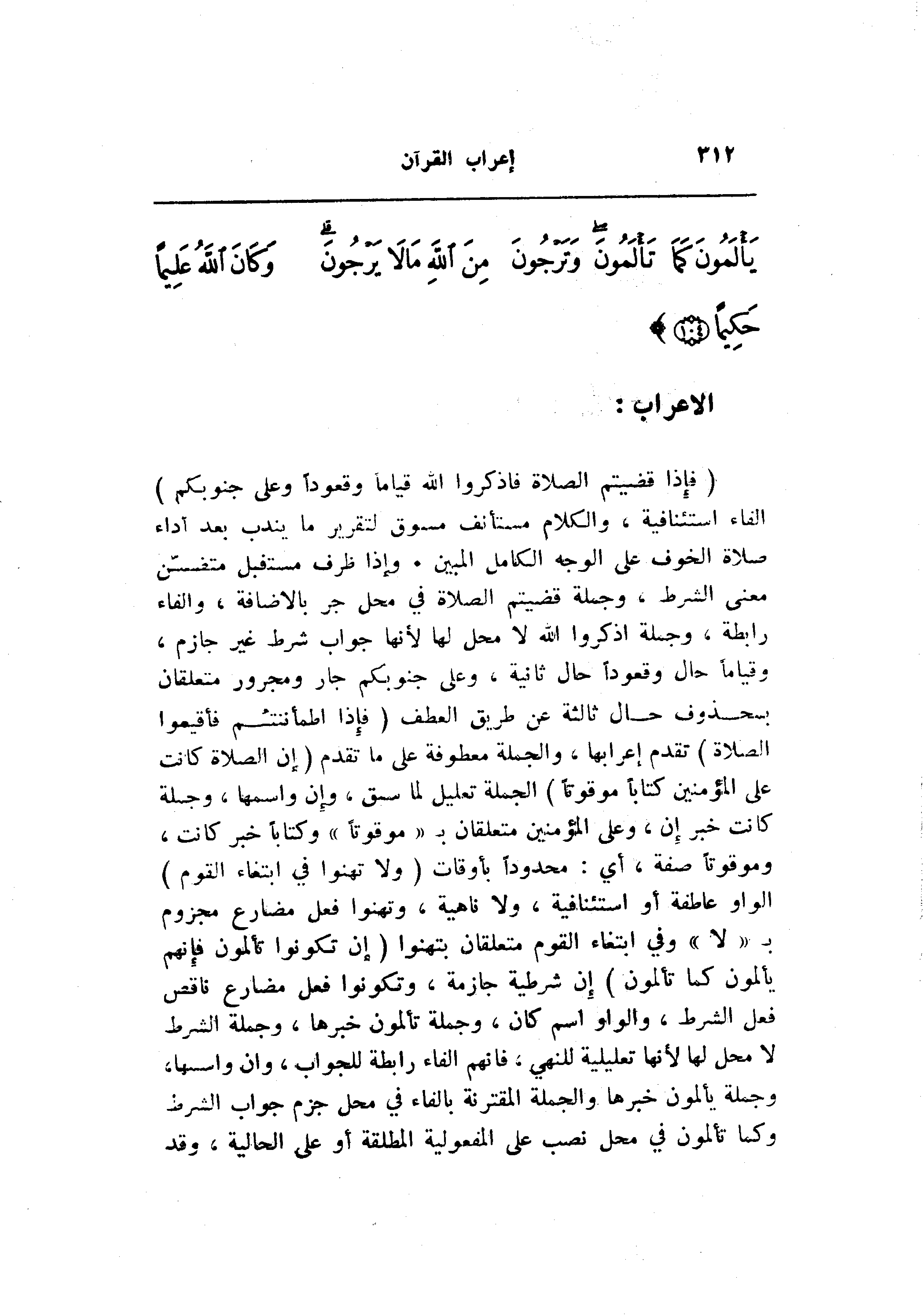 (فَإِذا قَضَيْتُمُ الصَّلاةَ فَاذْكُرُوا اللَّهَ قِياماً وَقُعُوداً وَعَلى جُنُوبِكُمْ) الفاء استئنافية، والكلام مستأنف مسوق لتقرير ما يندب بعد أداء صلاة الخوف على الوجه الكامل المبين. وإذا ظرف مستقبل متضمّن معنى الشرط، وجملة قضيتم الصلاة في محل جر بالاضافة، والفاء رابطة، وجملة اذكروا الله لا محل لها لأنها جواب شرط غير جازم، وقياما حال وقعودا حال ثانية، وعلى جنوبكم جار ومجرور متعلقان بمحذوف حال ثالثة عن طريق العطف (فَإِذَا اطْمَأْنَنْتُمْ فَأَقِيمُوا الصَّلاةَ) تقدم إعرابها، والجملة معطوفة على ما تقدم (إِنَّ الصَّلاةَ كانَتْ عَلَى الْمُؤْمِنِينَ كِتاباً مَوْقُوتاً) الجملة تعليل لما سبق، وإن واسمها، وجملة كانت خبر إن، وعلى المؤمنين متعلقان ب «موقوتا» وكتابا خبر كانت، وموقوتا صفة، أي: محدودا بأوقات (وَلا تَهِنُوا فِي ابْتِغاءِ الْقَوْمِ) الواو عاطفة أو استئنافية، ولا ناهية، وتهنوا فعل مضارع مجزوم ب «لا» وفي ابتغاء القوم متعلقان بتهنوا (إِنْ تَكُونُوا تَأْلَمُونَ فَإِنَّهُمْ يَأْلَمُونَ كَما تَأْلَمُونَ) إن شرطية جازمة، وتكونوا فعل مضارع ناقص فعل الشرط، والواو اسم كان، وجملة تألمون خبرها، وجملة الشرط لا محل لها لأنها تعليلية للنهي، فانهم الفاء رابطة للجواب، وان واسمها، وجملة يألمون خبرها والجملة المقترنة بالفاء في محل جزم جواب الشرط وكما تألمون في محل نصب على المفعولية المطلقة أو على الحالية، وقد
