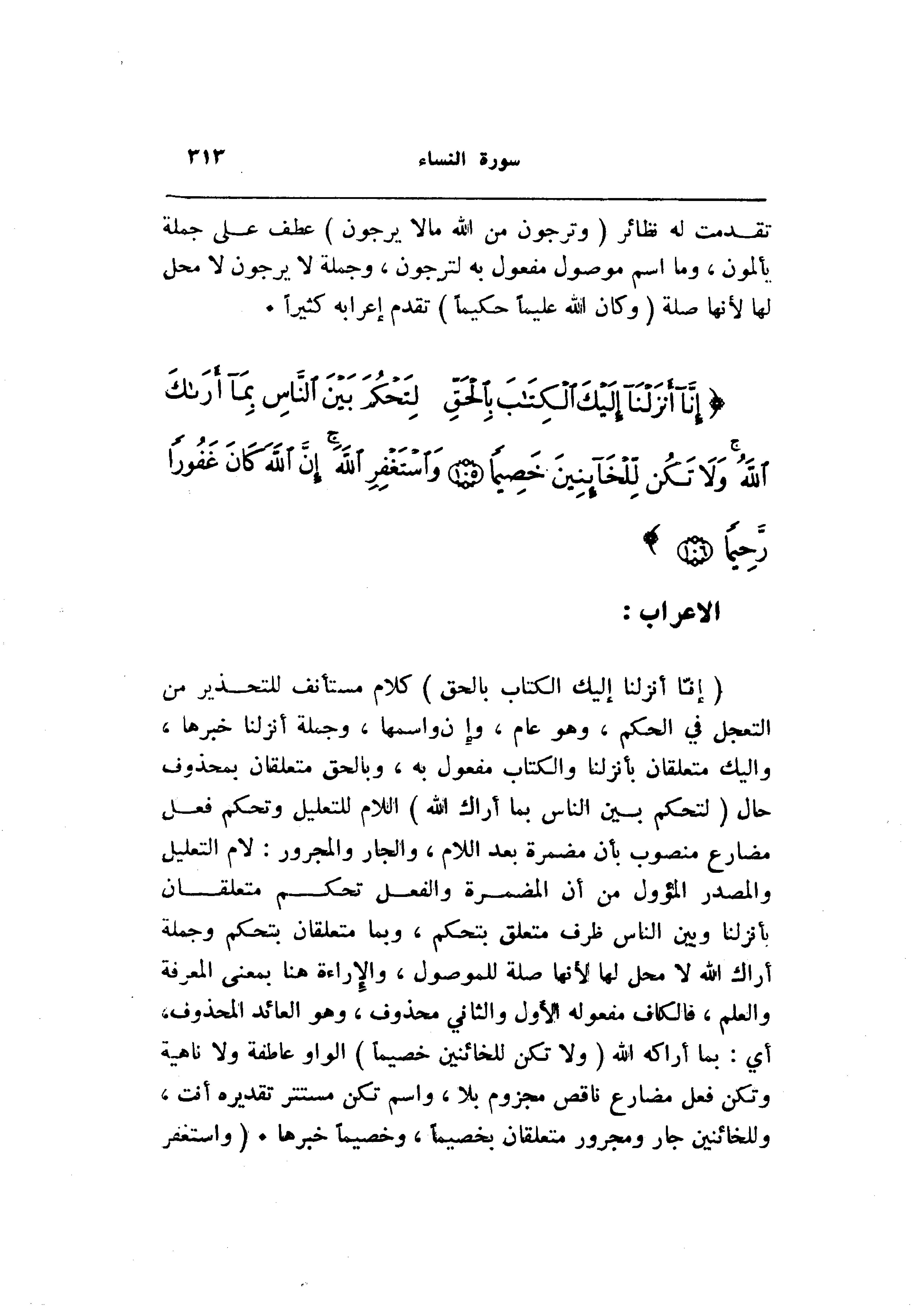(إِنَّا أَنْزَلْنا إِلَيْكَ الْكِتابَ بِالْحَقِّ) كلام مستأنف للتحذير من التعجل في الحكم، وهو عام، وإن واسمها، وجملة أنزلنا خبرها، وإليك متعلقان بأنزلنا والكتاب مفعول به، وبالحق متعلقان بمحذوف حال (لِتَحْكُمَ بَيْنَ النَّاسِ بِما أَراكَ اللَّهُ) اللام للتعليل وتحكم فعل مضارع منصوب بأن مضمرة بعد اللام، والجار والمجرور: لام التعليل والمصدر المؤول من أن المضمرة والفعل تحكم متعلقان بأنزلنا وبين الناس ظرف متعلق بتحكم، وبما متعلقان بتحكم وجملة أراك الله لا محل لها لأنها صلة للموصول، والإراءة هنا بمعنى المعرفة والعلم، فالكاف مفعوله الأول والثاني محذوف، وهو العائد المحذوف، أي: بما أراكه الله (وَلا تَكُنْ لِلْخائِنِينَ خَصِيماً) الواو عاطفة ولا ناهية وتكن فعل مضارع ناقص مجزوم بلا، واسم تكن مستتر تقديره أنت، وللخائنين جار ومجرور متعلقان بخصيما، وخصيما خبرها. (وَاسْتَغْفِرِ