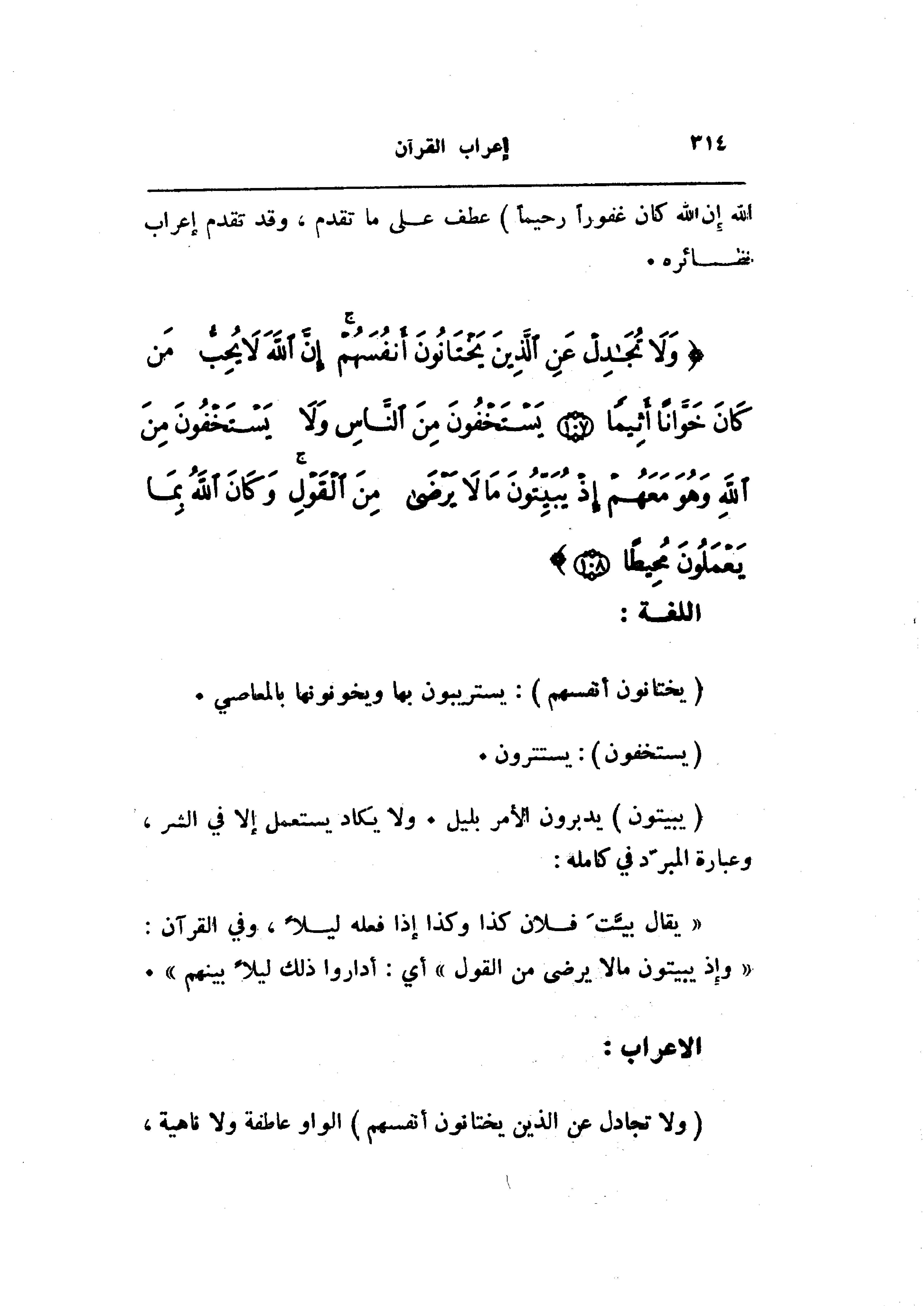 وَلا تُجادِلْ عَنِ الَّذِينَ يَخْتانُونَ أَنْفُسَهُمْ إِنَّ اللَّهَ لا يُحِبُّ مَنْ كانَ خَوَّاناً أَثِيماً (107) يَسْتَخْفُونَ مِنَ النَّاسِ وَلا يَسْتَخْفُونَ مِنَ اللَّهِ وَهُوَ مَعَهُمْ إِذْ يُبَيِّتُونَ ما لا يَرْضى مِنَ الْقَوْلِ وَكانَ اللَّهُ بِما يَعْمَلُونَ مُحِيطاً (108)