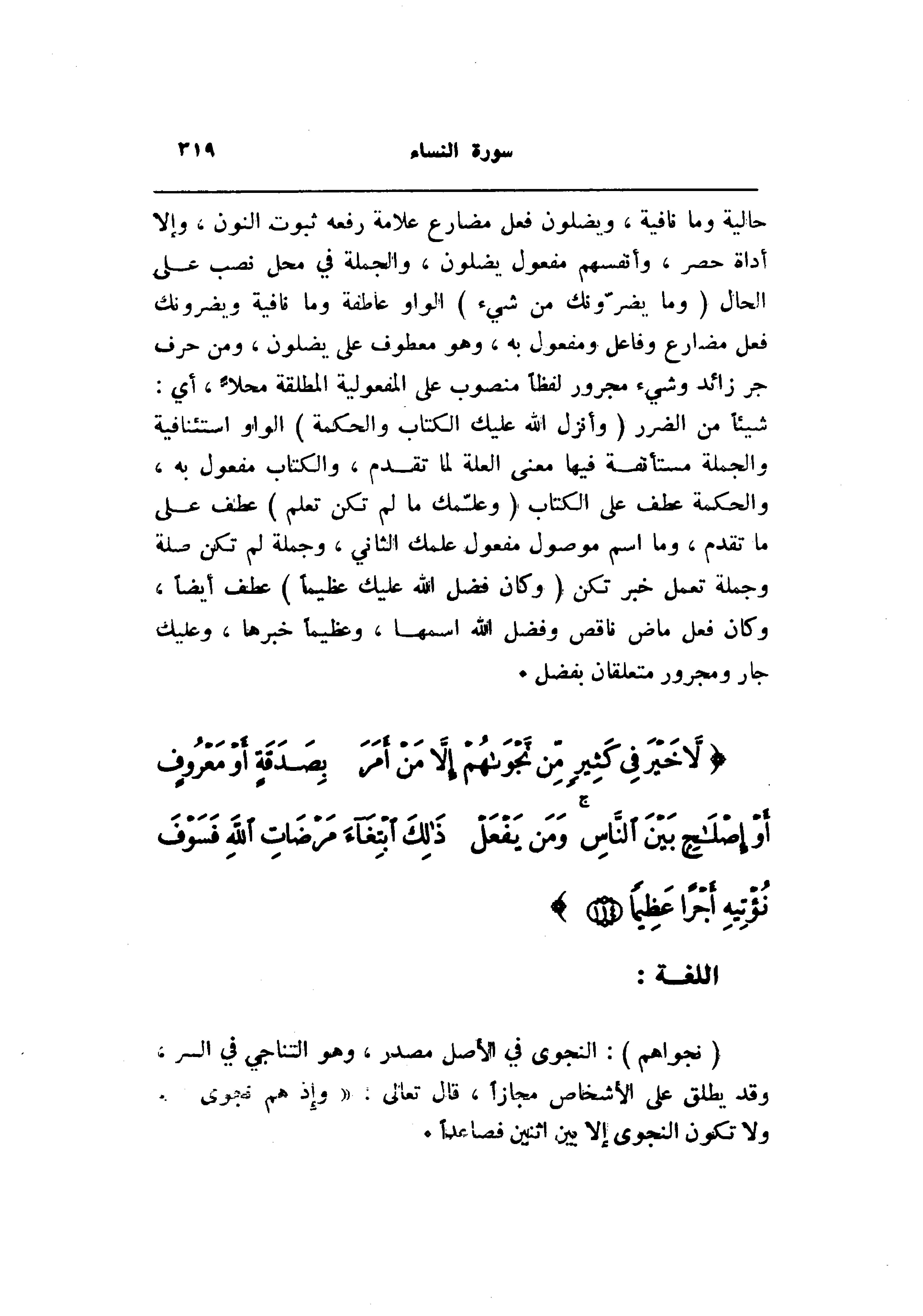 (نَجْواهُمْ) : النجوى في الأصل مصدر، وهو التناجي في السر، وقد يطلق على الأشخاص مجازا، قال تعالى: «وإذ هم نجوى» ، ولا تكون النجوى إلا بين اثنين فصاعدا.