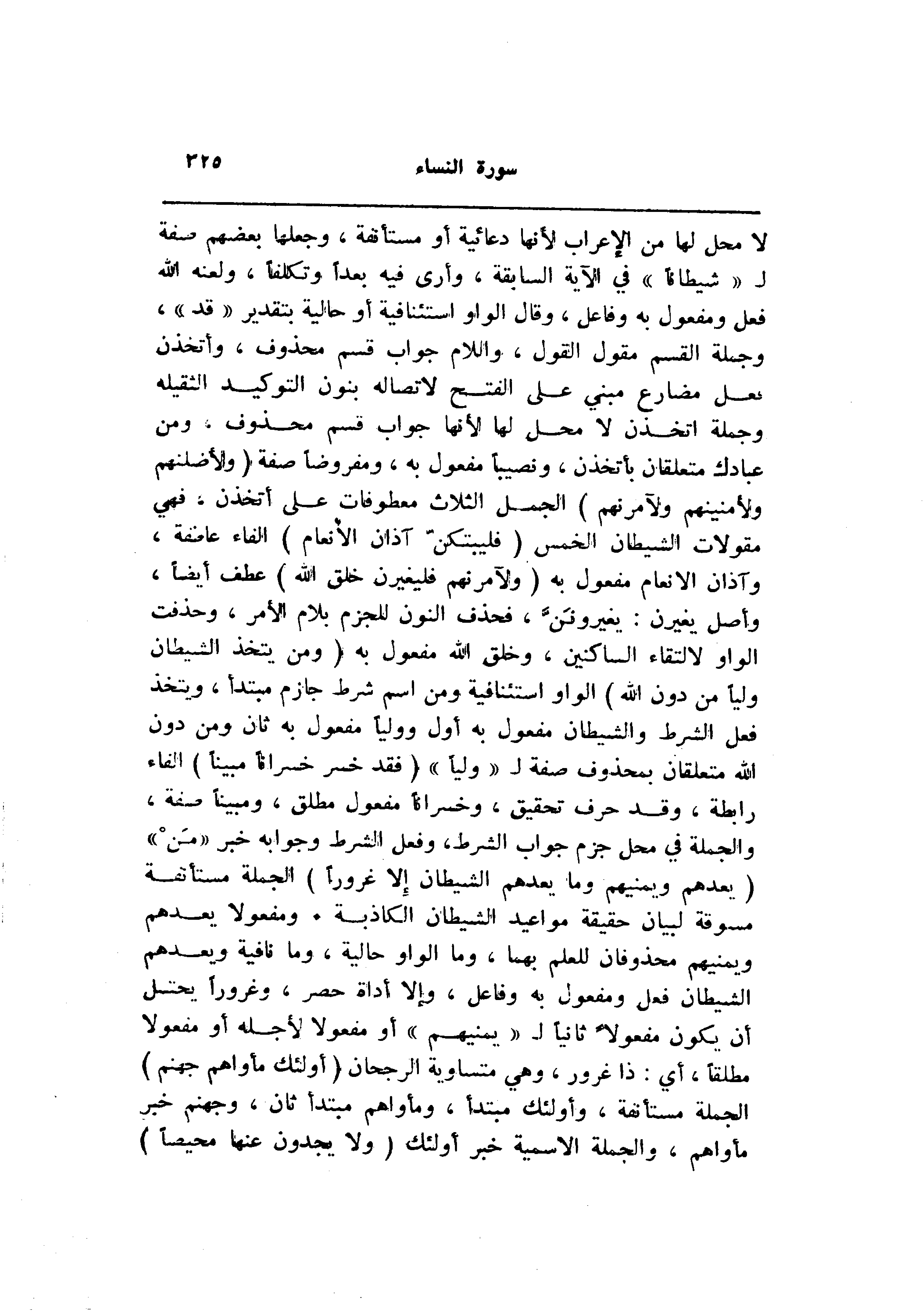 لا محل لها من الإعراب لأنها دعائية أو مستأنفة، وجعلها بعضهم صفة ل «شيطانا» في الآية السابقة، وأرى فيه بعدا وتكلفا، ولعنه الله فعل ومفعول به وفاعل، وقال الواو استئنافية أو حالية بتقدير «قد» ، وجملة القسم مقول القول، واللام جواب قسم محذوف، وأتخذن فعل مضارع مبني على الفتح لاتصاله بنون التوكيد الثقيلة وجملة اتخذن لا محل لها لأنها جواب قسم محذوف، ومن عبادك متعلقان بأتخذن، ونصيبا مفعول به، ومفروضا صفة (وَلَأُضِلَّنَّهُمْ وَلَأُمَنِّيَنَّهُمْ وَلَآمُرَنَّهُمْ) الجمل الثلاث معطوفات على أتخذن، فهي مقولات الشيطان الخمس (فَلَيُبَتِّكُنَّ آذانَ الْأَنْعامِ) الفاء عاصفة، وآذان الانعام مفعول به (وَلَآمُرَنَّهُمْ فَلَيُغَيِّرُنَّ خَلْقَ اللَّهِ) عطف أيضا، وأصل يغيرن: يغيروننّ، فحذف النون للجزم بلام الأمر، وحذفت الواو لالتقاء الساكنين، وخلق الله مفعول به (وَمَنْ يَتَّخِذِ الشَّيْطانَ وَلِيًّا مِنْ دُونِ اللَّهِ) الواو استئنافية ومن اسم شرط جازم مبتدأ، ويتخذ فعل الشرط والشيطان مفعول به أول ووليا مفعول به ثان ومن دون الله متعلقان بمحذوف صفة ل «وليا» (فَقَدْ خَسِرَ خُسْراناً مُبِيناً) الفاء رابطة، وقد حرف تحقيق، وخسرانا مفعول مطلق، ومبينا صفة، والجملة في محل جزم جواب الشرط، وفعل الشرط وجوابه خبر «من» (يَعِدُهُمْ وَيُمَنِّيهِمْ وَما يَعِدُهُمُ الشَّيْطانُ إِلَّا غُرُوراً) الجملة مستأنفة مسوقة لبيان حقيقة مواعيد الشيطان الكاذبة. ومفعولا يعدهم ويمنيهم محذوفان للعلم بهما، وما الواو حالية، وما نافية ويعدهم الشيطان فعل ومفعول به وفاعل، وإلا أداة حصر، وغرورا يحتمل أن يكون مفعولا ثانيا ل «يمنيهم» أو مفعولا لأجله أو مفعولا مطلقا، أي: ذا غرور، وهي متساوية الرجحان (أُولئِكَ مَأْواهُمْ جَهَنَّمُ) الجملة مستأنفة، وأولئك مبتدأ، ومأواهم مبتدأ ثان، وجهنم خبر مأواهم، والجملة الاسمية خبر أولئك (وَلا يَجِدُونَ عَنْها مَحِيصاً)