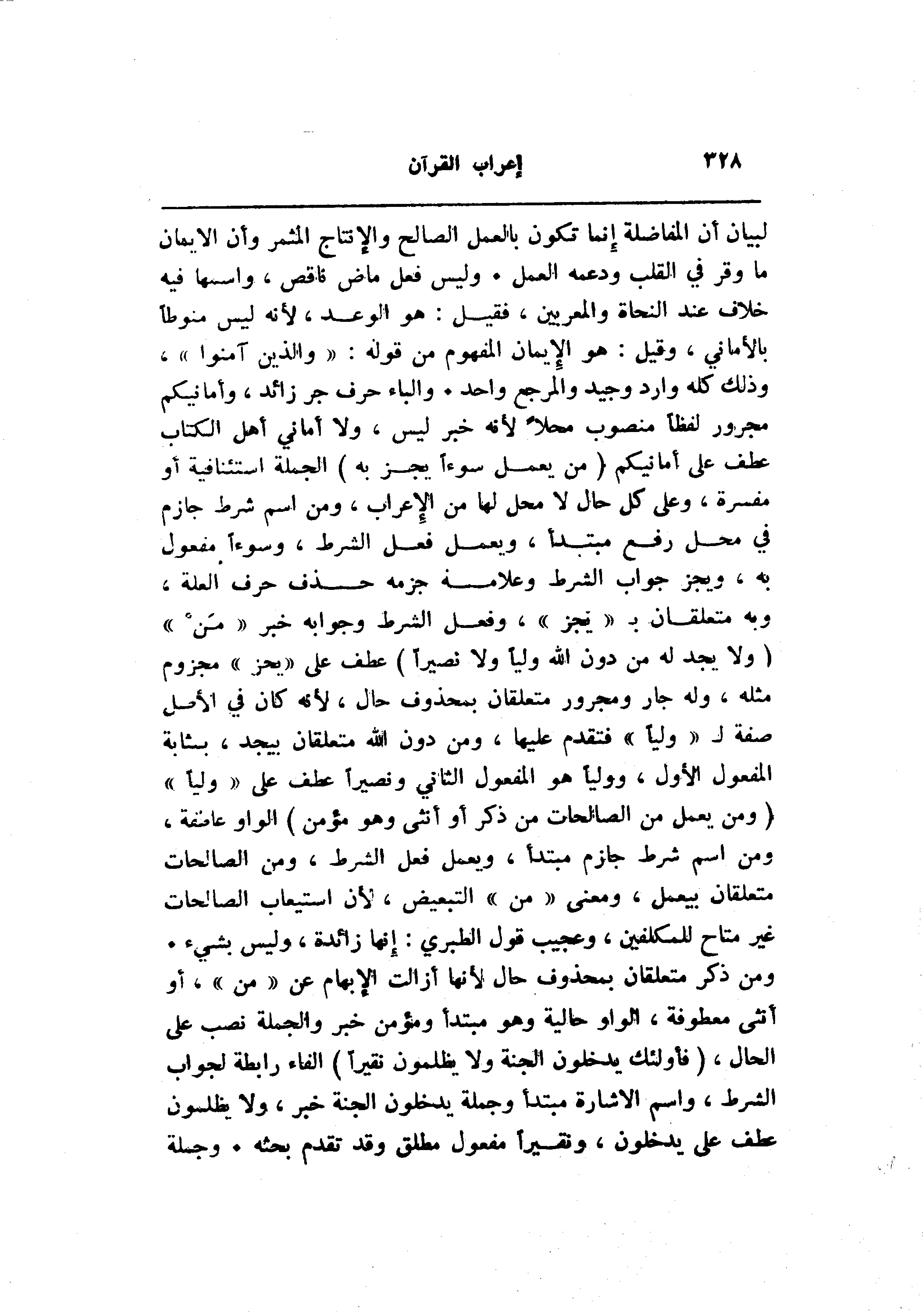 لبيان أن المفاضلة إنما تكون بالعمل الصالح والإنتاج المثمر وأن الايمان ما وقر في القلب ودعمه العمل. وليس فعل ماض ناقص، واسمها فيه خلاف عند النحاة والمعربين، فقيل: هو الوعد، لأنه ليس منوطا بالأماني، وقيل: هو الإيمان المفهوم من قوله: «والذين آمنوا» ، وذلك كله وارد وجيد والمرجع واحد. والباء حرف جر زائد، وأمانيكم مجرور لفظا منصوب محلا لأنه خبر ليس، ولا أماني أهل الكتاب عطف على أمانيكم (مَنْ يَعْمَلْ سُوءاً يُجْزَ بِهِ) الجملة استئنافية أو مفسرة، وعلى كل حال لا محل لها من الإعراب، ومن اسم شرط جازم في محل رفع مبتدأ، ويعمل فعل الشرط، وسوءا مفعول به، ويجز جواب الشرط وعلامة جزمه حذف حرف العلة، وبه متعلقان ب «يجز» ، وفعل الشرط وجوابه خبر «من» (وَلا يَجِدْ لَهُ مِنْ دُونِ اللَّهِ وَلِيًّا وَلا نَصِيراً) عطف على «يجز» مجزوم مثله، وله جار ومجرور متعلقان بمحذوف حال، لأنه كان في الأصل صفة ل «وليا» فتقدم عليها، ومن دون الله متعلقان بيجد، بمثابة المفعول الأول، ووليا هو المفعول الثاني ونصيرا عطف على «وليا» (وَمَنْ يَعْمَلْ مِنَ الصَّالِحاتِ مِنْ ذَكَرٍ أَوْ أُنْثى وَهُوَ مُؤْمِنٌ) الواو عاطفة، ومن اسم شرط جازم مبتدأ، ويعمل فعل الشرط، ومن الصالحات متعلقان بيعمل، ومعنى «من» التبعيض، لأن استيعاب الصالحات غير متاح للمكلفين، وعجيب قول الطبري: إنها زائدة، وليس بشيء.