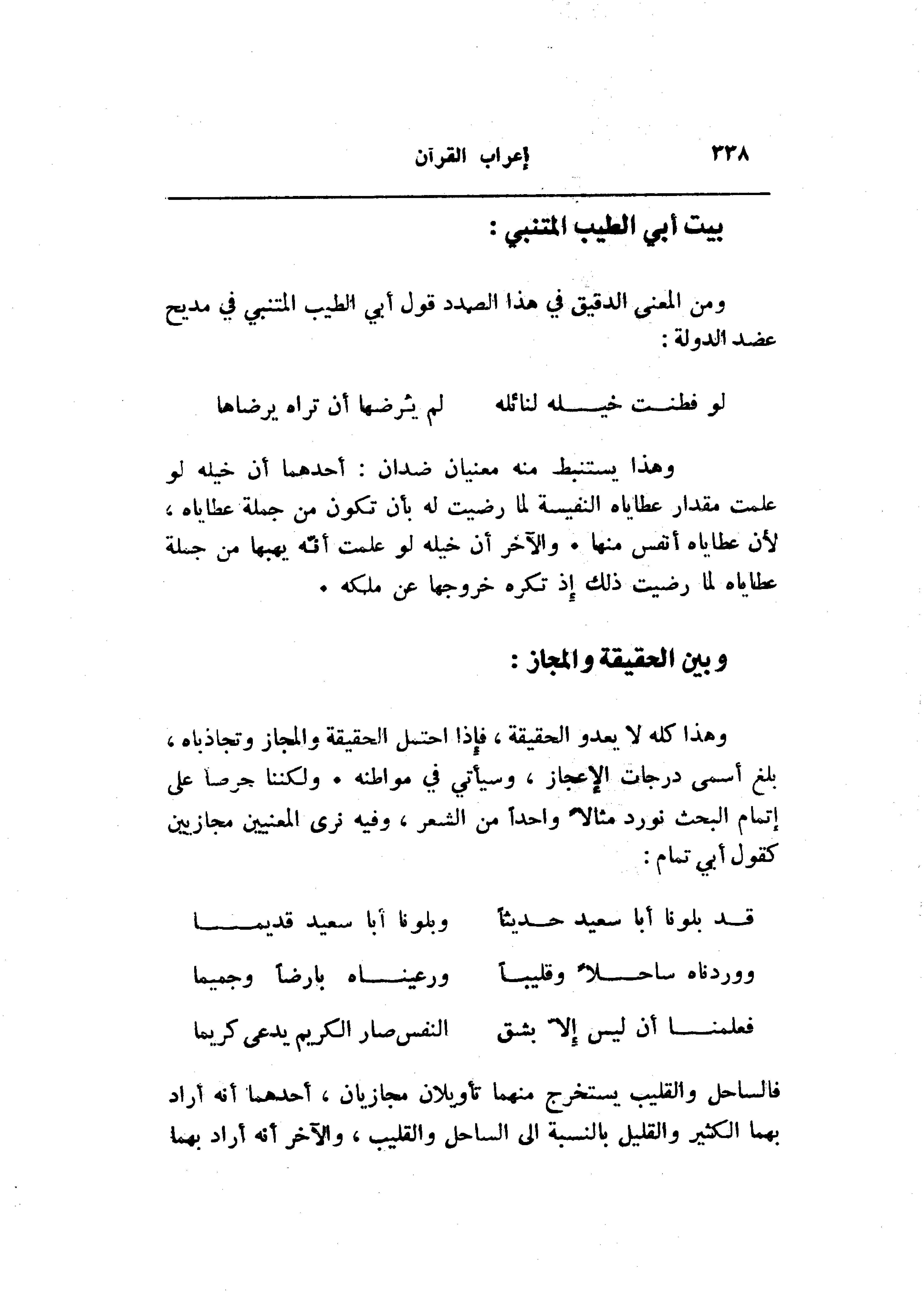 وهذا كله لا يعدو الحقيقة، فإذا احتمل الحقيقة والمجاز وتجاذباه، بلغ أسمى درجات الإعجاز، وسيأتي في مواطنه. ولكننا حرصا على إتمام البحث نورد مثالا واحدا من الشعر، وفيه نرى المعنيين مجازيين كقول أبي تمام: