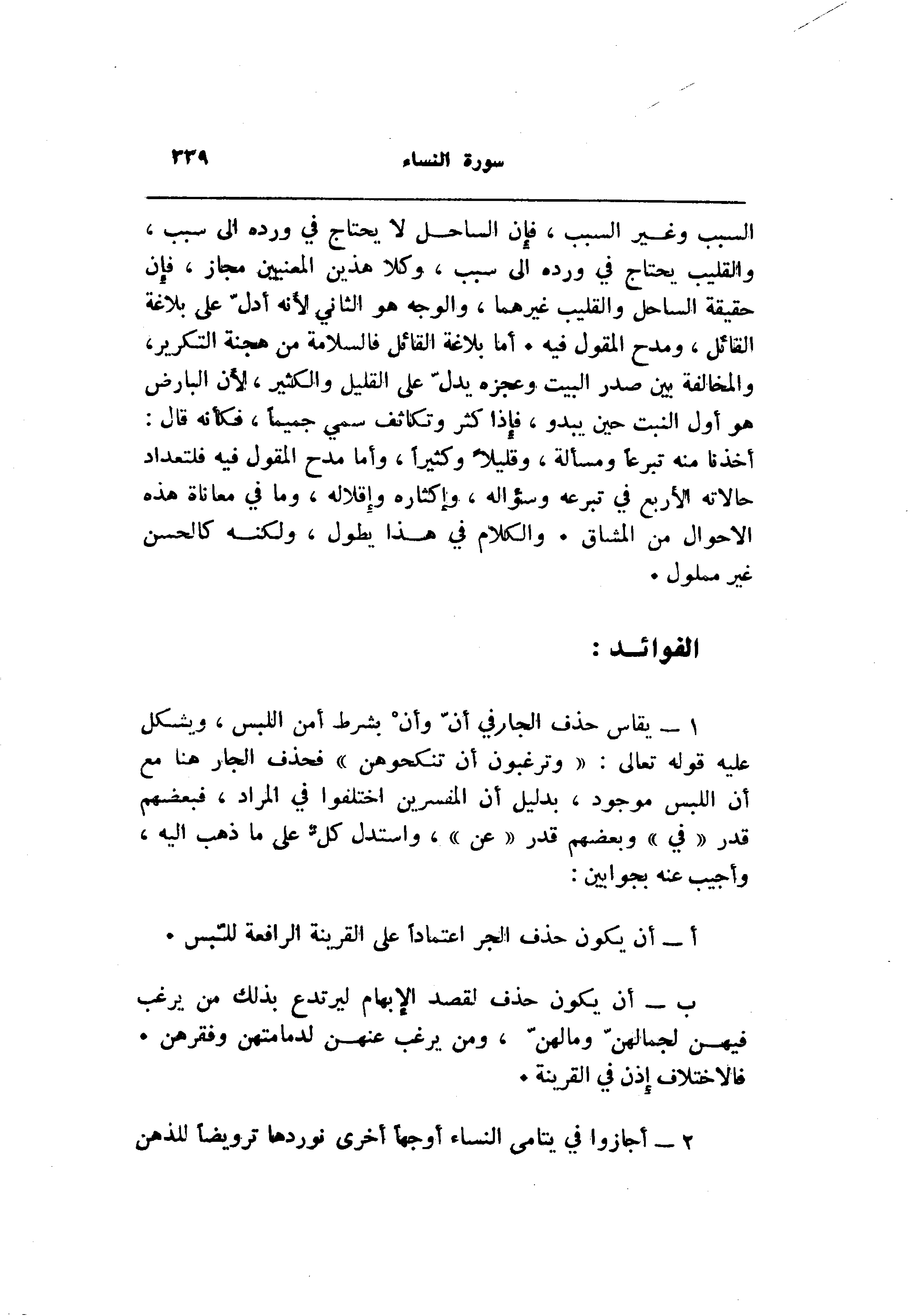 1- يقاس حذف الجار في أنّ وأن بشرط أمن اللبس، ويشكل عليه قوله تعالى: «وترغبون أن تنكحوهن» فحذف الجار هنا مع أن اللبس موجود، بدليل أن المفسرين اختلفوا في المراد، فبعضهم قدر «في» وبعضهم قدر «عن» ، واستدل كلّ على ما ذهب اليه، وأجيب عنه بجوابين: