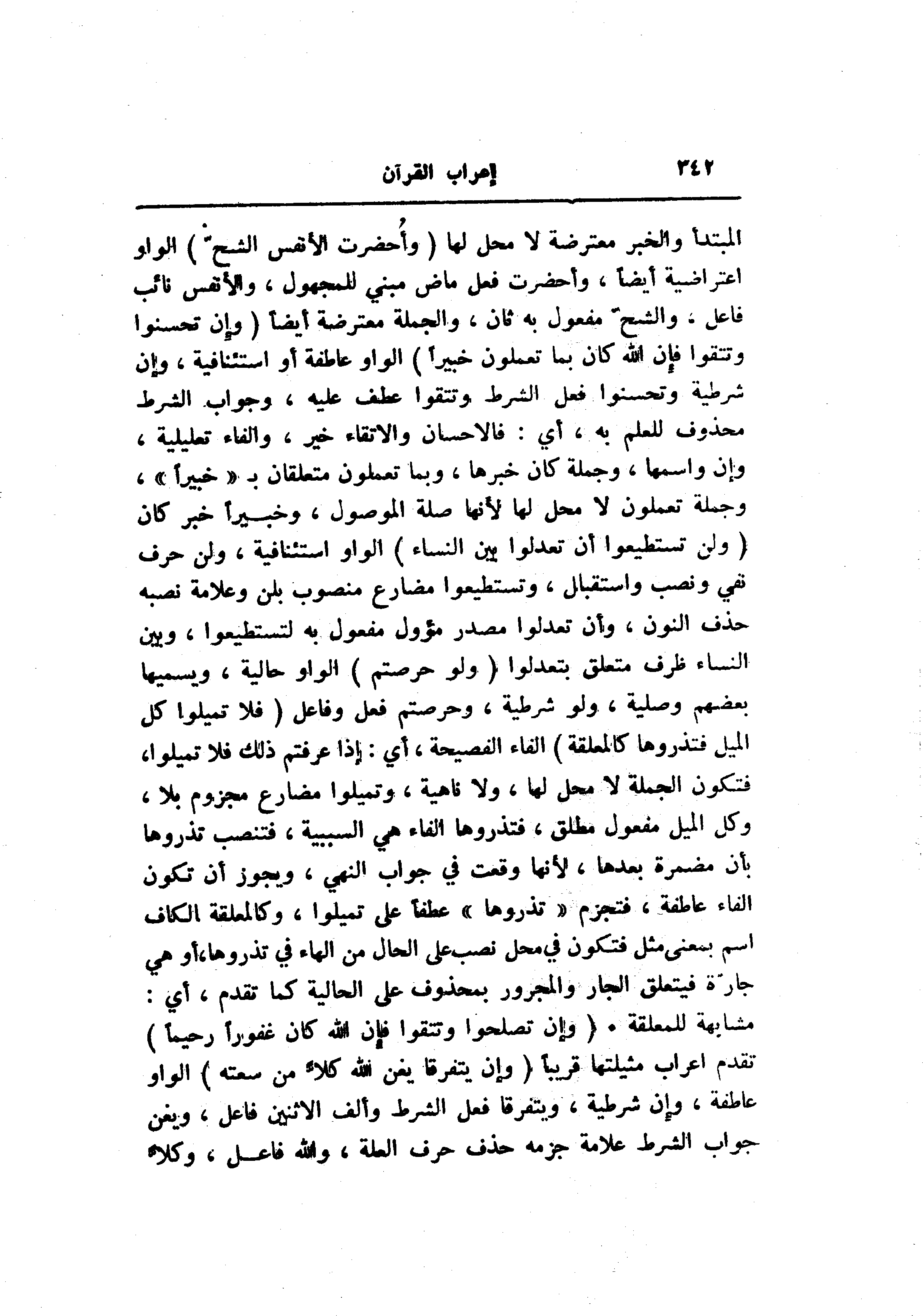 المبتدأ والخبر معترضة لا محل لها (وَأُحْضِرَتِ الْأَنْفُسُ الشُّحَّ) الواو اعتراضية أيضا، وأحضرت فعل ماض مبني للمجهول، والأنفس نائب فاعل، والشحّ مفعول به ثان، والجملة معترضة أيضا (وَإِنْ تُحْسِنُوا وَتَتَّقُوا فَإِنَّ اللَّهَ كانَ بِما تَعْمَلُونَ خَبِيراً) الواو عاطفة أو استئنافية، وإن شرطية وتحسنوا فعل الشرط وتتقوا عطف عليه، وجواب الشرط محذوف للعلم به، أي: فالاحسان والاتقاء خير، والفاء تعليلية، وإن واسمها، وجملة كان خبرها، وبما تعملون متعلقان ب «خبيرا» ، وجملة تعملون لا محل لها لأنها صلة الموصول، وخبيرا خبر كان (وَلَنْ تَسْتَطِيعُوا أَنْ تَعْدِلُوا بَيْنَ النِّساءِ) الواو استئنافية، ولن حرف نفي ونصب واستقبال، وتستطيعوا مضارع منصوب بلن وعلامة نصبه حذف النون، وأن تعدلوا مصدر مؤول مفعول به لتستطيعوا، وبين النساء ظرف متعلق بتعدلوا (وَلَوْ حَرَصْتُمْ) الواو حالية، ويسميها بعضهم وصلية، ولو شرطية، وحرصتم فعل وفاعل (فَلا تَمِيلُوا كُلَّ الْمَيْلِ فَتَذَرُوها كَالْمُعَلَّقَةِ) الفاء الفصيحة، أي: إذا عرفتم ذلك فلا تميلوا، فتكون الجملة لا محل لها، ولا ناهية، وتميلوا مضارع مجزوم بلا، وكل الميل مفعول مطلق، فتذروها الفاء هي السببية، فتنصب تذروها بأن مضمرة بعدها، لأنها وقعت في جواب النهي، ويجوز أن تكون الفاء عاطفة، فتجزم «تذروها» عطفا على تميلوا، وكالمعلقة الكاف اسم بمعنى مثل فتكون في محل نصب على الحال من الهاء في تذروها، أو هي جارّة فيتعلق الجار والمجرور بمحذوف على الحالية كما تقدم، أي: