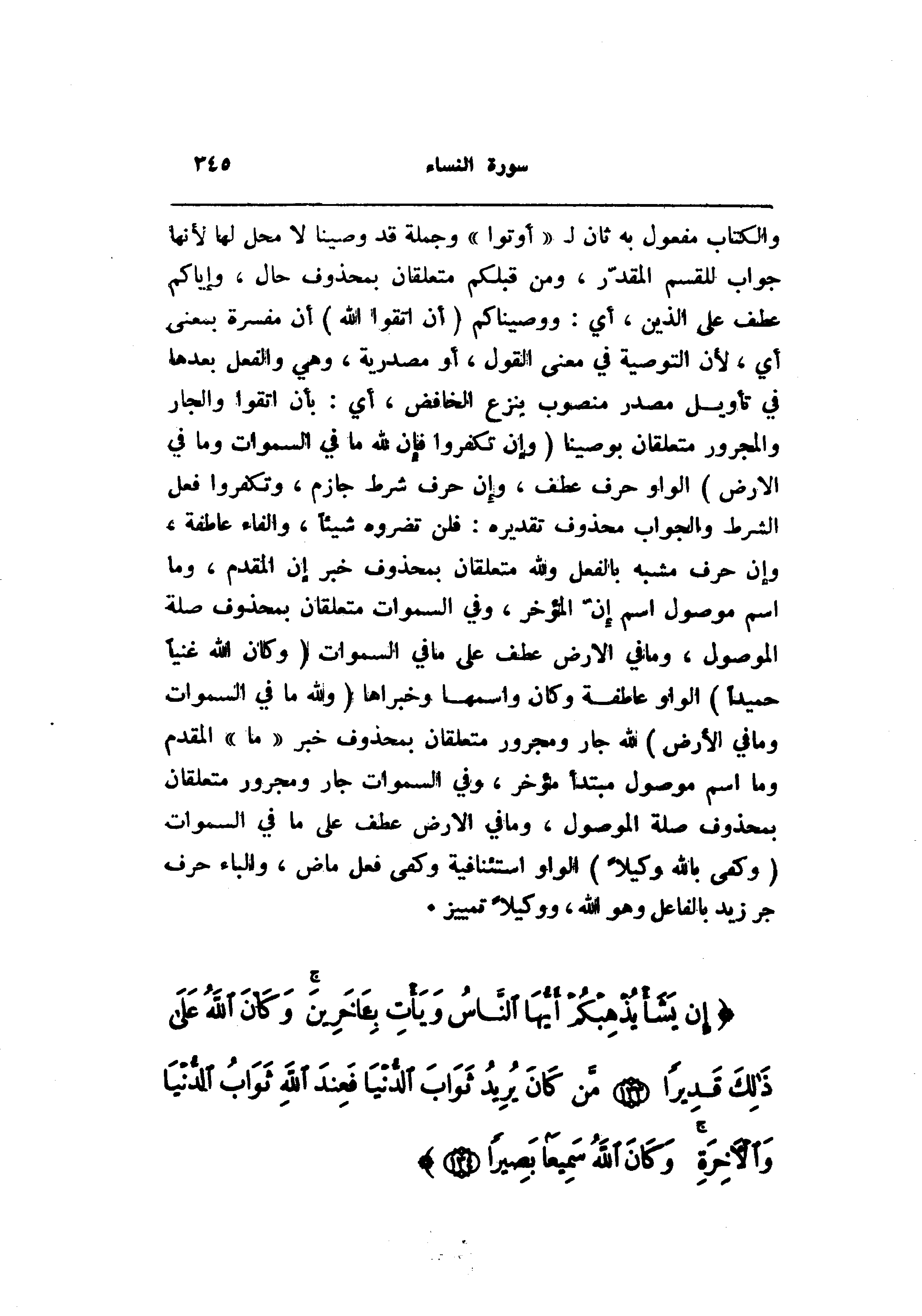 والكتاب مفعول به ثان ل «أوتوا» وجملة قد وصينا لا محل لها لأنها جواب للقسم المقدّر، ومن قبلكم متعلقان بمحذوف حال، وإياكم عطف على الذين، أي: ووصيناكم (أَنِ اتَّقُوا اللَّهَ) أن مفسرة بمعنى أي، لأن التوصية في معنى القول، أو مصدرية، وهي والفعل بعدها في تأويل مصدر منصوب بنزع الخافض، أي: بأن اتقوا والجار والمجرور متعلقان بوصينا (وَإِنْ تَكْفُرُوا فَإِنَّ لِلَّهِ ما فِي السَّماواتِ وَما فِي الْأَرْضِ) الواو حرف عطف، وإن حرف شرط جازم، وتكفروا فعل الشرط والجواب محذوف تقديره: فلن تضروه شيئا، والفاء عاطفة، وإن حرف مشبه بالفعل ولله متعلقان بمحذوف خبر إن المقدم، وما اسم موصول اسم إنّ المؤخر، وفي السموات متعلقان بمحذوف صلة الموصول، وما في الأرض عطف على ما في السموات (وَكانَ اللَّهُ غَنِيًّا حَمِيداً) الواو عاطفة وكان واسمها وخبراها (وَلِلَّهِ ما فِي السَّماواتِ وَما فِي الْأَرْضِ) الله جار ومجرور متعلقان بمحذوف خبر «ما» المقدم وما اسم موصول مبتدأ مؤخر، وفي السموات جار ومجرور متعلقان بمحذوف صلة الموصول، وما في الأرض عطف على ما في السموات (وَكَفى بِاللَّهِ وَكِيلًا) الواو استئنافية وكفى فعل ماض، والباء حرف جر زيد بالفاعل وهو الله، ووكيلا تمييز.