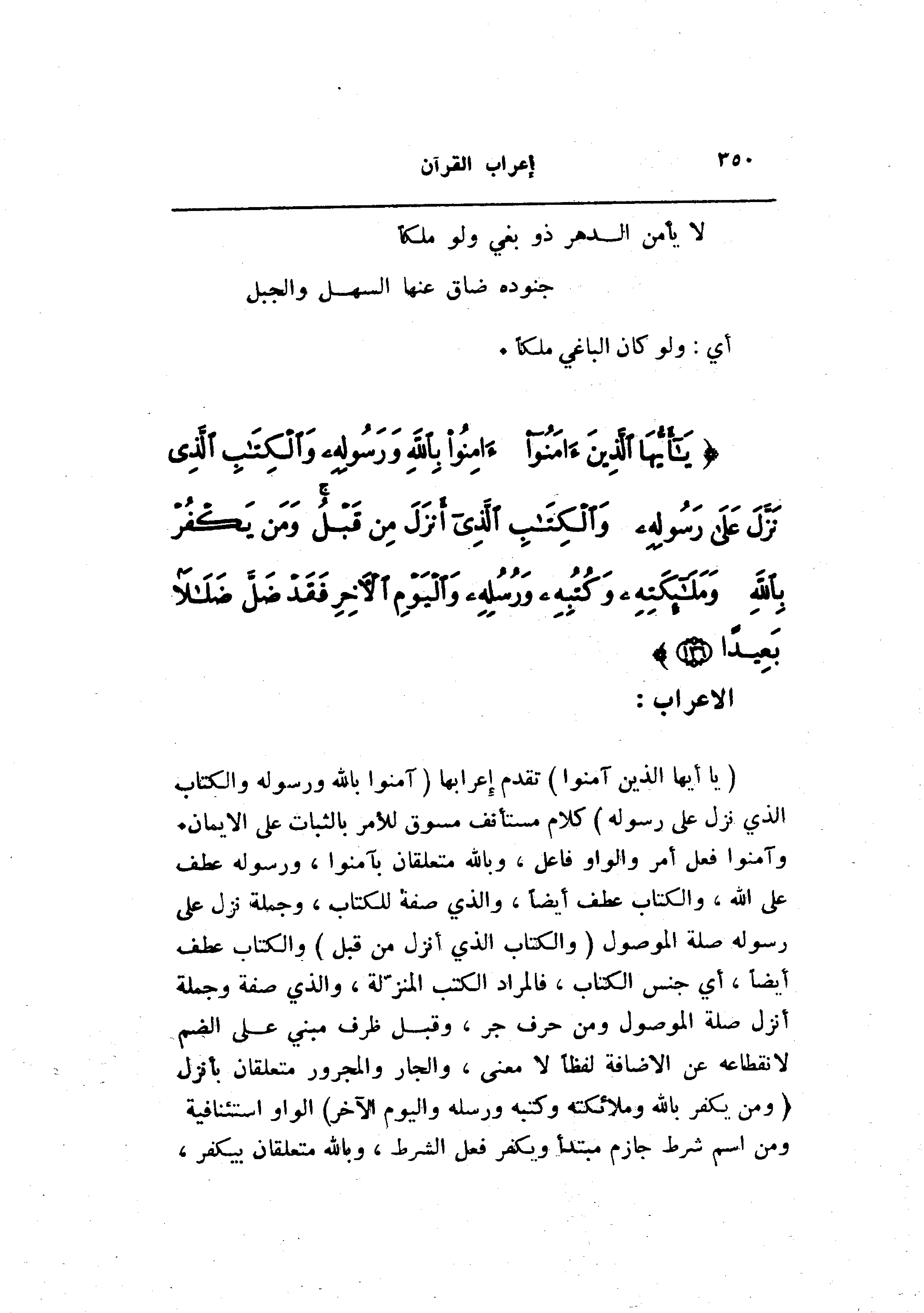 يا أَيُّهَا الَّذِينَ آمَنُوا آمِنُوا بِاللَّهِ وَرَسُولِهِ وَالْكِتابِ الَّذِي نَزَّلَ عَلى رَسُولِهِ وَالْكِتابِ الَّذِي أَنْزَلَ مِنْ قَبْلُ وَمَنْ يَكْفُرْ بِاللَّهِ وَمَلائِكَتِهِ وَكُتُبِهِ وَرُسُلِهِ وَالْيَوْمِ الْآخِرِ فَقَدْ ضَلَّ ضَلالاً بَعِيداً (136)