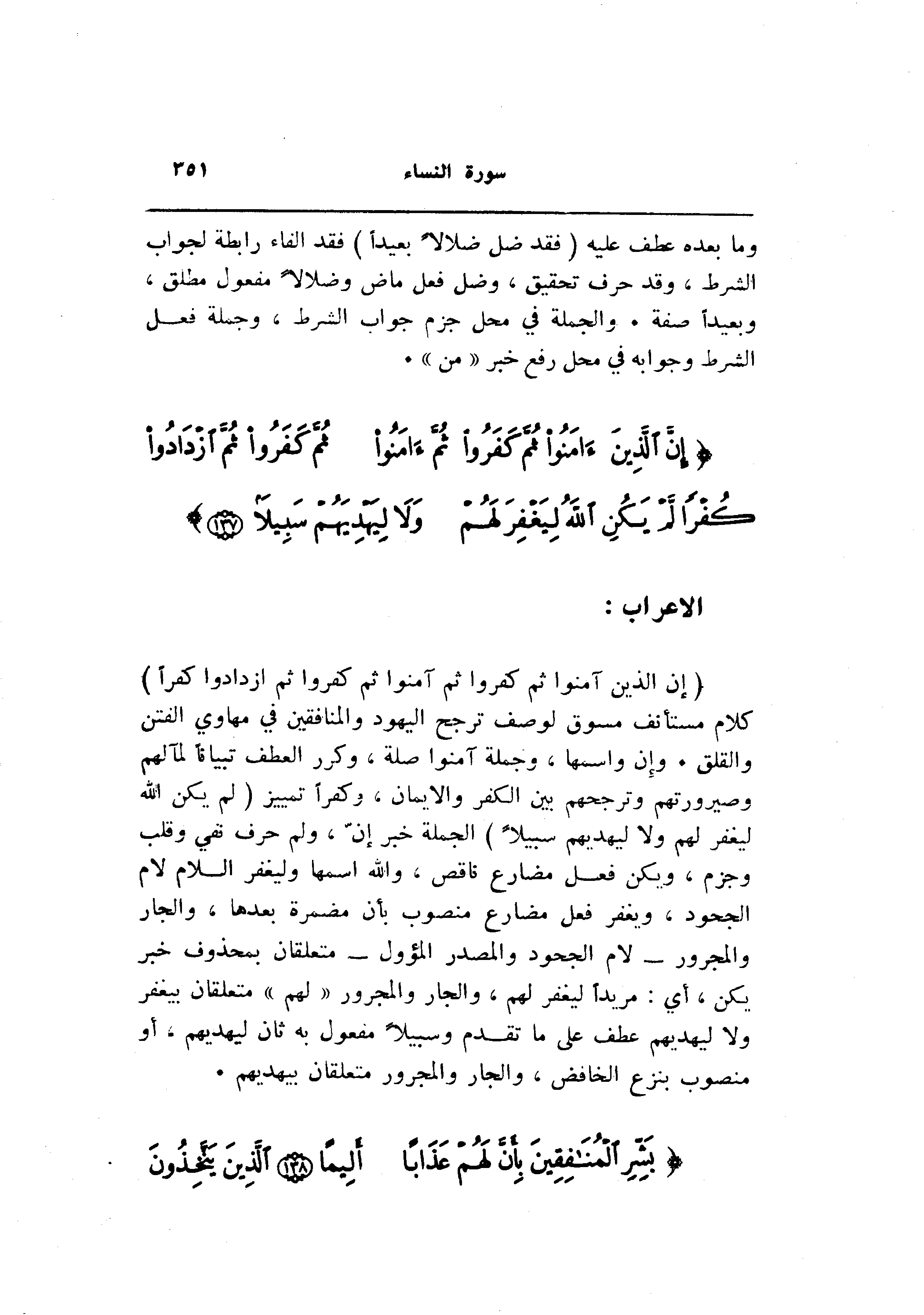 (إِنَّ الَّذِينَ آمَنُوا ثُمَّ كَفَرُوا ثُمَّ آمَنُوا ثُمَّ كَفَرُوا ثُمَّ ازْدادُوا كُفْراً) كلام مستأنف مسوق لوصف ترجح اليهود والمنافقين في مهاوي الفتن والقلق. وإن واسمها، وجملة آمنوا صلة، وكرر العطف تبيانا لمآلهم وصيرورتهم وترجحهم بين الكفر والايمان، وكفرا تمييز (لَمْ يَكُنِ اللَّهُ لِيَغْفِرَ لَهُمْ وَلا لِيَهْدِيَهُمْ سَبِيلًا) الجملة خبر إنّ، ولم حرف نفي وقلب وجزم، ويكن فعل مضارع ناقص، والله اسمها وليغفر اللام لام الجحود، ويغفر فعل مضارع منصوب بأن مضمرة بعدها، والجار والمجرور- لام الجحود والمصدر المؤول- متعلقان بمحذوف خبر يكن، أي: مريدا ليغفر لهم، والجار والمجرور «لهم» متعلقان بيغفر ولا ليهديهم عطف على ما تقدم وسبيلا مفعول به ثان ليهديهم، أو منصوب بنزع الخافض، والجار والمجرور متعلقان بيهديهم.