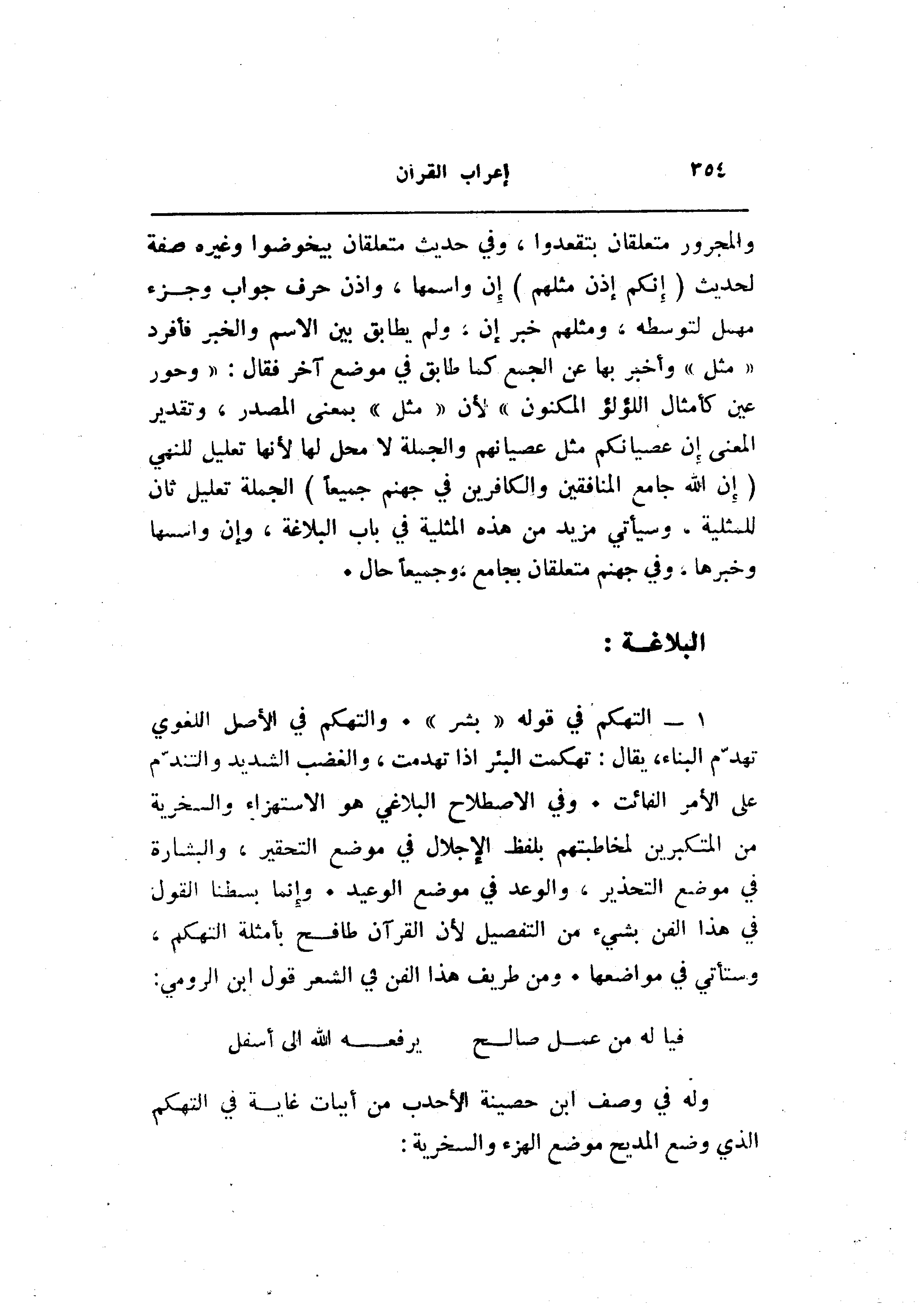 1- التهكم في قوله «بشر» . والتهكم في الأصل اللغوي تهدّم البناء، يقال: تهكمت البئر إذا تهدمت، والغضب الشديد والتندّم على الأمر الفائت. وفي الاصطلاح البلاغي هو الاستهزاء والسخرية من المتكبرين لمخاطبتهم بلفظ الإجلال في موضع التحقير، والبشارة في موضع التحذير، والوعد في موضع الوعيد. وإنما بسطنا القول في هذا الفن بشيء من التفصيل لأن القرآن طافح بأمثلة التهكم، وستأتي في مواضعها. ومن طريف هذا الفن في الشعر قول ابن الرومي: