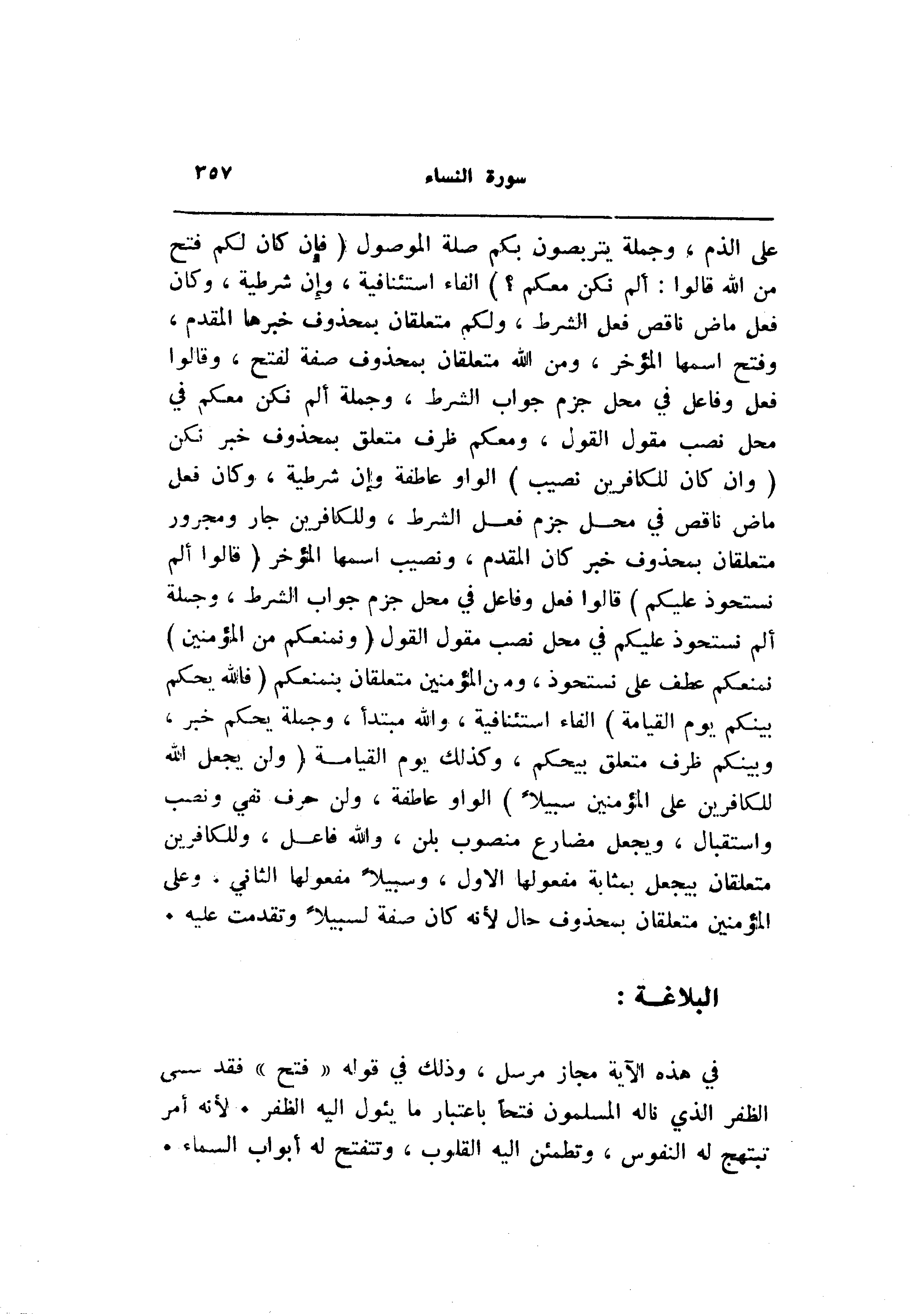 على الذم، وجملة يتربصون بكم صلة الموصول (فَإِنْ كانَ لَكُمْ فَتْحٌ مِنَ اللَّهِ قالُوا: أَلَمْ نَكُنْ مَعَكُمْ؟) الفاء استئنافية، وإن شرطية، وكان فعل ماض ناقص فعل الشرط، ولكم متعلقان بمحذوف خبرها المقدم، وفتح اسمها المؤخر، ومن الله متعلقان بمحذوف صفة لفتح، وقالوا فعل وفاعل في محل جزم جواب الشرط، وجملة ألم نكن معكم في محل نصب مقول القول، ومعكم ظرف متعلق بمحذوف خبر نكن (وَإِنْ كانَ لِلْكافِرِينَ نَصِيبٌ) الواو عاطفة وإن شرطية، وكان فعل ماض ناقص في محل جزم فعل الشرط، وللكافرين جار ومجرور متعلقان بمحذوف خبر كان المقدم، ونصيب اسمها المؤخر (قالُوا أَلَمْ نَسْتَحْوِذْ عَلَيْكُمْ) قالوا فعل وفاعل في محل جزم جواب الشرط، وجملة ألم نستحوذ عليكم في محل نصب مقول القول (وَنَمْنَعْكُمْ مِنَ الْمُؤْمِنِينَ) نمنعكم عطف على نستحوذ، ومن المؤمنين متعلقان بنمنعكم (فَاللَّهُ يَحْكُمُ بَيْنَكُمْ يَوْمَ الْقِيامَةِ) الفاء استئنافية، والله مبتدأ، وجملة يحكم خبر، وبينكم ظرف متعلق بيحكم، وكذلك يوم القيامة (وَلَنْ يَجْعَلَ اللَّهُ لِلْكافِرِينَ عَلَى الْمُؤْمِنِينَ سَبِيلًا) الواو عاطفة، ولن حرف نفي ونصب واستقبال، ويجعل مضارع منصوب بلن، والله فاعل، وللكافرين متعلقان بيجعل بمثابة مفعولها الاول، وسبيلا مفعولها الثاني. وعلى المؤمنين متعلقان بمحذوف حال لأنه كان صفة لسبيلا وتقدمت عليه.