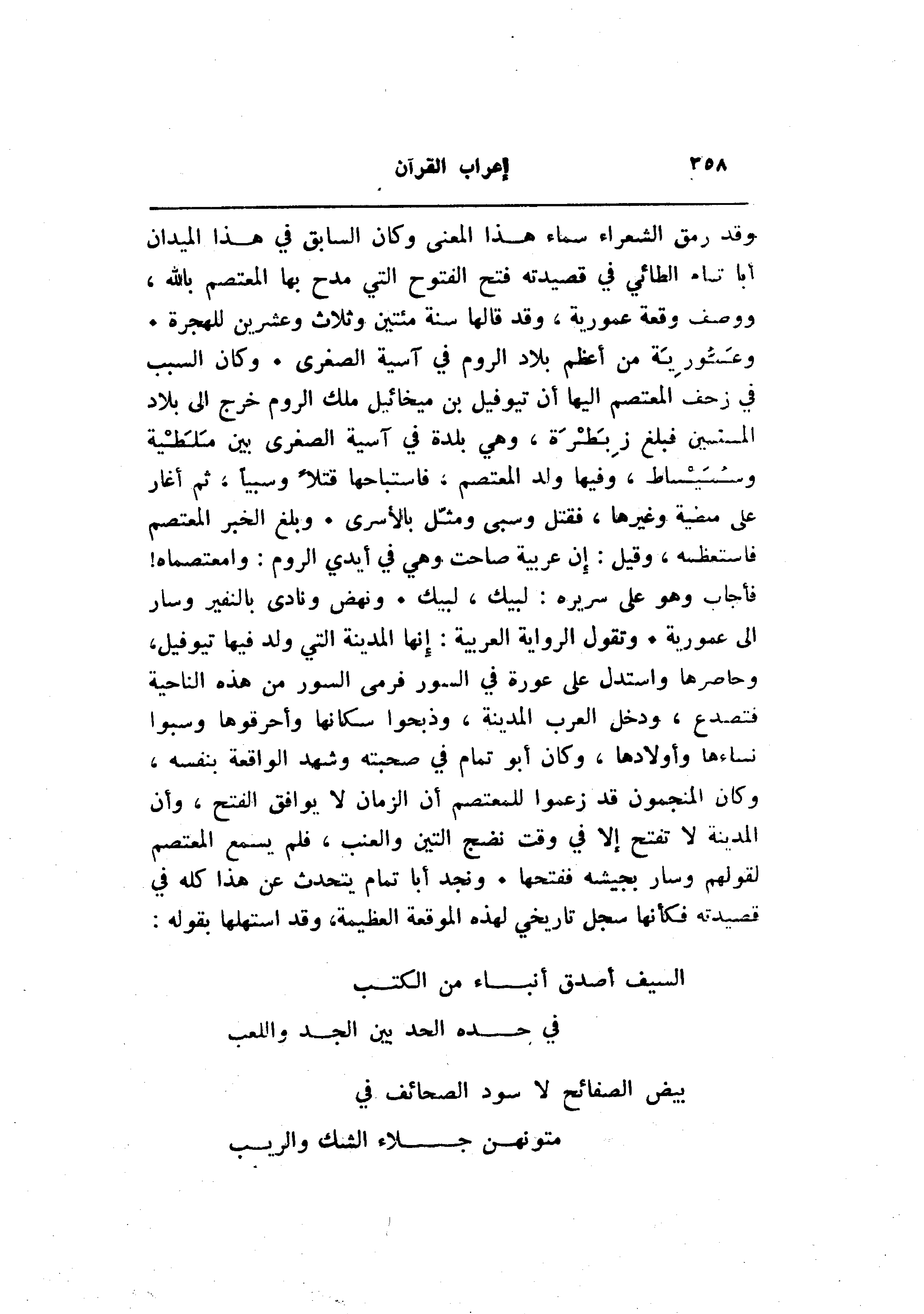 وعمّورية من أعظم بلاد الروم في آسية الصغرى. وكان السبب في زحف المعتصم إليها أن تيوفيل بن ميخائيل ملك الروم خرج الى بلاد المسلمين فبلغ زبطرة، وهي بلدة في آسية الصغرى بين ملطية وسميساط، وفيها ولد المعتصم، فاستباحها قتلا وسبيا، ثم أغار على ملطيه وغيرها، فقتل وسبى ومثّل بالأسرى. وبلغ الخبر المعتصم فاستعظمه، وقيل: إن عربية صاحت وهي في أيدي الروم: وا معتصماه! فأجاب وهو على سريره: لبيك، لبيك. ونهض ونادى بالنفير وسار الى عمورية. وتقول الرواية العربية: إنها المدينة التي ولد فيها تيوفيل، وحاصرها واستدل على عورة في السور فرمى السور من هذه الناحية فتصدع، ودخل العرب المدينة، وذبحوا سكانها وأحرقوها وسبوا نساءها وأولادها، وكان أبو تمام في صحبته وشهد الواقعة بنفسه، وكان المنجمون قد زعموا للمعتصم أن الزمان لا يوافق الفتح، وأن المدينة لا تفتح إلا في وقت نضج التين والعنب، فلم يسمع المعتصم لقولهم وسار بجيشه ففتحها. ونجد أبا تمام يتحدث عن هذا كله في قصيدته فكأنها سجل تاريخي لهذه الموقعة العظيمة، وقد استهلها بقوله: