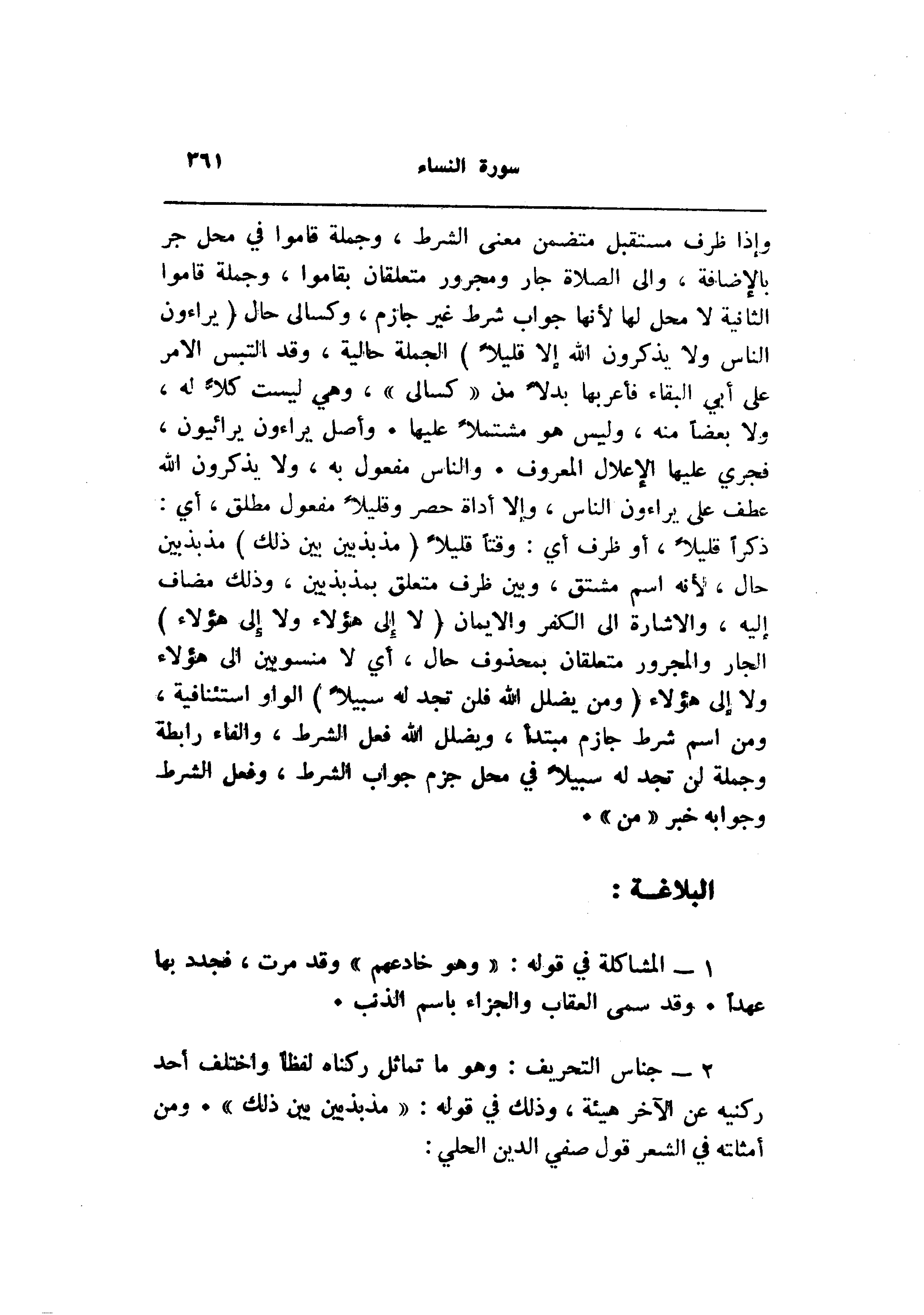 2- جناس التحريف: وهو ما تماثل ركناه لفظا واختلف أحد ركنيه عن الآخر هيئة، وذلك في قوله: «مذبذبين بين ذلك» . ومن أمثلته في الشعر قول صفي الدين الحلي:
