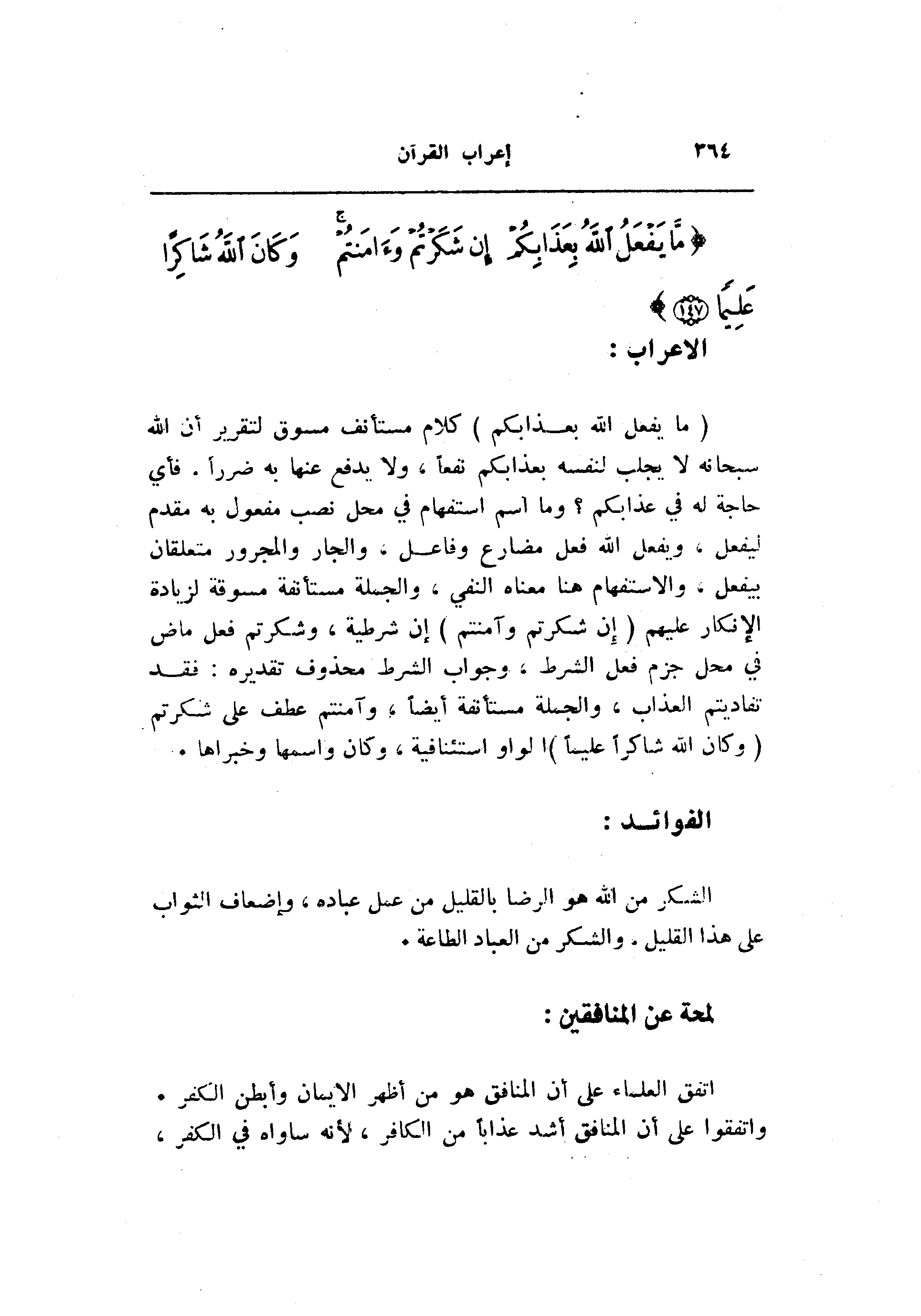 (ما يَفْعَلُ اللَّهُ بِعَذابِكُمْ) كلام مستأنف مسوق لتقرير أن الله سبحانه لا يجلب لنفسه بعذابكم نفعا، ولا يدفع عنها به ضررا. فأي حاجة له في عذابكم؟ وما اسم استفهام في محل نصب مفعول به مقدم ليفعل، ويفعل الله فعل مضارع وفاعل، والجار والمجرور متعلقان بيفعل، والاستفهام هنا معناه النفي، والجملة مستأنفة مسوقة لزيادة الإنكار عليهم (إِنْ شَكَرْتُمْ وَآمَنْتُمْ) إن شرطية، وشكرتم فعل ماض في محل جزم فعل الشرط، وجواب الشرط محذوف تقديره: فقد تفاديتم العذاب، والجملة مستأنفة أيضا، وآمنتم عطف على شكرتم (وَكانَ اللَّهُ شاكِراً عَلِيماً) الواو استئنافية، وكان واسمها وخبراها.