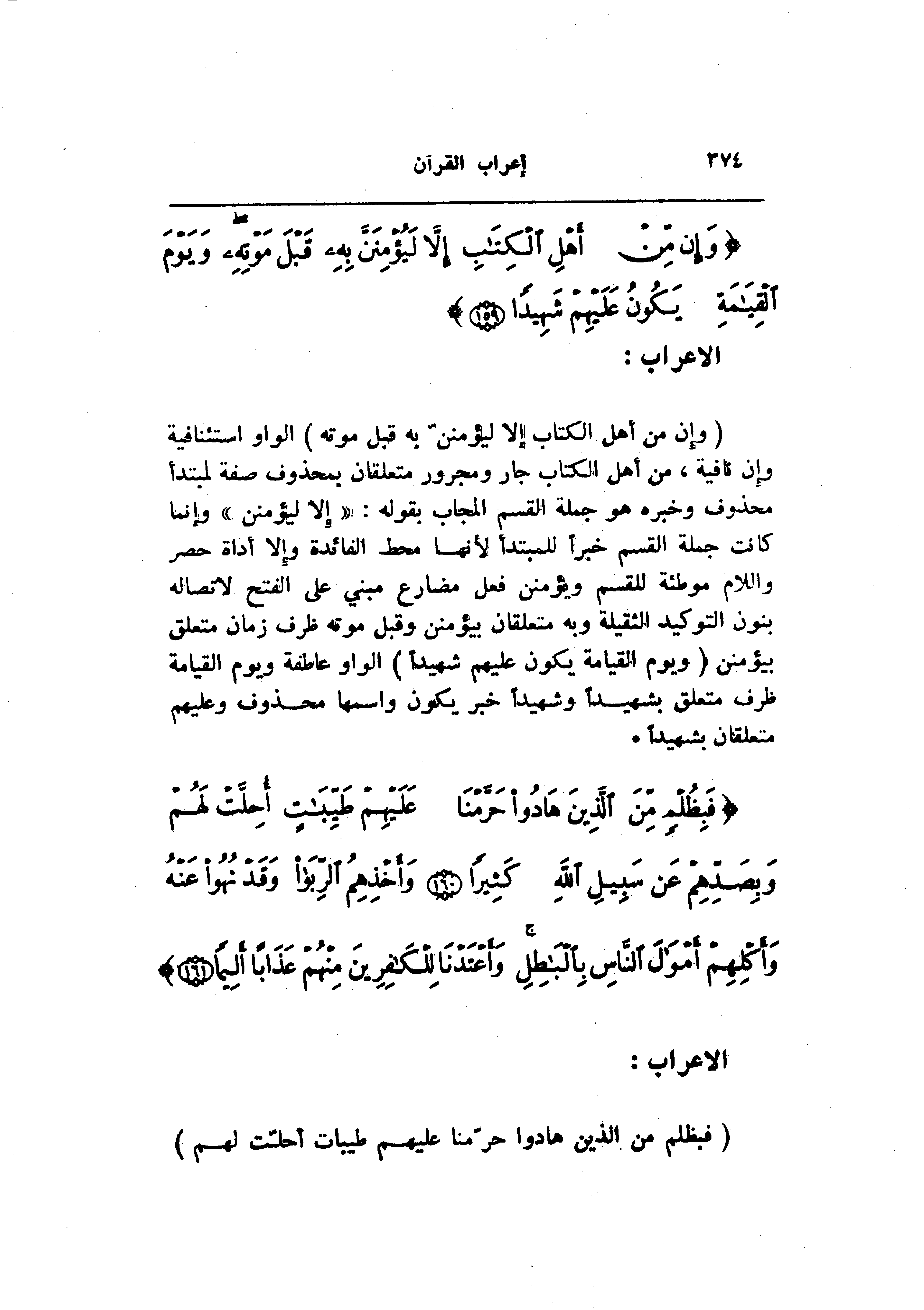 (وَإِنْ مِنْ أَهْلِ الْكِتابِ إِلَّا لَيُؤْمِنَنَّ بِهِ قَبْلَ مَوْتِهِ) الواو استئنافية وإن نافية، من أهل الكتاب جار ومجرور متعلقان بمحذوف صفة لمبتدأ محذوف وخبره هو جملة القسم المجاب بقوله: «إلا ليؤمنن» وإنما كانت جملة القسم خبرا للمبتدأ لأنها محط الفائدة وإلا أداة حصر واللام موطئة للقسم ويؤمنن فعل مضارع مبني على الفتح لاتصاله بنون التوكيد الثقيلة وبه متعلقان بيؤمنن وقبل موته ظرف زمان متعلق بيؤمنن (وَيَوْمَ الْقِيامَةِ يَكُونُ عَلَيْهِمْ شَهِيداً) الواو عاطفة ويوم القيامة ظرف متعلق بشهيدا وشهيدا خبر يكون واسمها محذوف وعليهم متعلقان بشهيدا.