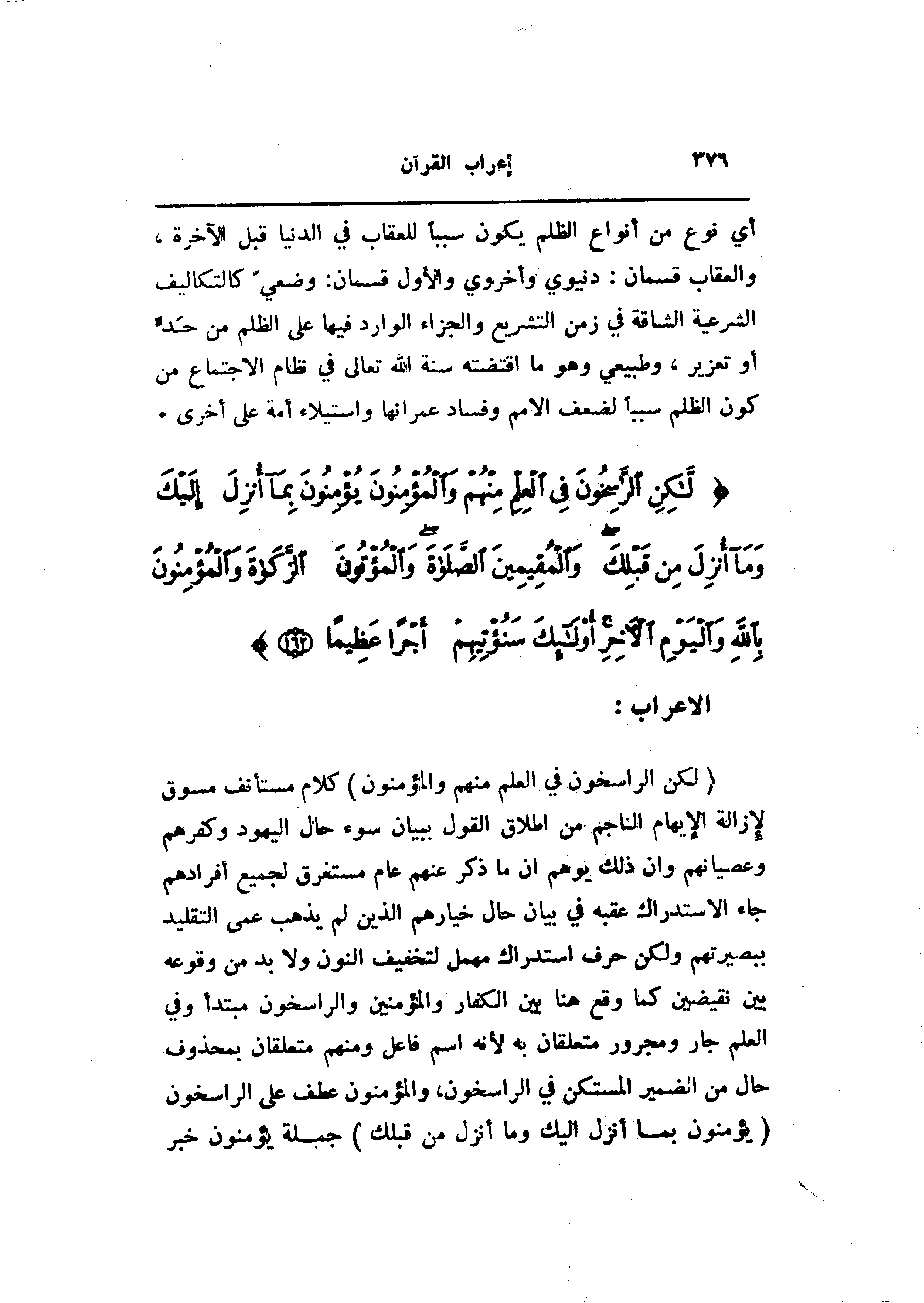 (لكِنِ الرَّاسِخُونَ فِي الْعِلْمِ مِنْهُمْ وَالْمُؤْمِنُونَ) كلام مستأنف مسوق لإزالة الإيهام الناجم من اطلاق القول ببيان سوء حال اليهود وكفرهم وعصيانهم وان ذلك يوهم ان ما ذكر عنهم عام مستغرق لجميع أفرادهم جاء الاستدراك عقبه في بيان حال خيارهم الذين لم يذهب عمى التقليد ببصيرتهم ولكن حرف استدراك مهمل لتخفيف النون ولا بد من وقوعه بين نقيضين كما وقع هنا بين الكفار والمؤمنين والراسخون مبتدأ وفي العلم جار ومجرور متعلقان به لأنه اسم فاعل ومنهم متعلقان بمحذوف حال من الضمير المستكن في الراسخون، والمؤمنون عطف على الراسخون (يُؤْمِنُونَ بِما أُنْزِلَ إِلَيْكَ وَما أُنْزِلَ مِنْ قَبْلِكَ) جملة يؤمنون خبر