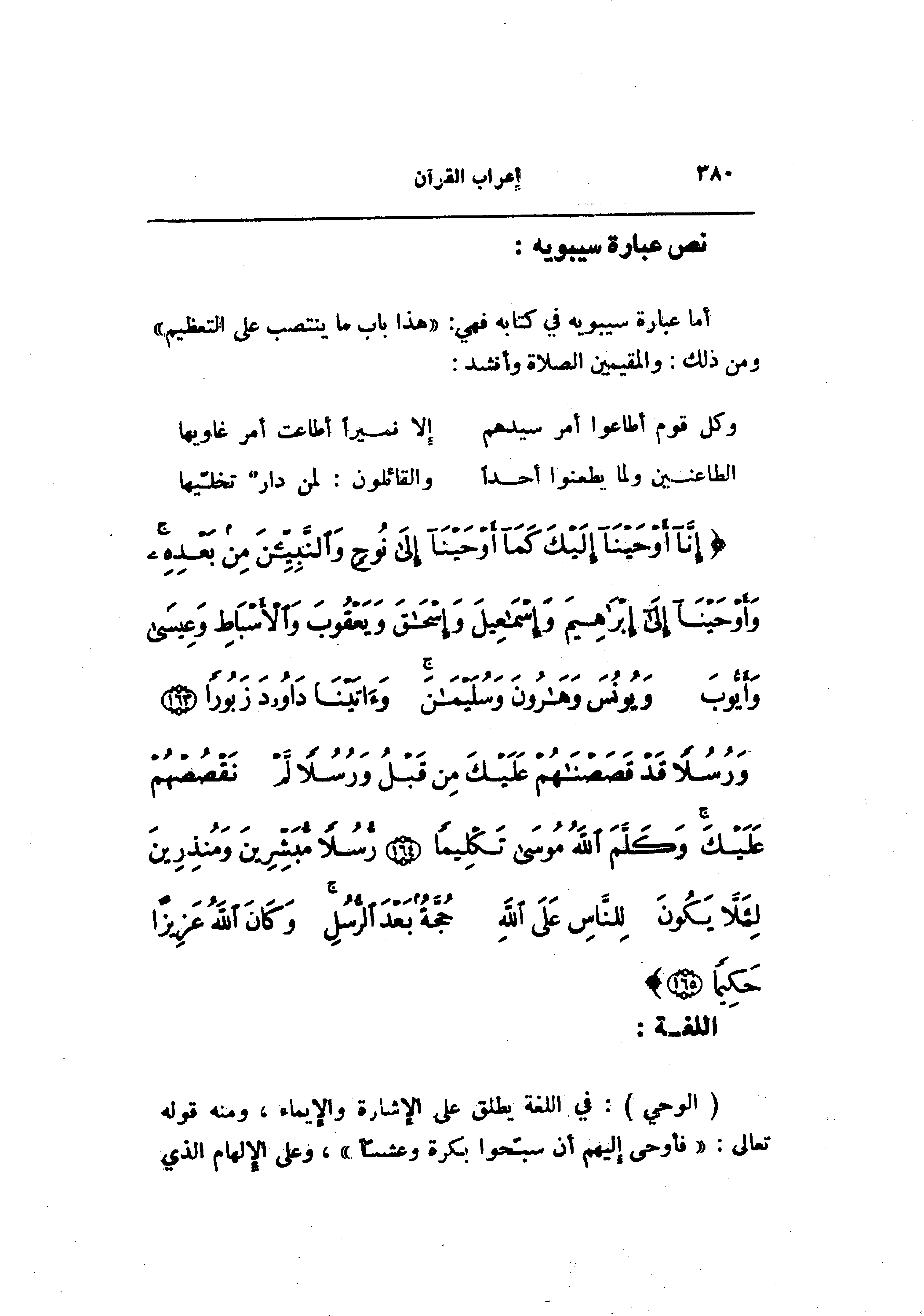 إِنَّا أَوْحَيْنا إِلَيْكَ كَما أَوْحَيْنا إِلى نُوحٍ وَالنَّبِيِّينَ مِنْ بَعْدِهِ وَأَوْحَيْنا إِلى إِبْراهِيمَ وَإِسْماعِيلَ وَإِسْحاقَ وَيَعْقُوبَ وَالْأَسْباطِ وَعِيسى وَأَيُّوبَ وَيُونُسَ وَهارُونَ وَسُلَيْمانَ وَآتَيْنا داوُدَ زَبُوراً (163) وَرُسُلاً قَدْ قَصَصْناهُمْ عَلَيْكَ مِنْ قَبْلُ وَرُسُلاً لَمْ نَقْصُصْهُمْ عَلَيْكَ وَكَلَّمَ اللَّهُ مُوسى تَكْلِيماً (164) رُسُلاً مُبَشِّرِينَ وَمُنْذِرِينَ لِئَلاَّ يَكُونَ لِلنَّاسِ عَلَى اللَّهِ حُجَّةٌ بَعْدَ الرُّسُلِ وَكانَ اللَّهُ عَزِيزاً حَكِيماً (165)