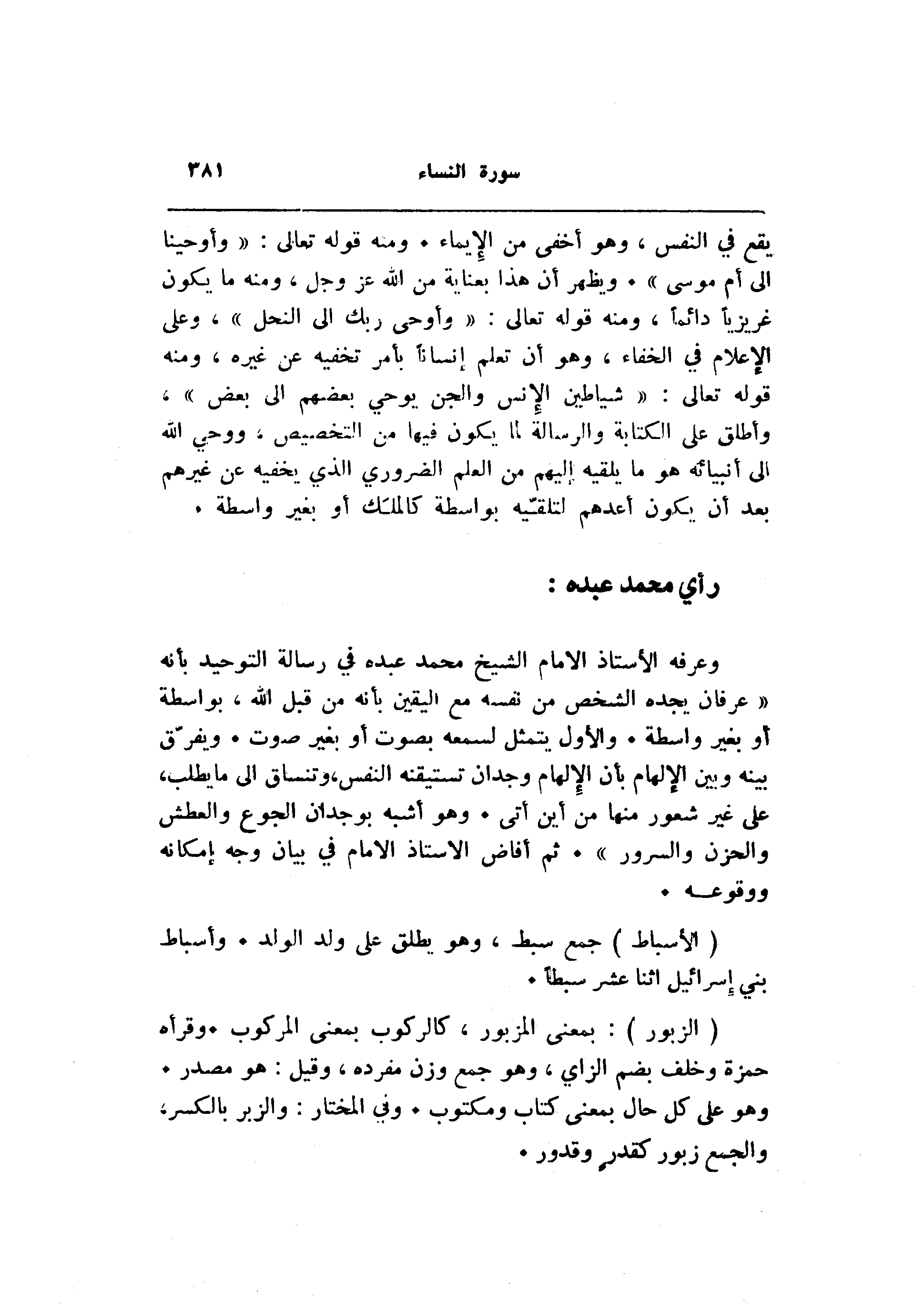 وعرفه الأستاذ الامام الشيخ محمد عبده في رسالة التوحيد بأنه «عرفان يجده الشخص من نفسه مع اليقين بأنه من قبل الله، بواسطة أو بغير واسطة. والأول يتمثل لسمعه بصوت أو بغير صوت. ويفرّق بينه وبين الإلهام بأن الإلهام وجدان تستيقنه النفس، وتنساق الى ما يطلب، على غير شعور منها من أين أتى. وهو أشبه بوجدان الجوع والعطش والحزن والسرور» . ثم أفاض الأستاذ الامام في بيان وجه إمكانه ووقوعه.