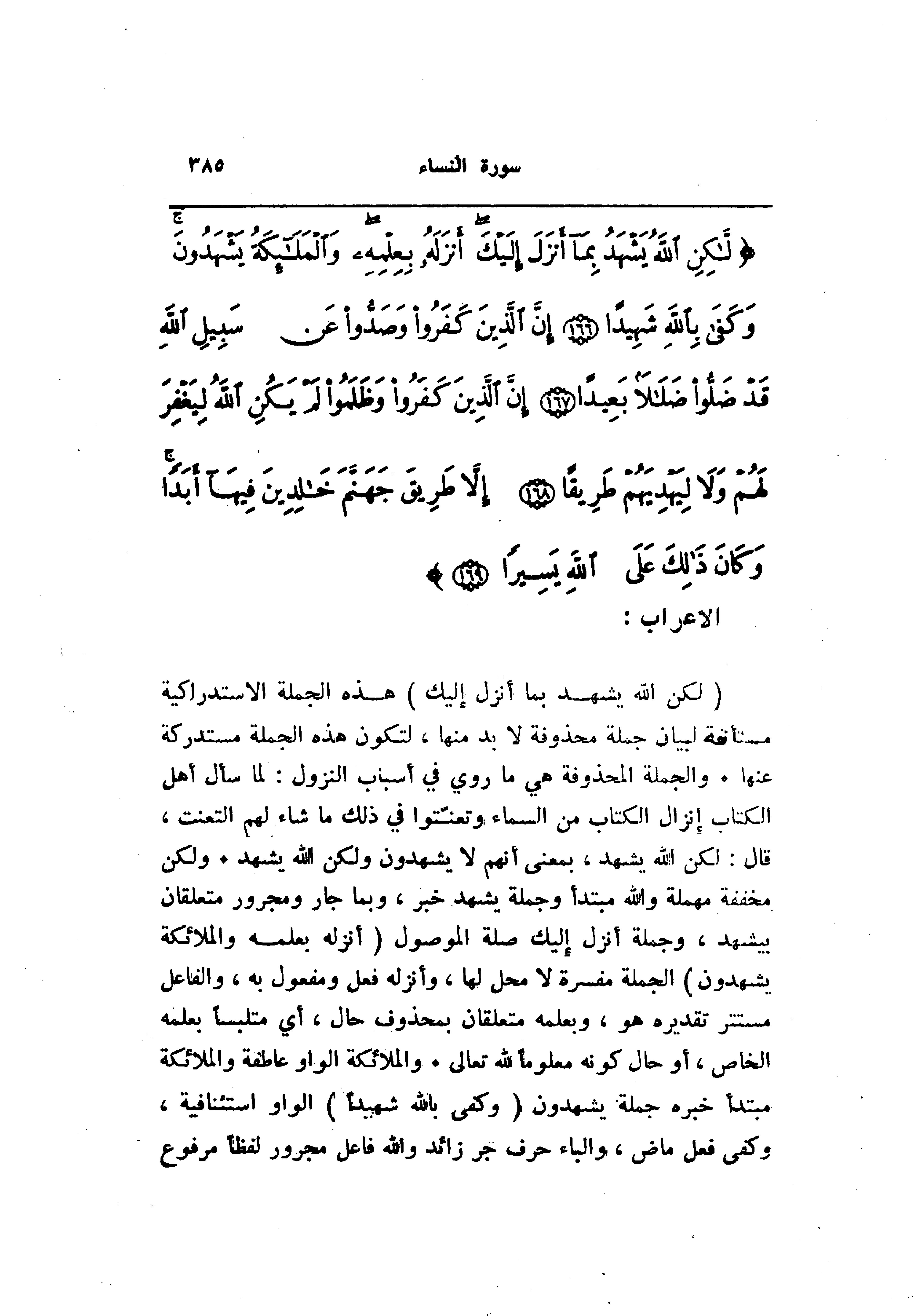 (لكِنِ اللَّهُ يَشْهَدُ بِما أَنْزَلَ إِلَيْكَ) هذه الجملة الاستدراكية مستأنفة لبيان جملة محذوفة لا بد منها، لتكون هذه الجملة مستدركة عنها. والجملة المحذوفة هي ما روي في أسباب النزول: لما سأل أهل الكتاب إنزال الكتاب من السماء وتعنّتوا في ذلك ما شاء لهم التعنت، قال: لكن الله يشهد، بمعنى أنهم لا يشهدون ولكن الله يشهد. ولكن مخففة مهملة والله مبتدأ وجملة يشهد خبر، وبما جار ومجرور متعلقان بيشهد، وجملة أنزل إليك صلة الموصول (أَنْزَلَهُ بِعِلْمِهِ وَالْمَلائِكَةُ يَشْهَدُونَ) الجملة مفسرة لا محل لها، وأنزله فعل ومفعول به، والفاعل مستتر تقديره هو، وبعلمه متعلقان بمحذوف حال، أي متلبسا بعلمه الخاص، أو حال كونه معلوما لله تعالى. والملائكة الواو عاطفة والملائكة مبتدأ خبره جملة يشهدون (وَكَفى بِاللَّهِ شَهِيداً) الواو استئنافية، وكفى فعل ماض، والباء حرف جر زائد والله فاعل مجرور لفظا مرفوع