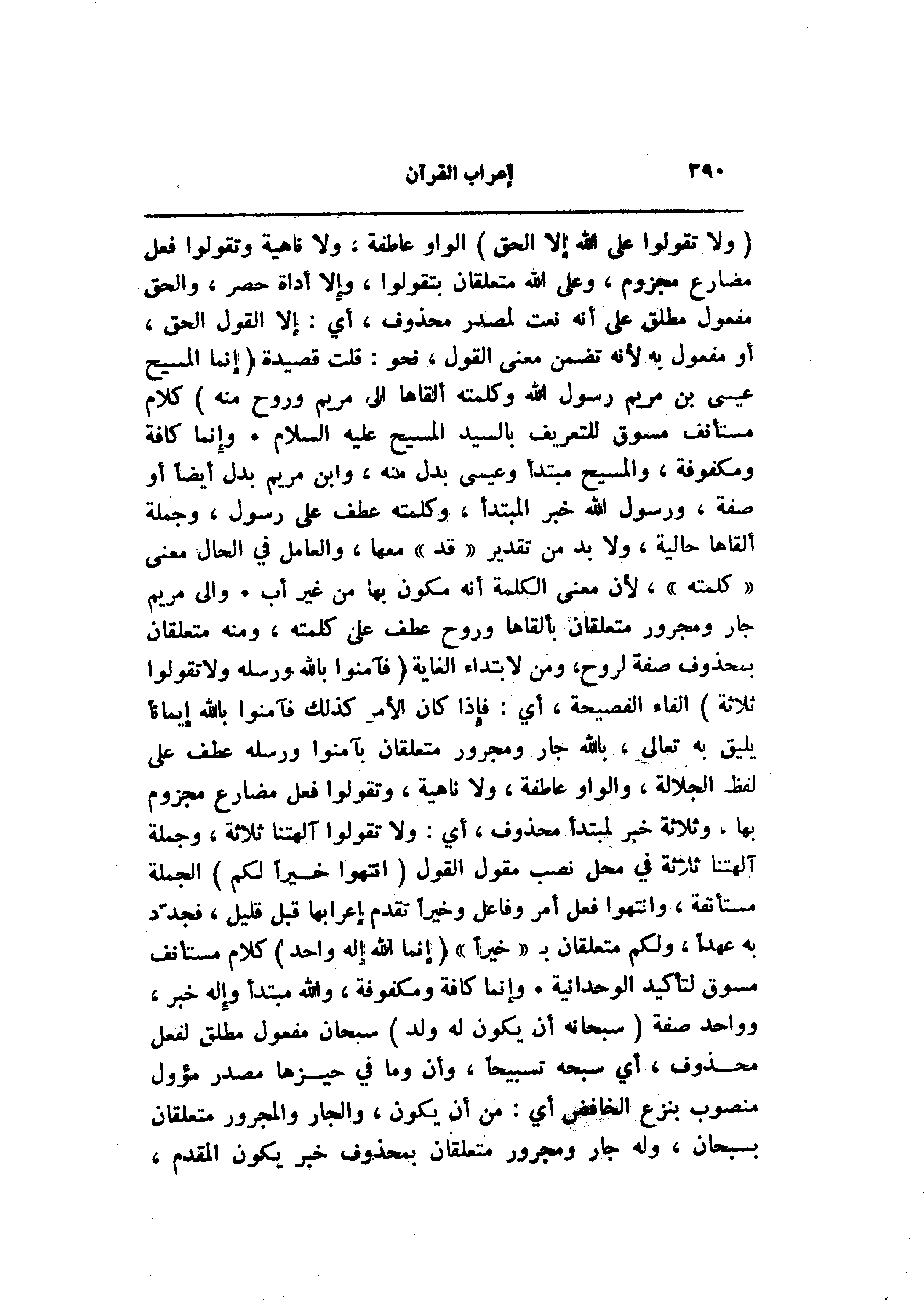 (وَلا تَقُولُوا عَلَى اللَّهِ إِلَّا الْحَقَّ) الواو عاطفة، ولا ناهية وتقولوا فعل مضارع مجزوم، وعلى الله متعلقان بتقولوا، وإلا أداة حصر، والحق مفعول مطلق على أنه نعت لمصدر محذوف، أي: إلا القول الحق، أو مفعول به لأنه تضمن معنى القول، نحو: قلت قصيدة (إِنَّمَا الْمَسِيحُ عِيسَى ابْنُ مَرْيَمَ رَسُولُ اللَّهِ وَكَلِمَتُهُ أَلْقاها إِلى مَرْيَمَ وَرُوحٌ مِنْهُ) كلام مستأنف مسوق للتعريف بالسيد المسيح عليه السلام. وإنما كافة ومكفوفة، والمسيح مبتدأ وعيسى بدل منه، وابن مريم بدل أيضا أو صفة، ورسول الله خبر المبتدأ، وكلمته عطف على رسول، وجملة ألقاها حالية، ولا بد من تقدير «قد» معها، والعامل في الحال معنى «كلمته» ، لأن معنى الكلمة أنه مكون بها من غير أب. والى مريم جار ومجرور متعلقان بألقاها وروح عطف على كلمته، ومنه متعلقان بمحذوف صفة لروح، ومن لابتداء الغاية (فَآمِنُوا بِاللَّهِ وَرُسُلِهِ وَلا تَقُولُوا ثَلاثَةٌ) الفاء الفصيحة، أي: فإذا كان الأمر كذلك فآمنوا بالله إيمانا يليق به تعالى، بالله جار ومجرور متعلقان بآمنوا ورسله عطف على لفظ الجلالة، والواو عاطفة، ولا ناهية، وتقولوا فعل مضارع مجزوم بها، وثلاثة خبر لمبتدأ محذوف، أي: ولا تقولوا آلهتنا ثلاثة، وجملة آلهتنا ثلاثة في محل نصب مقول القول (انْتَهُوا خَيْراً لَكُمْ) الجملة مستأنفة، وانتهوا فعل أمر وفاعل وخيرا تقدم إعرابها قبل قليل، فجدّد به عهدا، ولكم متعلقان ب «خيرا» (إِنَّمَا اللَّهُ إِلهٌ واحِدٌ) كلام مستأنف مسوق لتأكيد الوحدانية. وإنما كافة ومكفوفة، والله مبتدأ وإله خبر، وواحد صفة (سُبْحانَهُ أَنْ يَكُونَ لَهُ وَلَدٌ) سبحان مفعول مطلق لفعل محذوف، أي سبحه تسبيحا، وأن وما في حيزها مصدر مؤول منصوب بنزع الخافض أي: من أن يكون، والجار والمجرور متعلقان بسبحان، وله جار ومجرور متعلقان بمحذوف خبر يكون المقدم،