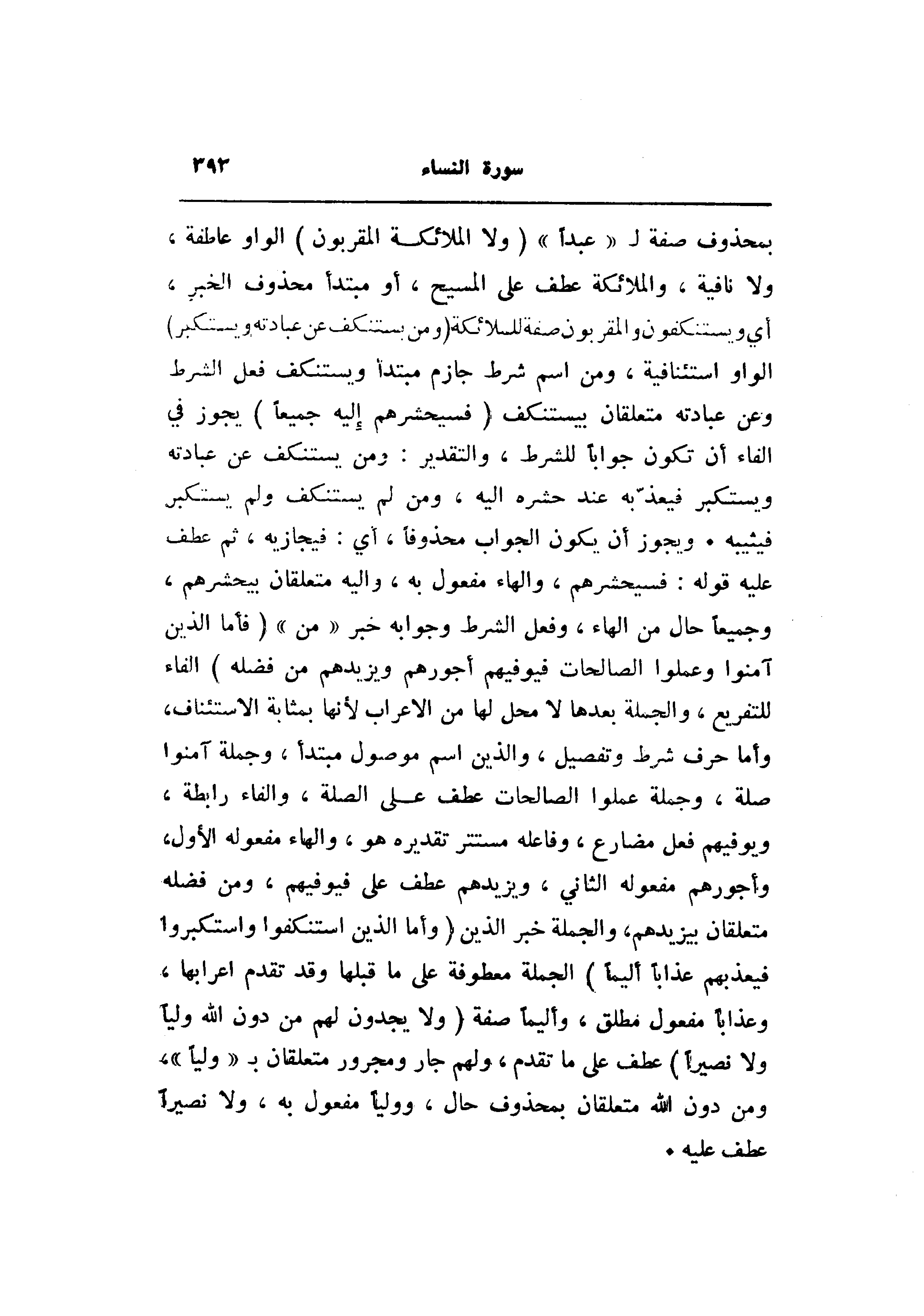 يجوز في الفاء أن تكون جوابا للشرط، والتقدير: ومن يستنكف عن عبادته ويستكبر فيعذّبه عند حشره اليه، ومن لم يستنكف ولم يستكبر فيثيبه. ويجوز أن يكون الجواب محذوفا، أي: فيجازيه، ثم عطف عليه قوله: فسيحشرهم، والهاء مفعول به، واليه متعلقان بيحشرهم، وجميعا حال من الهاء، وفعل الشرط وجوابه خبر «من» (فَأَمَّا الَّذِينَ آمَنُوا وَعَمِلُوا الصَّالِحاتِ فَيُوَفِّيهِمْ أُجُورَهُمْ وَيَزِيدُهُمْ مِنْ فَضْلِهِ) الفاء للتفريع، والجملة بعدها لا محل لها من الإعراب لأنها بمثابة الاستئناف، وأما حرف شرط وتفصيل، والذين اسم موصول مبتدأ، وجملة آمنوا صلة، وجملة عملوا الصالحات عطف على الصلة، والفاء رابطة، ويوفيهم فعل مضارع، وفاعله مستتر تقديره هو، والهاء مفعوله الأول، وأجورهم مفعوله الثاني، ويزيدهم عطف على فيوفيهم، ومن فضله متعلقان بيزيدهم، والجملة خبر الذين (وَأَمَّا الَّذِينَ اسْتَنْكَفُوا وَاسْتَكْبَرُوا فَيُعَذِّبُهُمْ عَذاباً أَلِيماً) الجملة معطوفة على ما قبلها وقد تقدم اعرابها، وعذابا مفعول مطلق، وأليما صفة (وَلا يَجِدُونَ لَهُمْ مِنْ دُونِ اللَّهِ وَلِيًّا وَلا نَصِيراً) عطف على ما تقدم، ولهم جار ومجرور متعلقان ب «وليا» ، ومن دون الله متعلقان بمحذوف حال، ووليا مفعول به، ولا نصيرا عطف عليه.