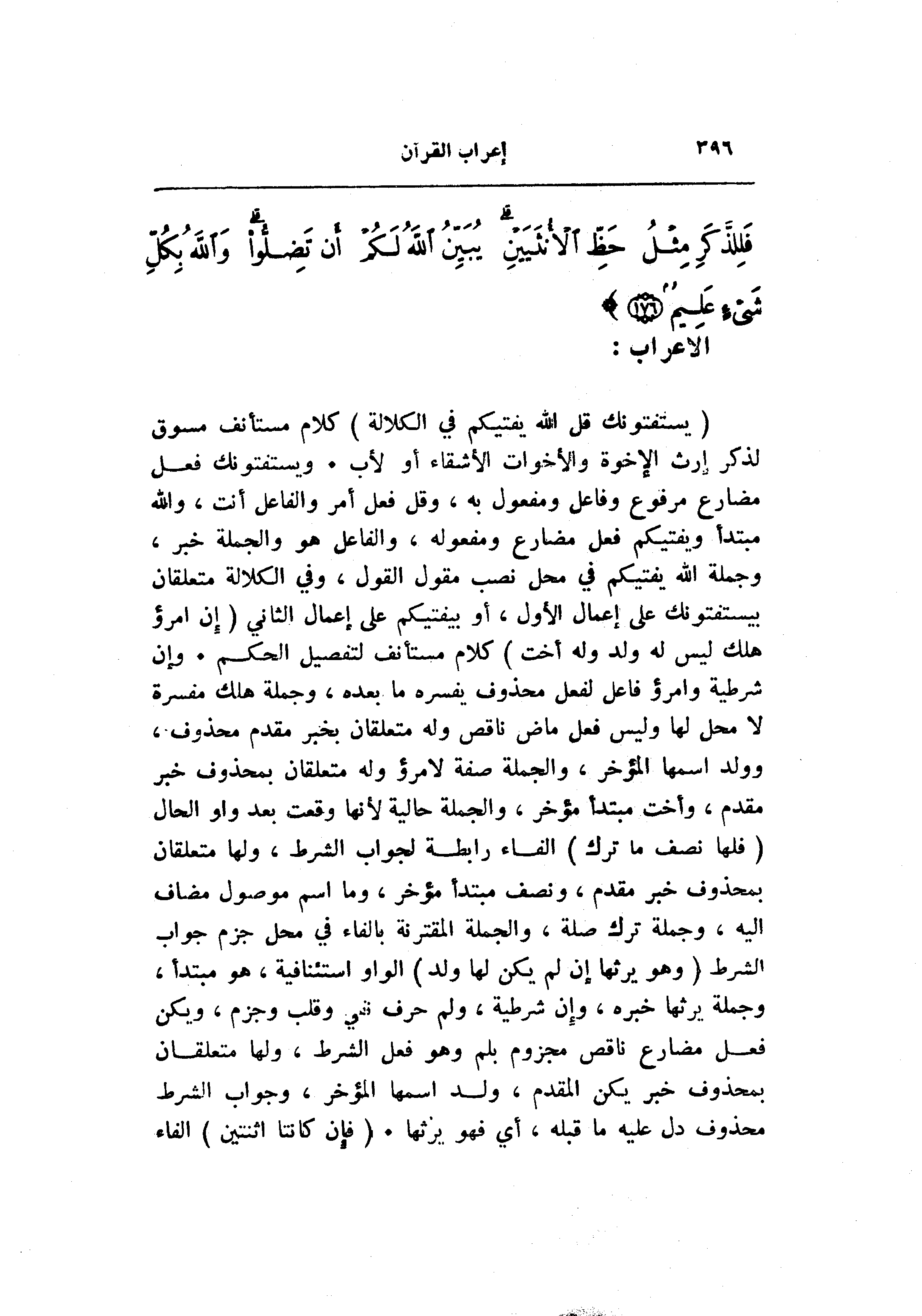 (يَسْتَفْتُونَكَ قُلِ اللَّهُ يُفْتِيكُمْ فِي الْكَلالَةِ) كلام مستأنف مسوق لذكر إرث الإخوة والأخوات الأشقاء أو لأب. ويستفتونك فعل مضارع مرفوع وفاعل ومفعول به، وقل فعل أمر والفاعل أنت، والله مبتدأ ويفتيكم فعل مضارع ومفعوله، والفاعل هو والجملة خبر، وجملة الله يفتيكم في محل نصب مقول القول، وفي الكلالة متعلقان بيستفتونك على إعمال الأول، أو بيفتيكم على إعمال الثاني (إِنِ امْرُؤٌ هَلَكَ لَيْسَ لَهُ وَلَدٌ وَلَهُ أُخْتٌ) كلام مستأنف لتفصيل الحكم. وإن شرطية وامرؤ فاعل لفعل محذوف يفسره ما بعده، وجملة هلك مفسرة لا محل لها وليس فعل ماض ناقص وله متعلقان بخبر مقدم محذوف، وولد اسمها المؤخر، والجملة صفة لامرؤ له متعلقان بمحذوف خبر مقدم، وأخت مبتدأ مؤخر، والجملة حالية لأنها وقعت بعد واو الحال (فَلَها نِصْفُ ما تَرَكَ) الفاء رابطة لجواب الشرط، ولها متعلقان بمحذوف خبر مقدم، ونصف مبتدأ مؤخر، وما اسم موصول مضاف اليه، وجملة ترك صلة، والجملة المقترنة بالفاء في محل جزم جواب الشرط (وَهُوَ يَرِثُها إِنْ لَمْ يَكُنْ لَها وَلَدٌ) الواو استئنافية، هو مبتدأ، وجملة يرثها خبره، وإن شرطية، ولم حرف نفي وقلب وجزم، ويكن فعل مضارع ناقص مجزوم بلم وهو فعل الشرط، ولها متعلقان بمحذوف خبر يكن المقدم، ولد اسمها المؤخر، وجواب الشرط محذوف دل عليه ما قبله، أي فهو يرثها. (فَإِنْ كانَتَا اثْنَتَيْنِ) الفاء