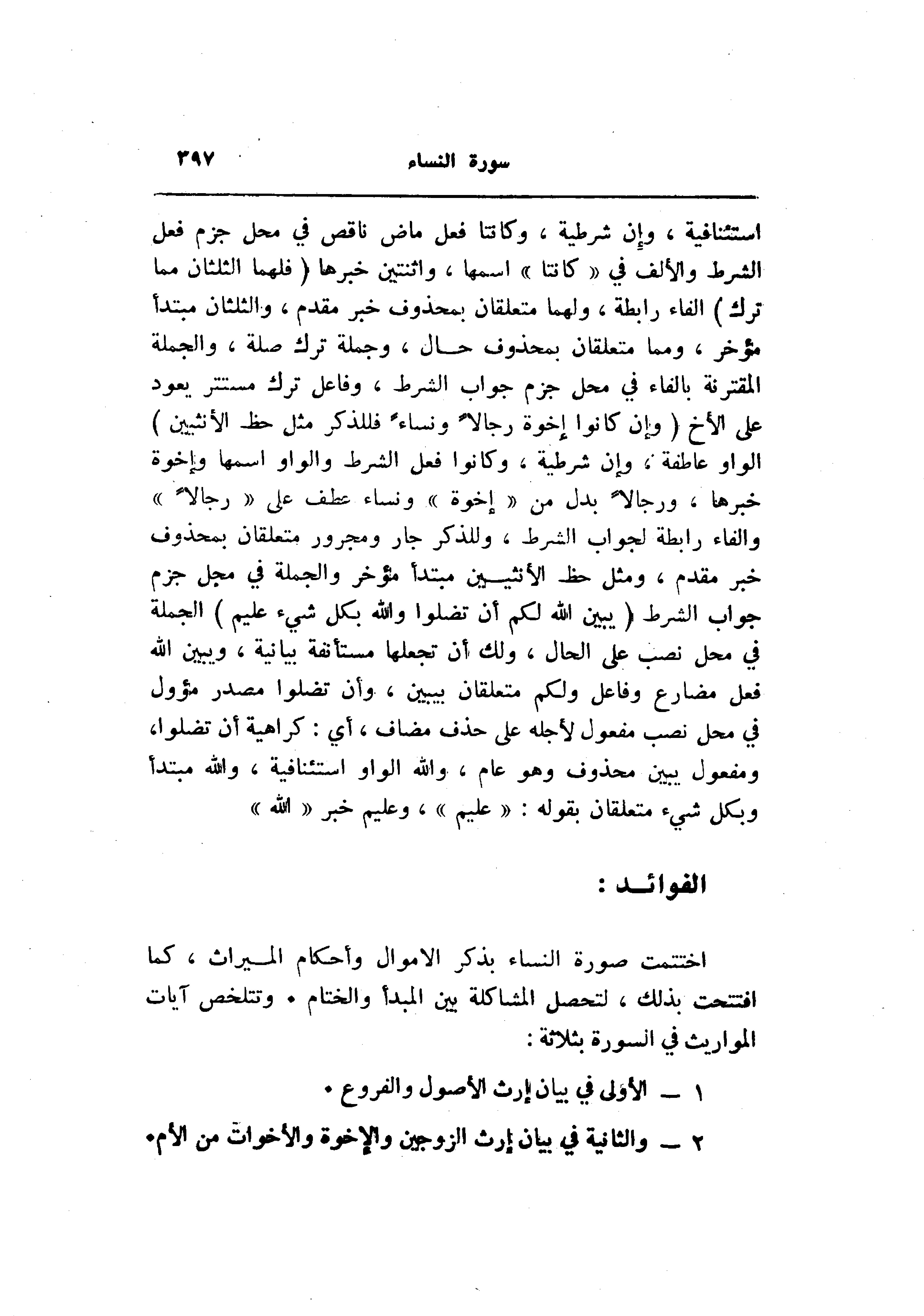 اختتمت صورة النساء بذكر الأموال وأحكام الميراث، كما افتتحت بذلك، لتحصل المشاكلة بين المبدأ والختام. وتتلخص آيات المواريث في السورة بثلاثة: