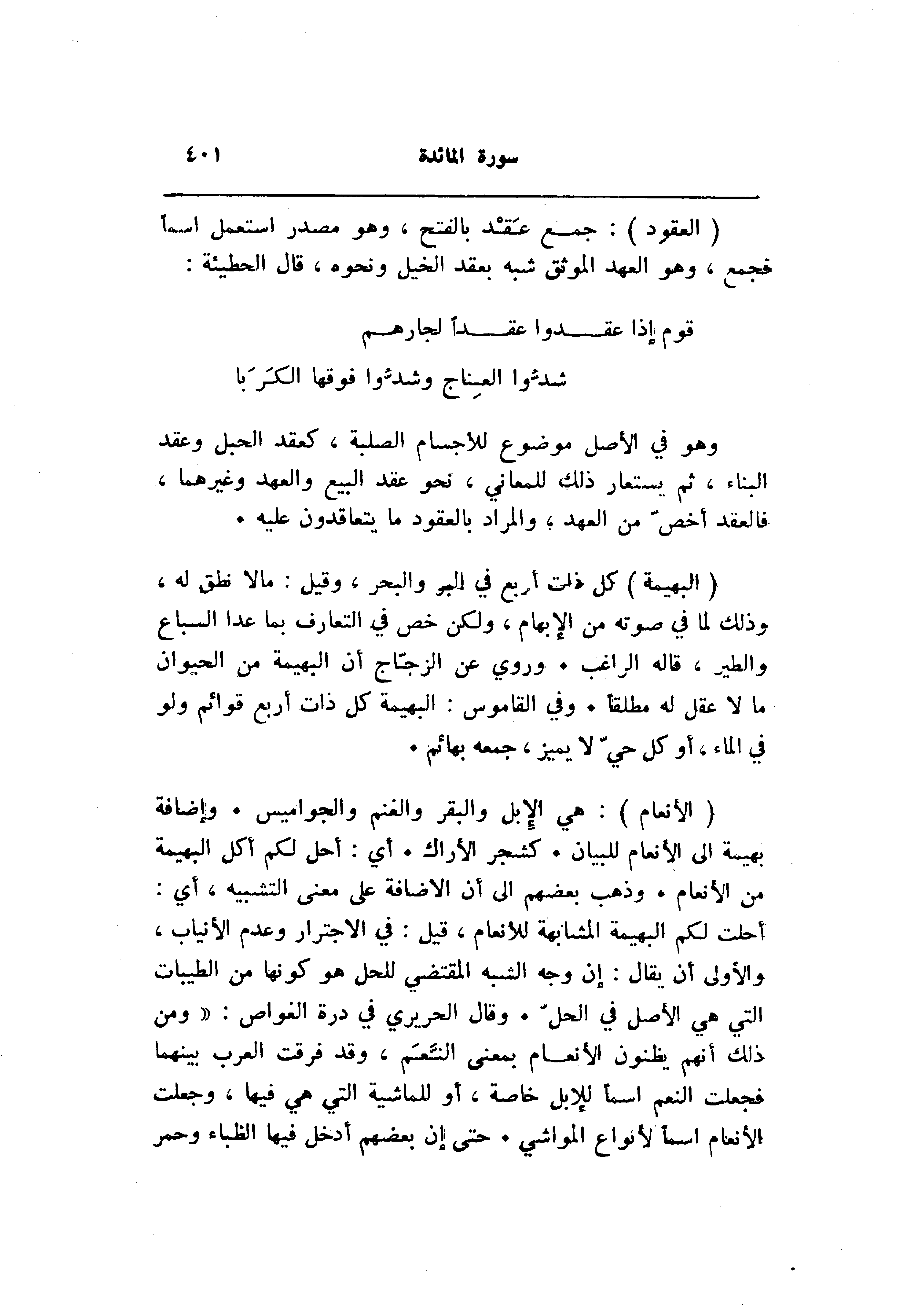 أحلت لكم البهيمة المشابهة للأنعام، قيل: في الاجترار وعدم الأنياب، والأولى أن يقال: إن وجه الشبه المقتضي للحل هو كونها من الطيبات التي هي الأصل في الحلّ. وقال الحريري في درة الغواص: «ومن ذلك أنهم يظنون الأنعام بمعنى النّعم، وقد فرقت العرب بينهما فجعلت النعم اسما للإبل خاصة، أو للماشية التي هي فيها، وجعلت الأنعام اسما لأنواع المواشي. حتى إن بعضهم أدخل فيها الظباء وحمر