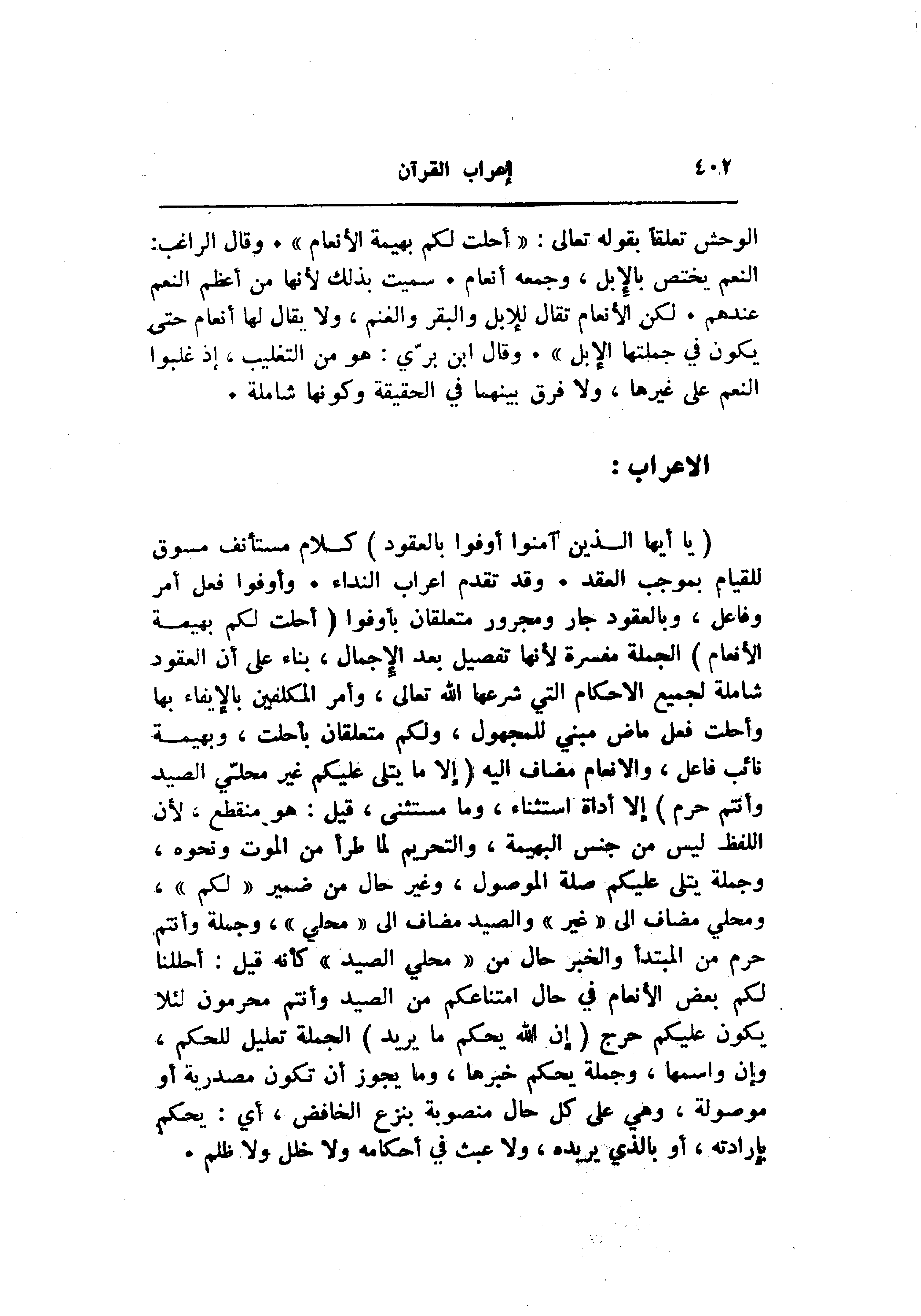 (يا أَيُّهَا الَّذِينَ آمَنُوا أَوْفُوا بِالْعُقُودِ) كلام مستأنف مسوق للقيام بموجب العقد. وقد تقدم اعراب النداء. وأوفوا فعل أمر وفاعل، وبالعقود جار ومجرور متعلقان بأوفوا (أُحِلَّتْ لَكُمْ بَهِيمَةُ الْأَنْعامِ) الجملة مفسرة لأنها تفصيل بعد الإجمال، بناء على أن العقود شاملة لجميع الاحكام التي شرعها الله تعالى، وأمر المكلفين بالإيفاء بها وأحلت فعل ماض مبني للمجهول، ولكم متعلقان بأحلت، وبهيمة نائب فاعل، والانعام مضاف اليه (إِلَّا ما يُتْلى عَلَيْكُمْ غَيْرَ مُحِلِّي الصَّيْدِ وَأَنْتُمْ حُرُمٌ) إلا أداة استثناء، وما مستثنى، قيل: هو منقطع، لأن اللفظ ليس من جنس البهيمة، والتحريم لما طرأ من الموت ونحوه، وجملة يتلى عليكم صلة الموصول، وغير حال من ضمير «لكم» ، ومحلي مضاف الى «غير» والصيد مضاف الى «محلي» ، وجملة وأنتم حرم من المبتدأ والخبر حال من «محلي الصيد» كأنه قيل: أحللنا لكم بعض الأنعام في حال امتناعكم من الصيد وأنتم محرمون لئلا يكون عليكم حرج (إِنَّ اللَّهَ يَحْكُمُ ما يُرِيدُ) الجملة تعليل للحكم، وإن واسمها، وجملة يحكم خبرها، وما يجوز أن تكون مصدرية أو موصولة، وهي على كل حال منصوبة بنزع الخافض، أي: يحكم بإرادته، أو بالذي يريده، ولا عبث في أحكامه ولا خلل ولا ظلم.