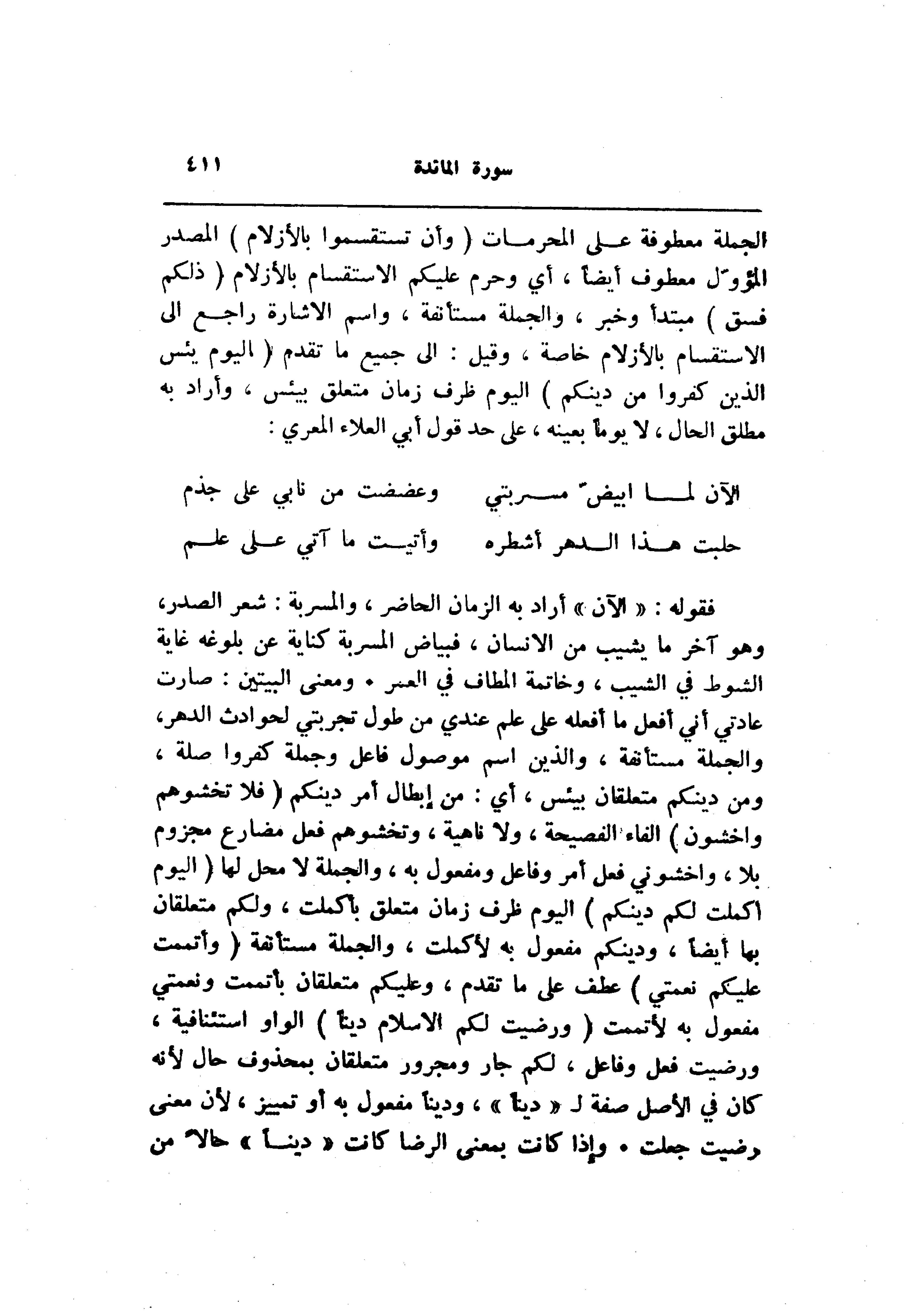 فقوله: «الآن» أراد به الزمان الحاضر، والمسربة: شعر الصدر، وهو آخر ما يشيب من الإنسان، فبياض المسربة كناية عن بلوغه غاية الشوط في الشيب، وخاتمة المطاف في العمر. ومعنى البيتين: صارت عادتي أني أفعل ما أفعله على علم عندي من طول تجربتي لحوادث الدهر، والجملة مستأنفة، والذين اسم موصول فاعل وجملة كفروا صلة، ومن دينكم متعلقان بيئس، أي: من إبطال أمر دينكم (فَلا تَخْشَوْهُمْ وَاخْشَوْنِ) الفاء الفصيحة، ولا ناهية، وتخشوهم فعل مضارع مجزوم بلا، واخشوني فعل أمر وفاعل ومفعول به، والجملة لا محل لها (الْيَوْمَ أَكْمَلْتُ لَكُمْ دِينَكُمْ) اليوم ظرف زمان متعلق بأكملت، ولكم متعلقان بها أيضا، ودينكم مفعول به لأكملت، والجملة مستأنفة (وَأَتْمَمْتُ عَلَيْكُمْ نِعْمَتِي) عطف على ما تقدم، وعليكم متعلقان بأتممت ونعمتي مفعول به لأتممت (وَرَضِيتُ لَكُمُ الْإِسْلامَ دِيناً) الواو استئنافية، ورضيت فعل وفاعل، لكم جار ومجرور متعلقان بمحذوف حال لأنه كان في الأصل صفة ل «دينا» ، ودينا مفعول به أو تمييز، لأن معنى رضيت جعلت. وإذا كانت بمعنى الرضا كانت «دينا» حالا من