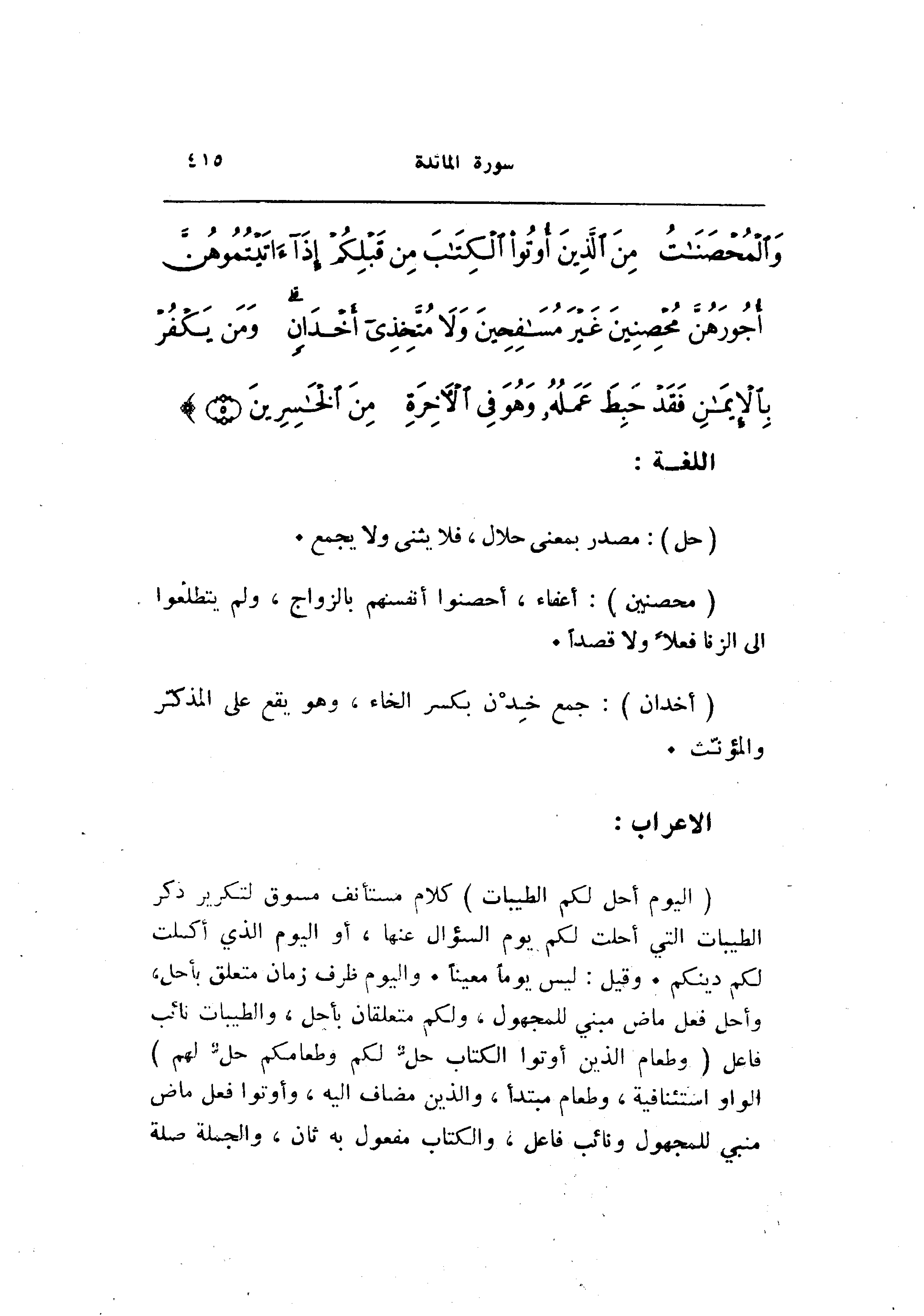 (الْيَوْمَ أُحِلَّ لَكُمُ الطَّيِّباتُ) كلام مستأنف مسوق لتكرير ذكر الطيبات التي أحلت لكم يوم السؤال عنها، أو اليوم الذي أكملت لكم دينكم. وقيل: ليس يوما معينا. واليوم ظرف زمان متعلق بأحل، وأحل فعل ماض مبني للمجهول، ولكم متعلقان بأحل، والطيبات نائب فاعل (وَطَعامُ الَّذِينَ أُوتُوا الْكِتابَ حِلٌّ لَكُمْ وَطَعامُكُمْ حِلٌّ لَهُمْ) الواو استئنافية، وطعام مبتدأ، والذين مضاف اليه، وأوتوا فعل ماض مبني للمجهول ونائب فاعل، والكتاب مفعول به ثان، والجملة صلة